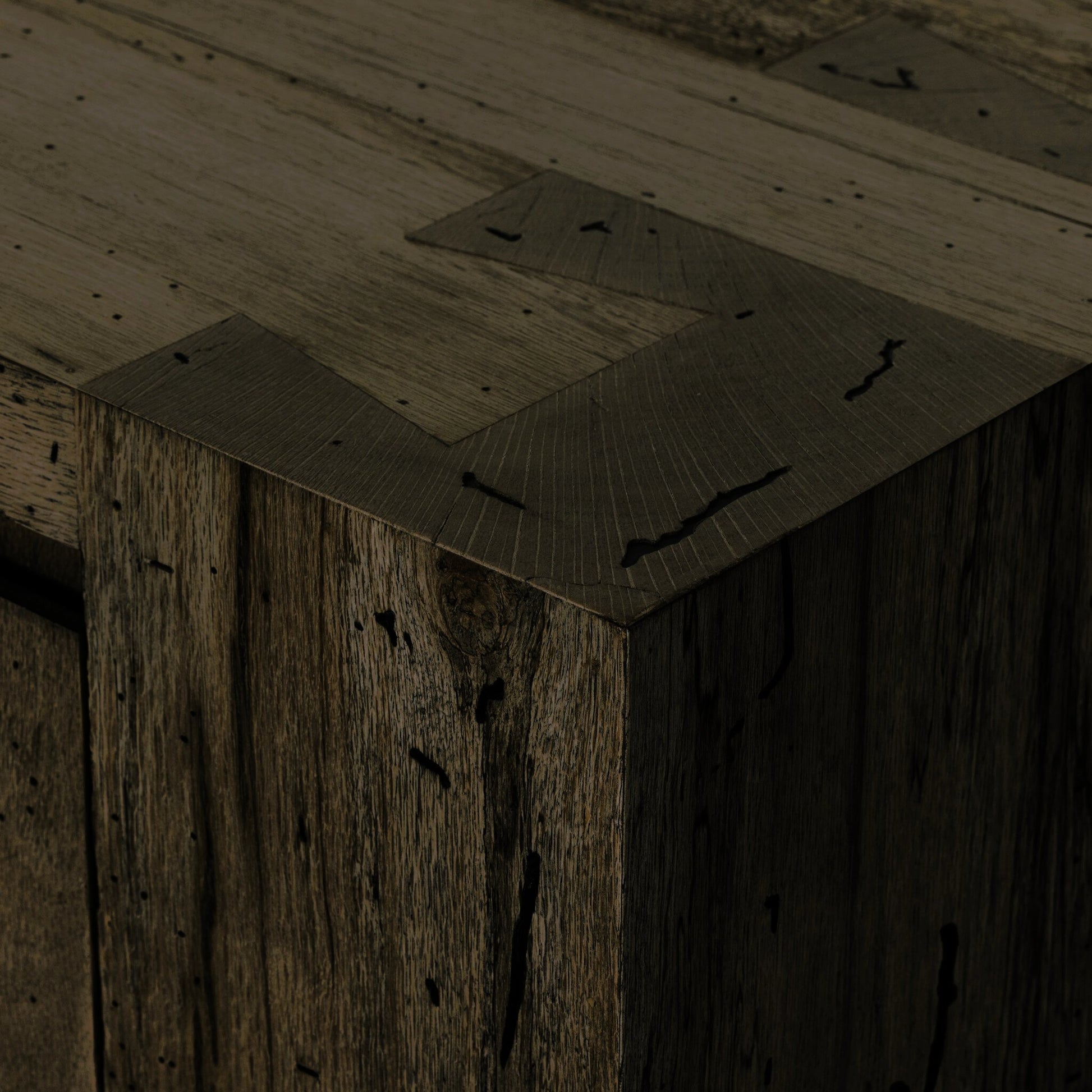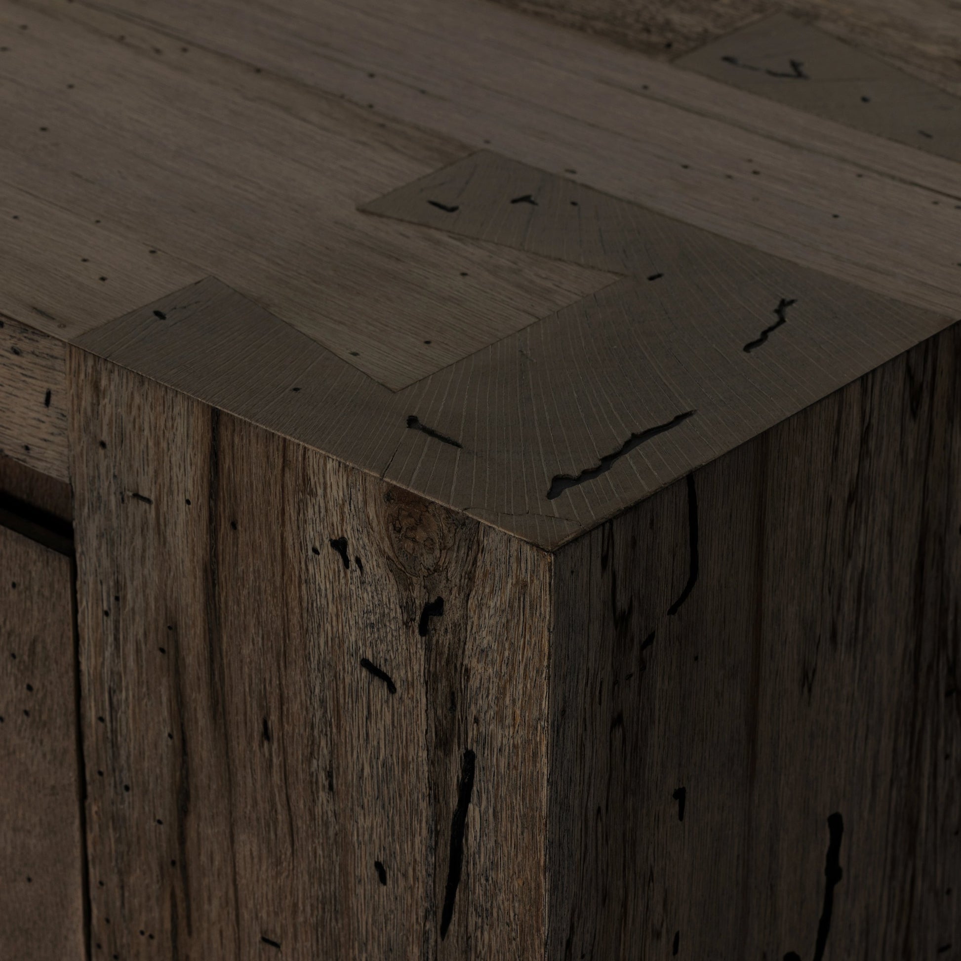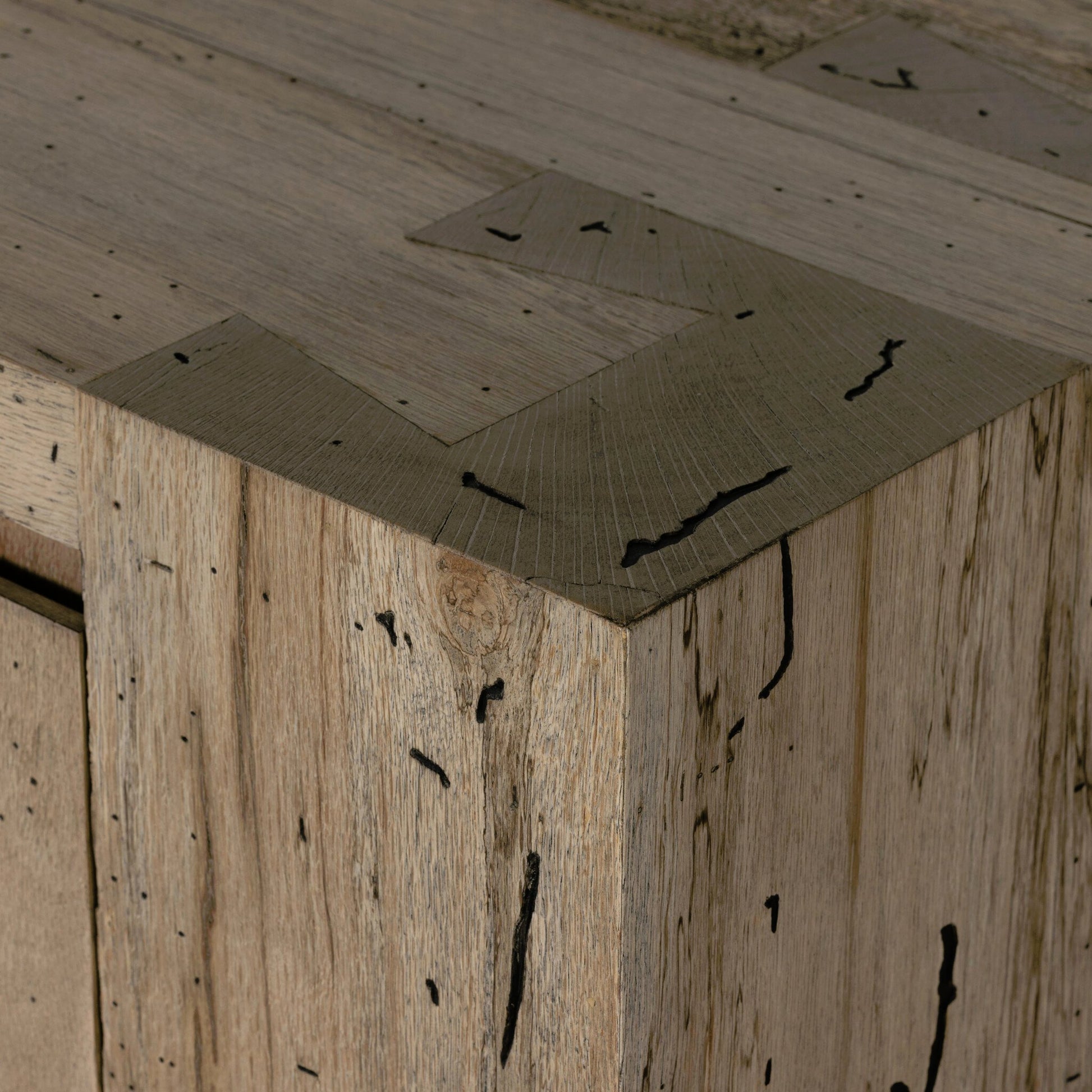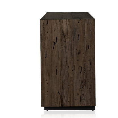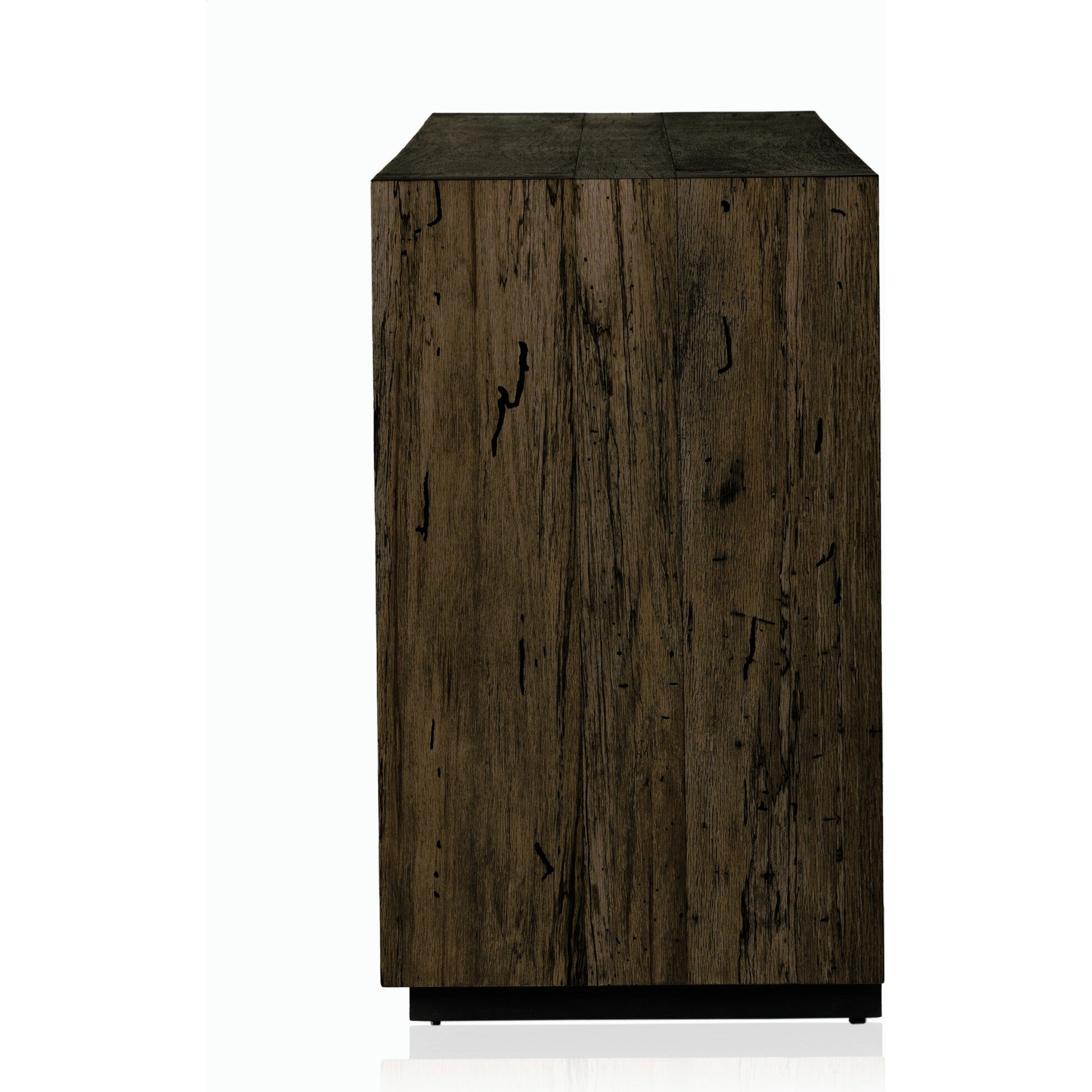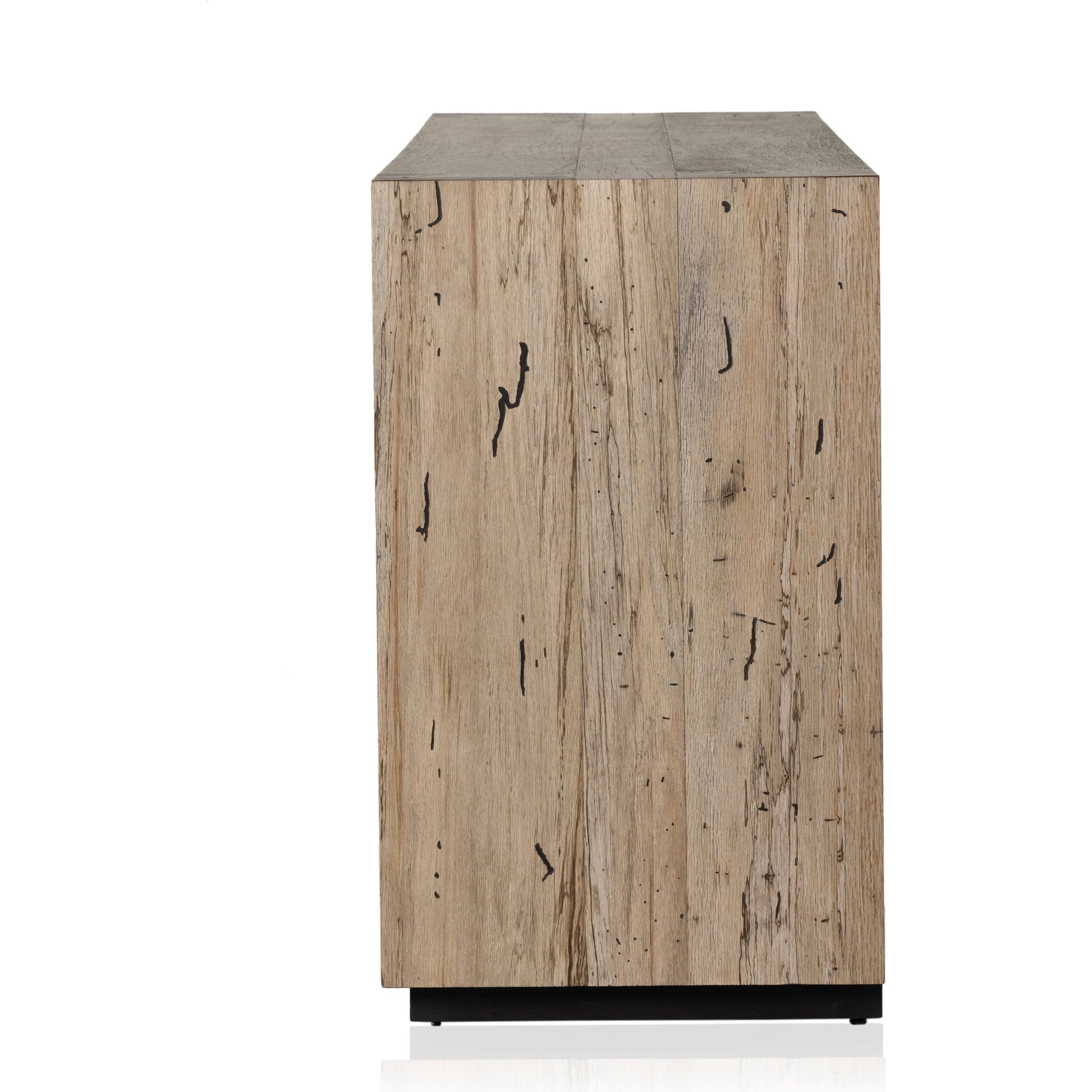 Made from thick-cut oak veneer with a faux rustic finish made to emulate wormwood, this low, large-scale sideboard features chunky squared legs and dovetail joinery detailing.
