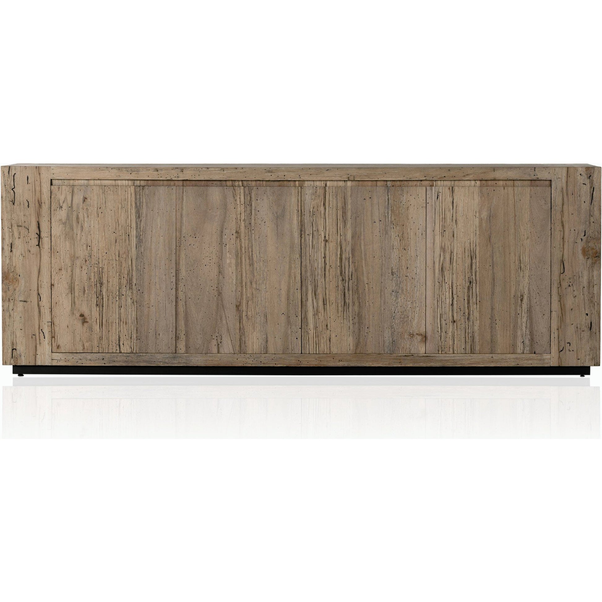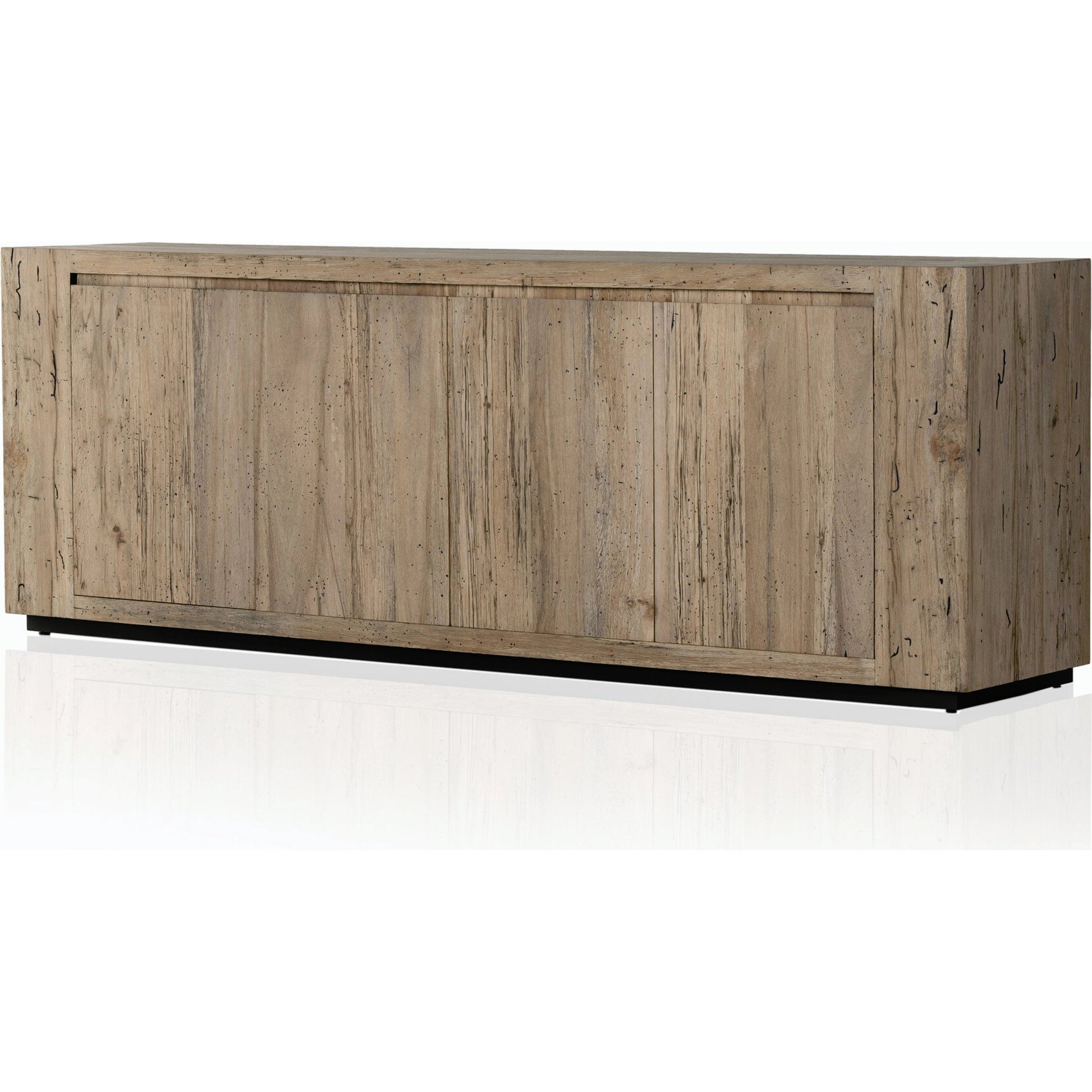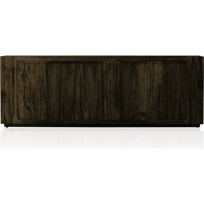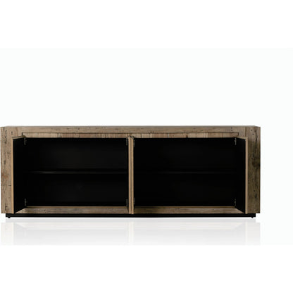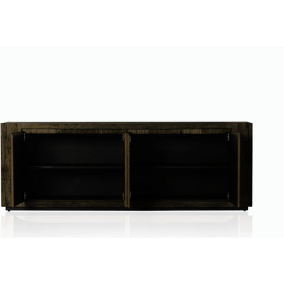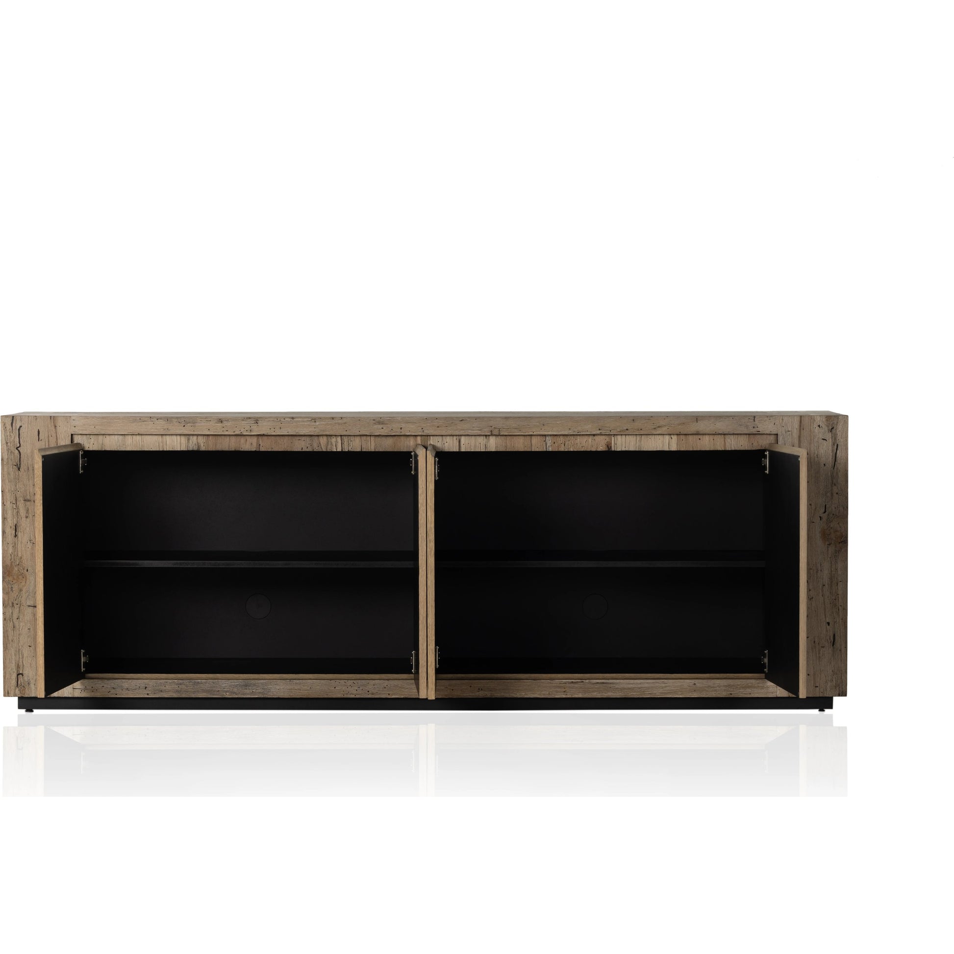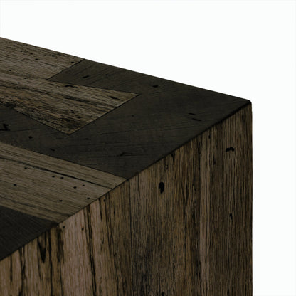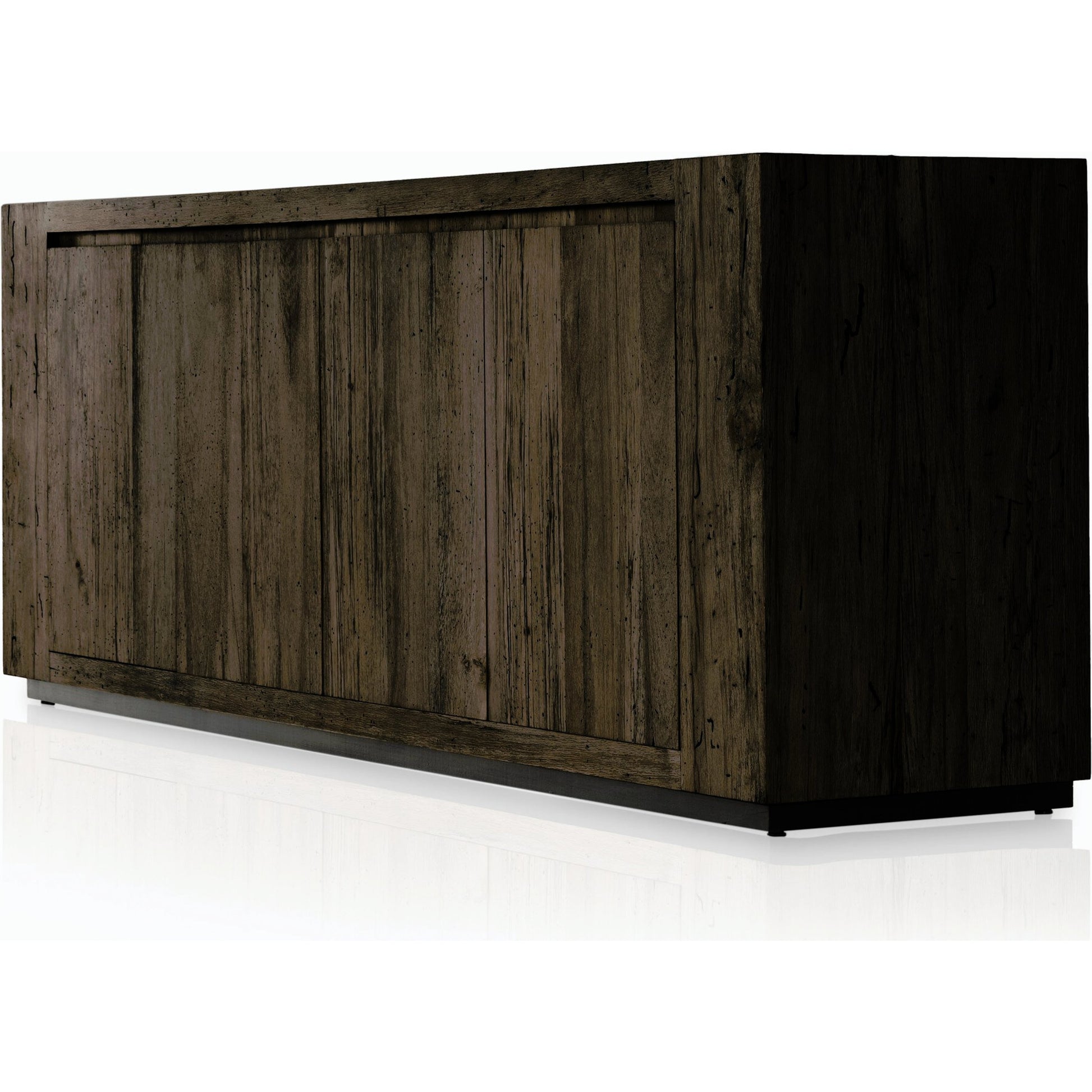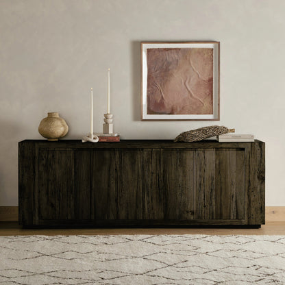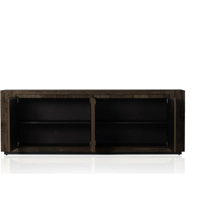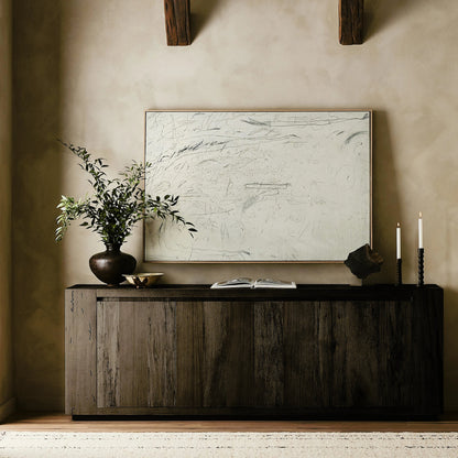 Made from thick-cut oak veneer with a faux rustic finish made to emulate wormwood, this low, large-scale sideboard features chunky squared legs and dovetail joinery detailing.