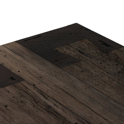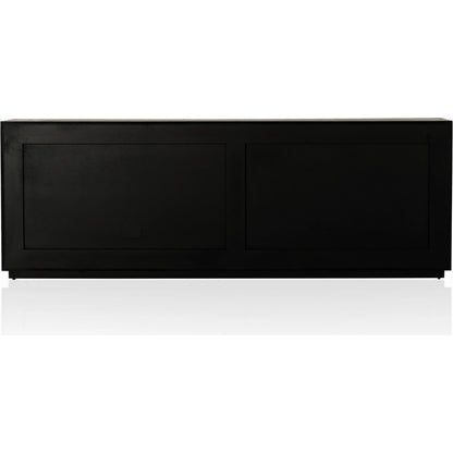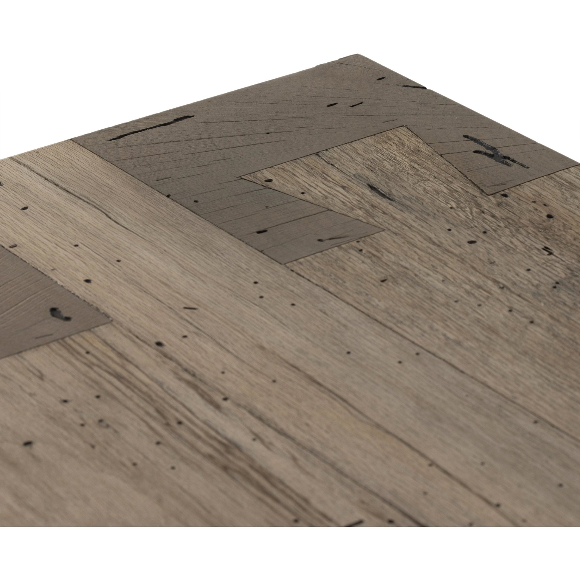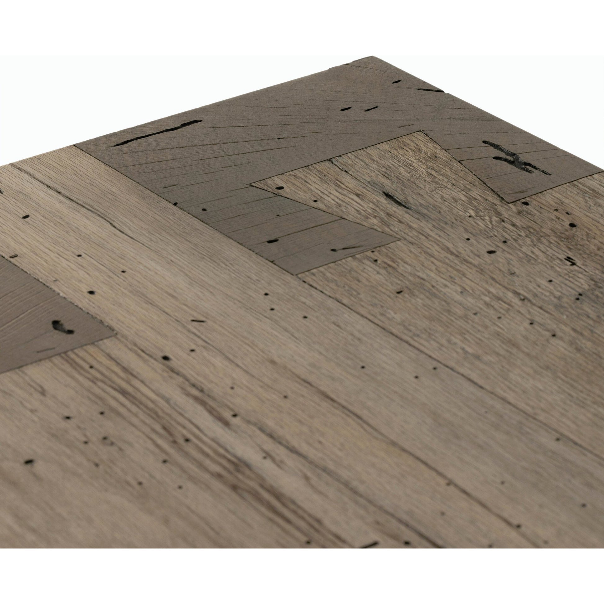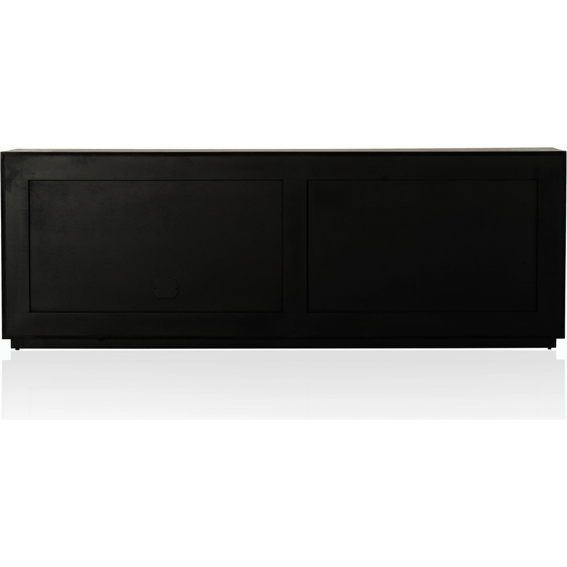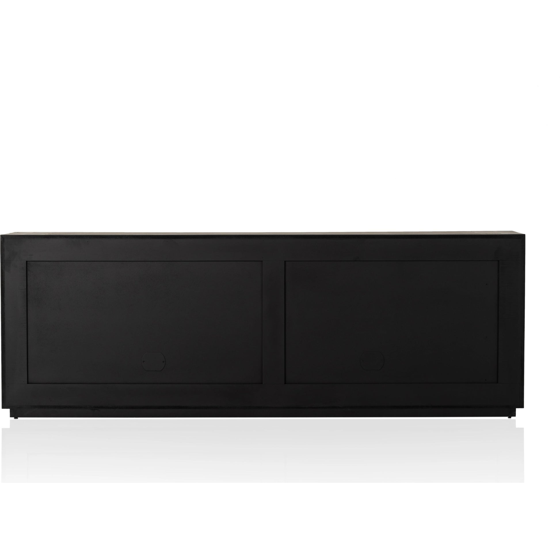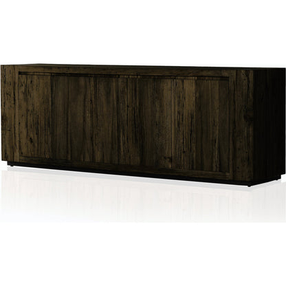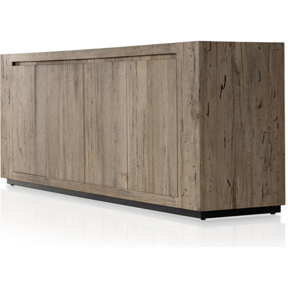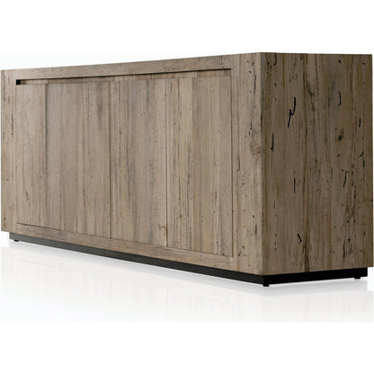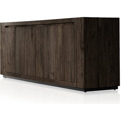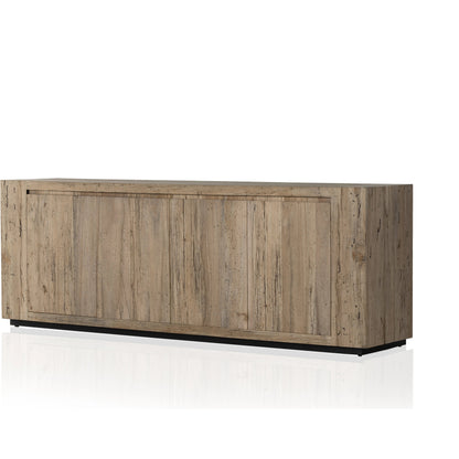 Made from thick-cut oak veneer with a faux rustic finish made to emulate wormwood, this low, large-scale sideboard features chunky squared legs and dovetail joinery detailing.