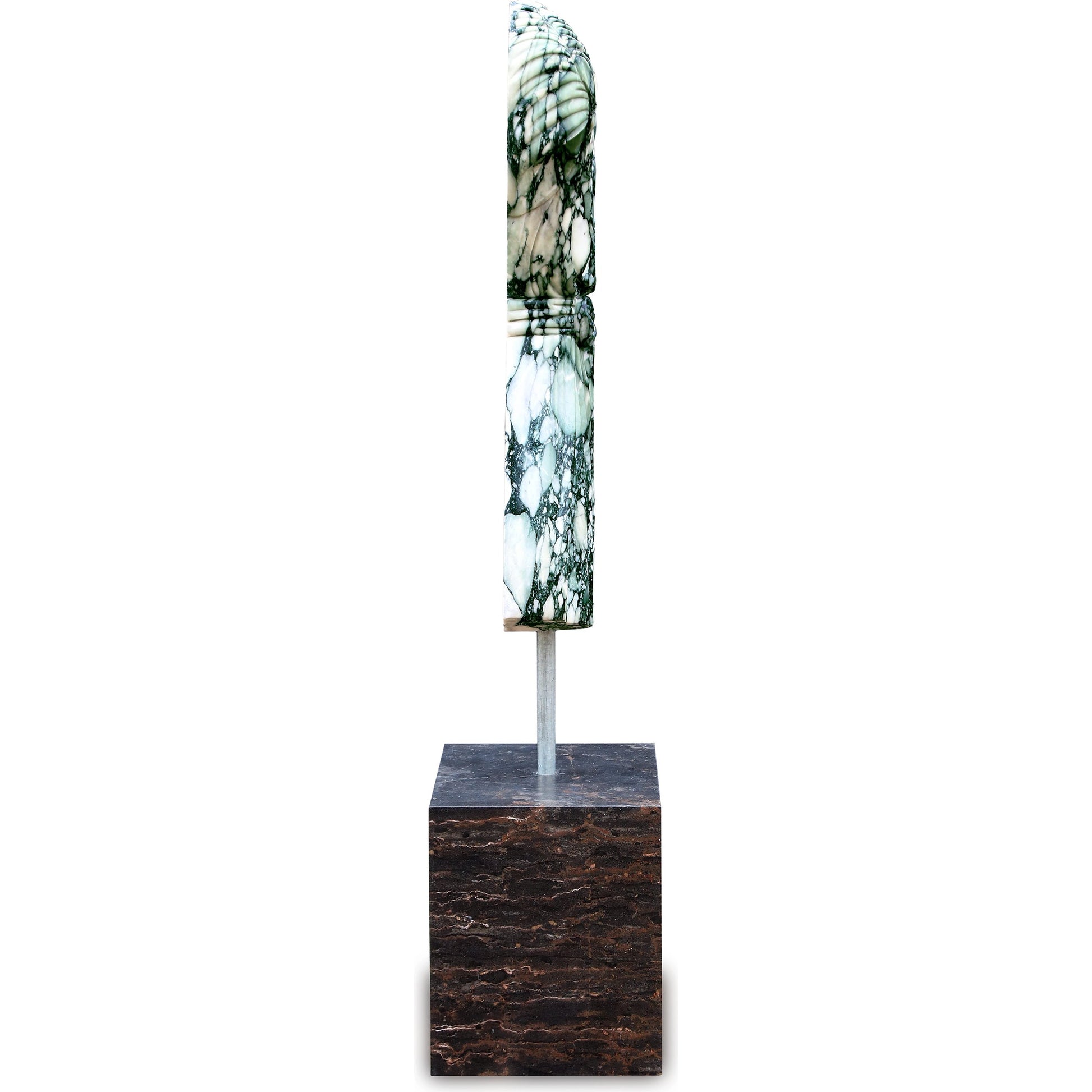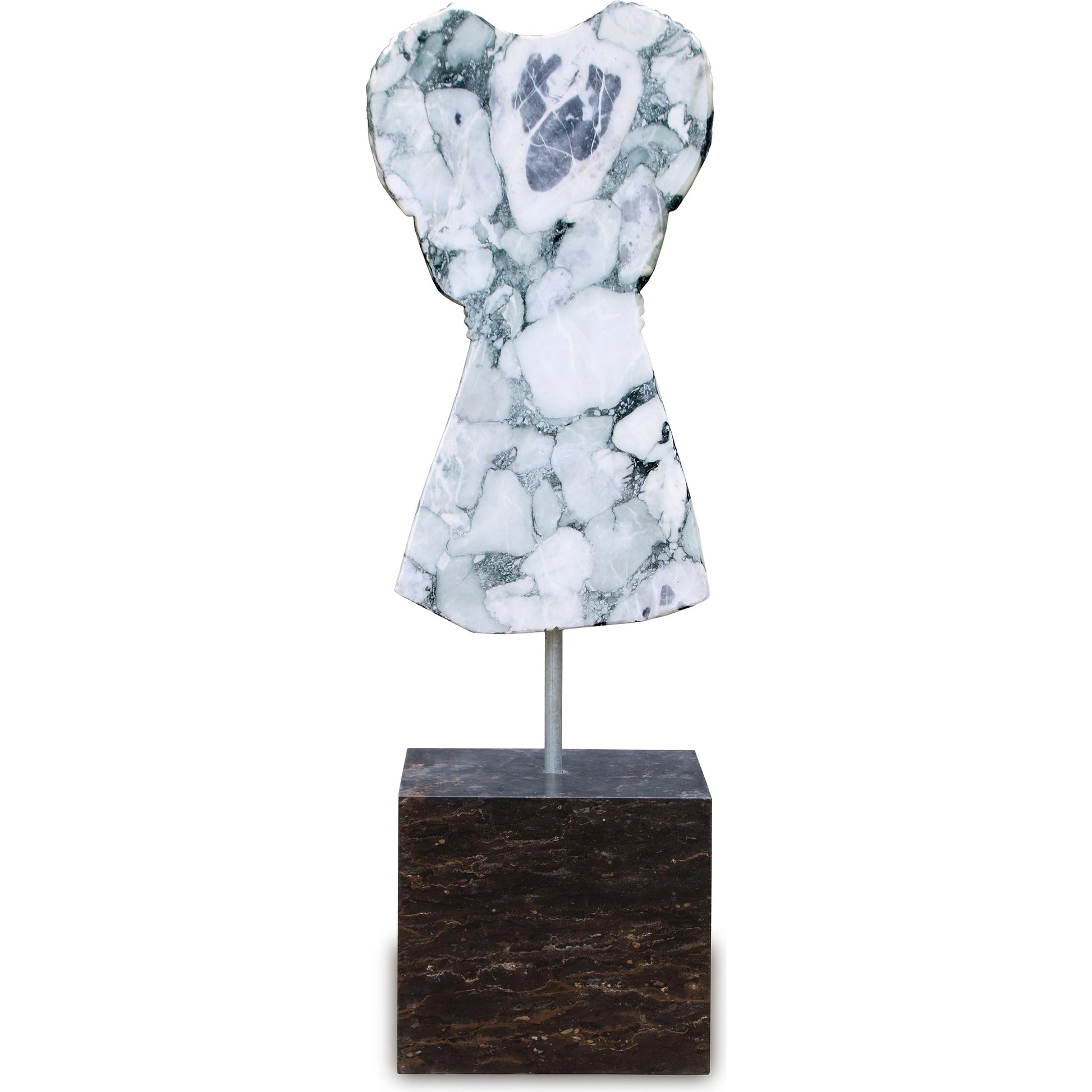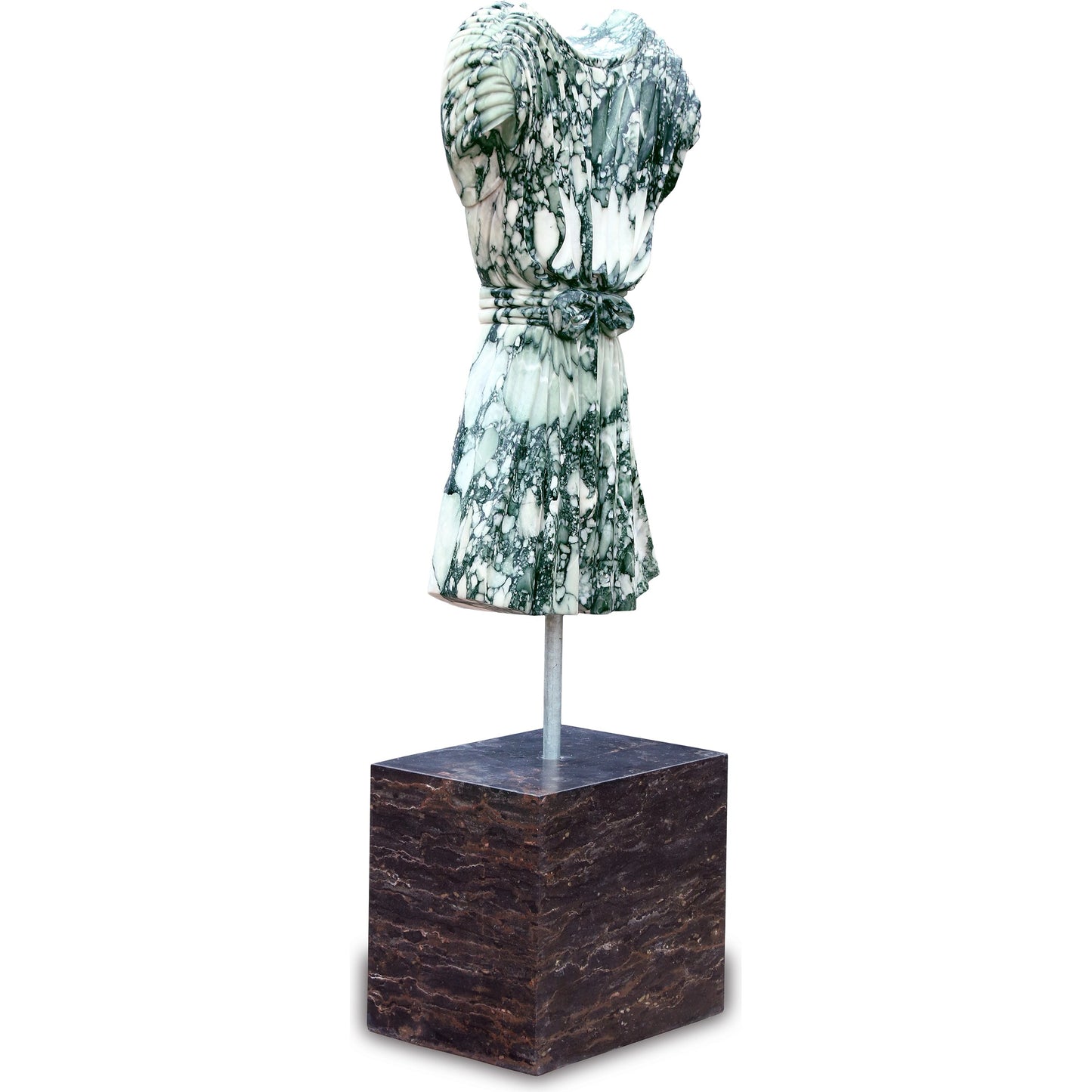 The Adara Marble Dress Sculpture has a famed fashion house to thank for its profile. Modeled after a vintage Lanvin cocktail dress from the 1970s, the chic sculpture is a fashion-forward accessory. The dress is made of pale blue and off-white marble, while the square base is made from black marble, which has a more subtle veining than the more dynamic surface.