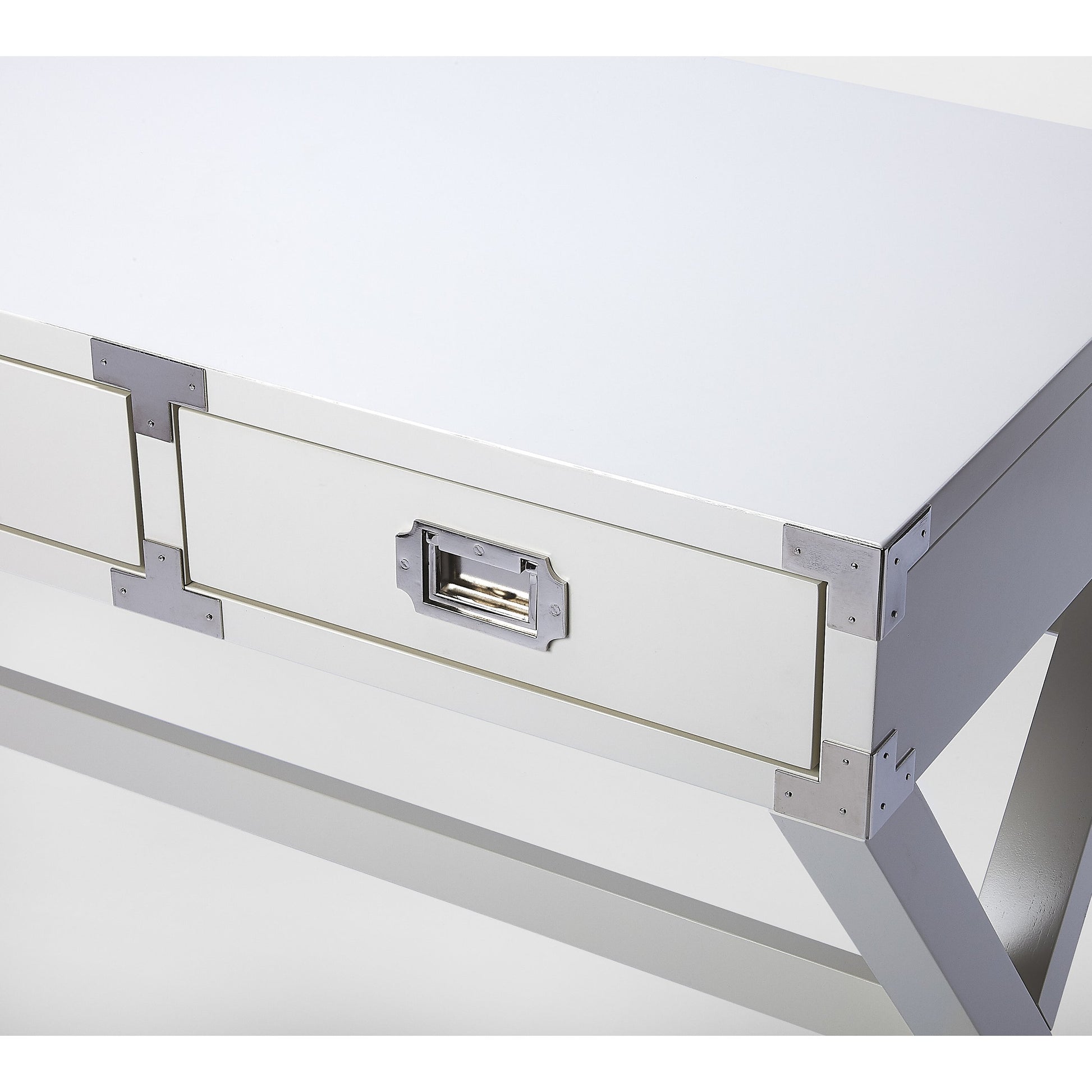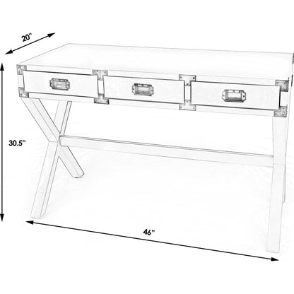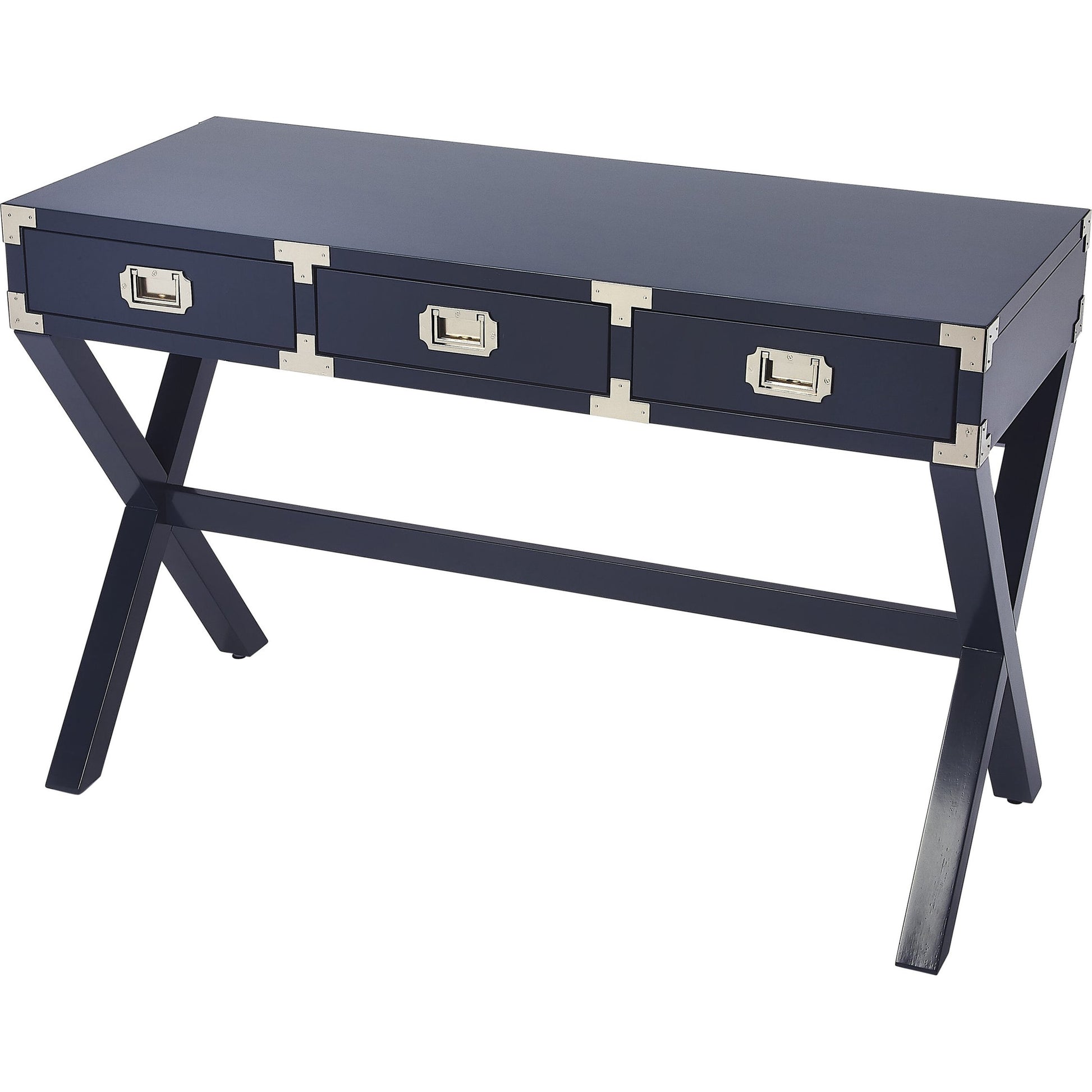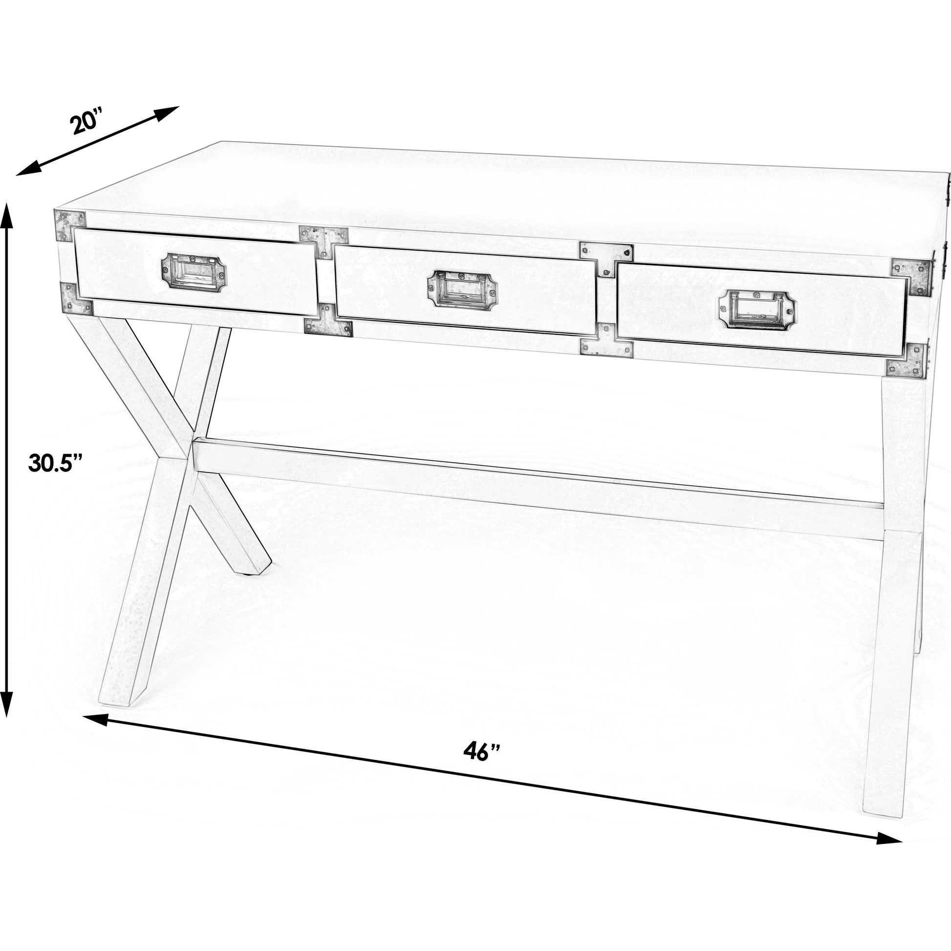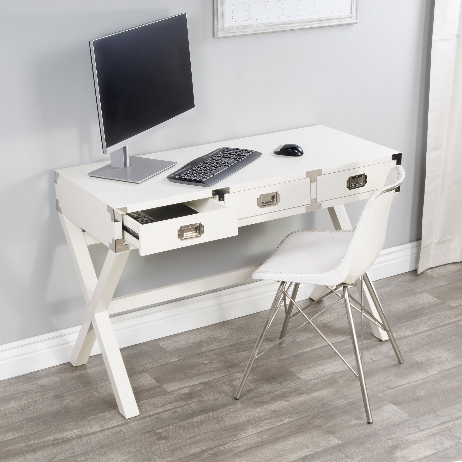 The perfect place to pen notes and tackle weekly to-dos, this writing desk turns any empty space into a convenient workspace. Its campaign-style rubberwood construction brings clean, modern appeal to your decor, while a three drawers, with soft metal glides – complete with decorative hardware silver hardware – hold pens, notebooks, and more. Measuring 46'' wide, this desk offers plenty of surface area for printers, laptops, or decorative objects.