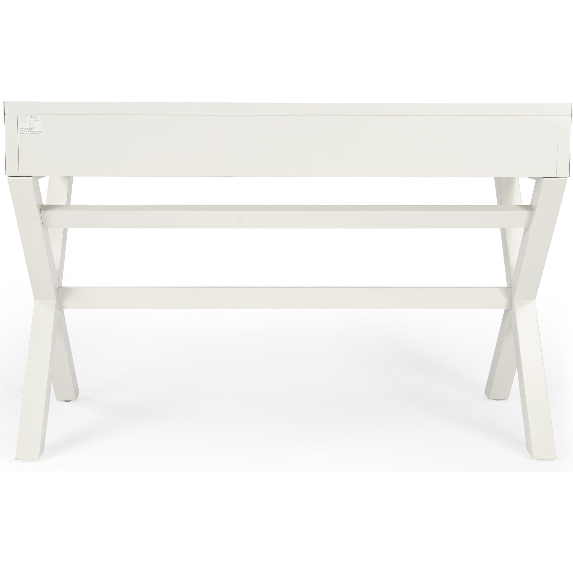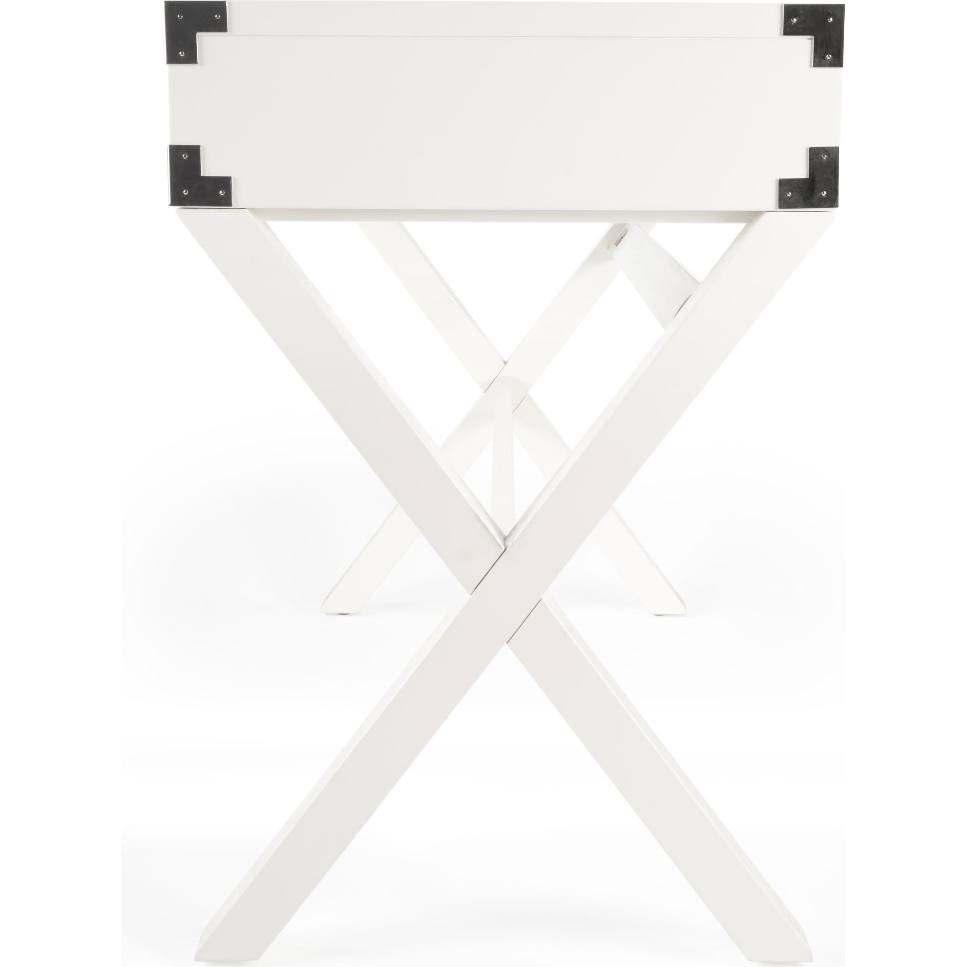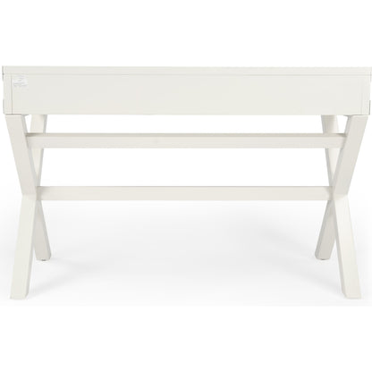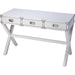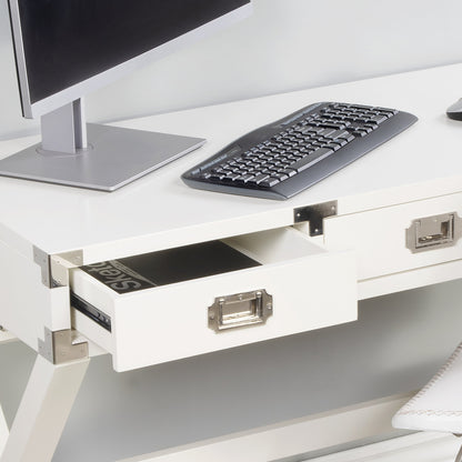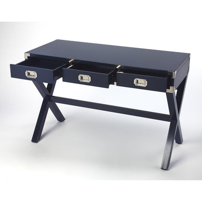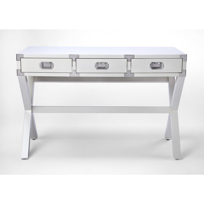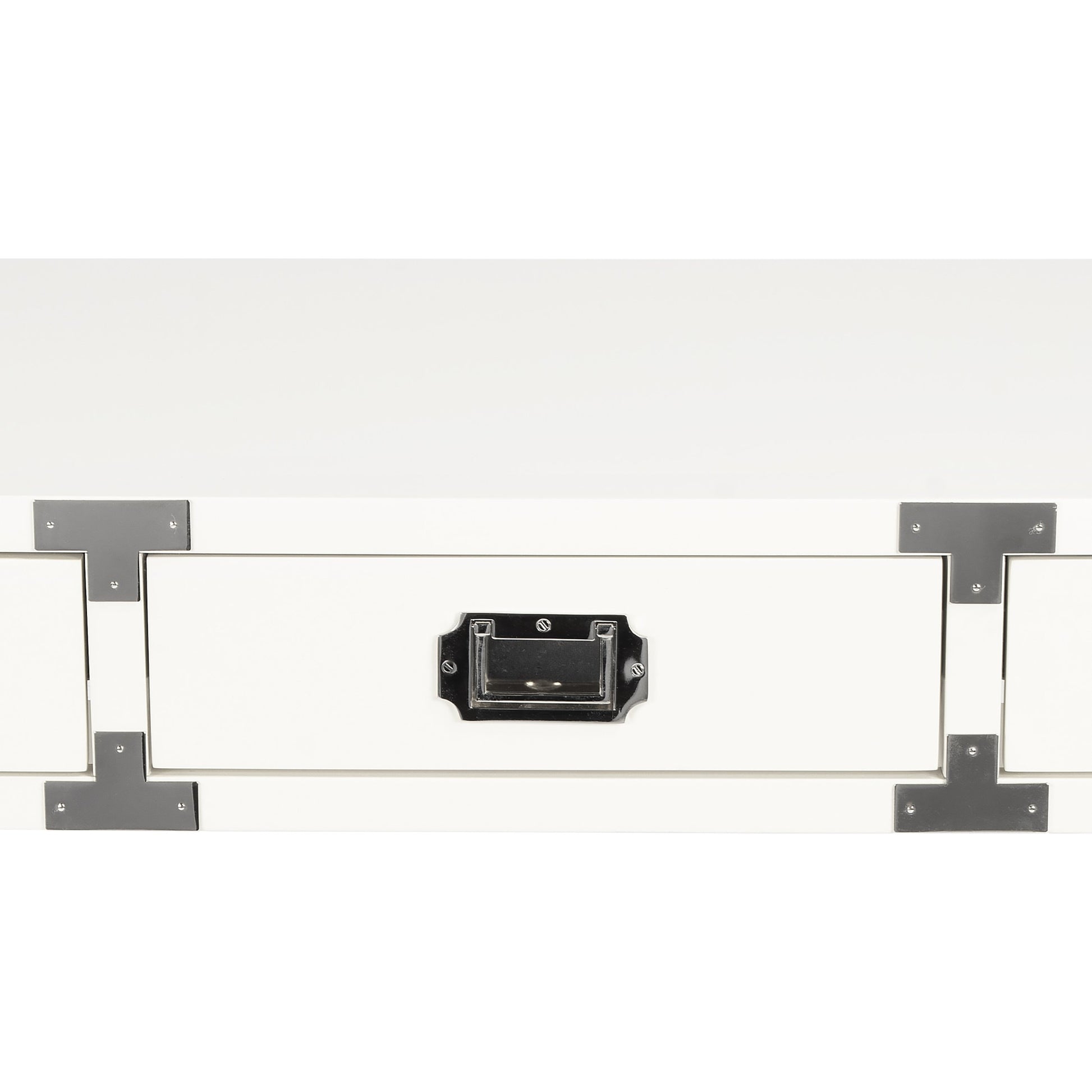 The perfect place to pen notes and tackle weekly to-dos, this writing desk turns any empty space into a convenient workspace. Its campaign-style rubberwood construction brings clean, modern appeal to your decor, while a three drawers, with soft metal glides – complete with decorative hardware silver hardware – hold pens, notebooks, and more. Measuring 46'' wide, this desk offers plenty of surface area for printers, laptops, or decorative objects.