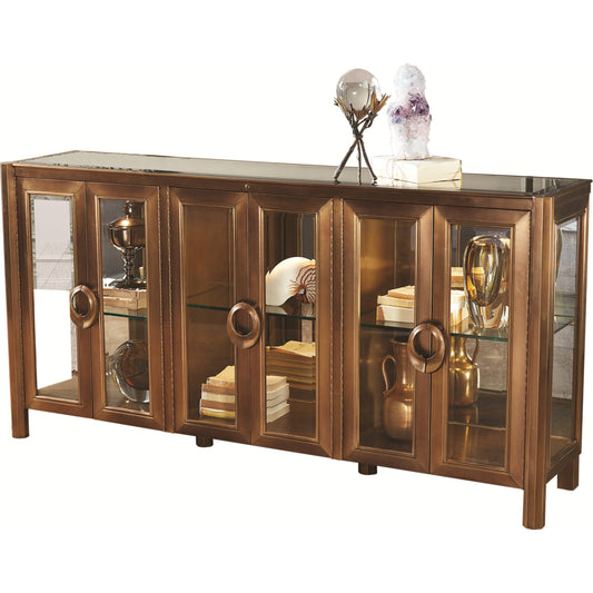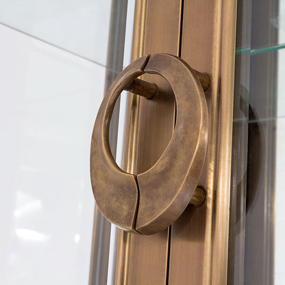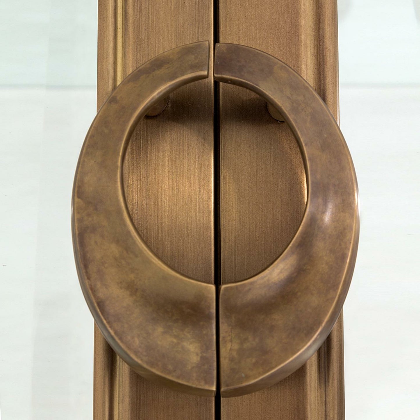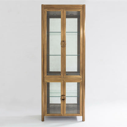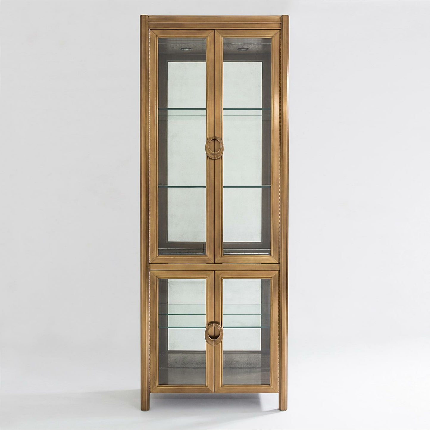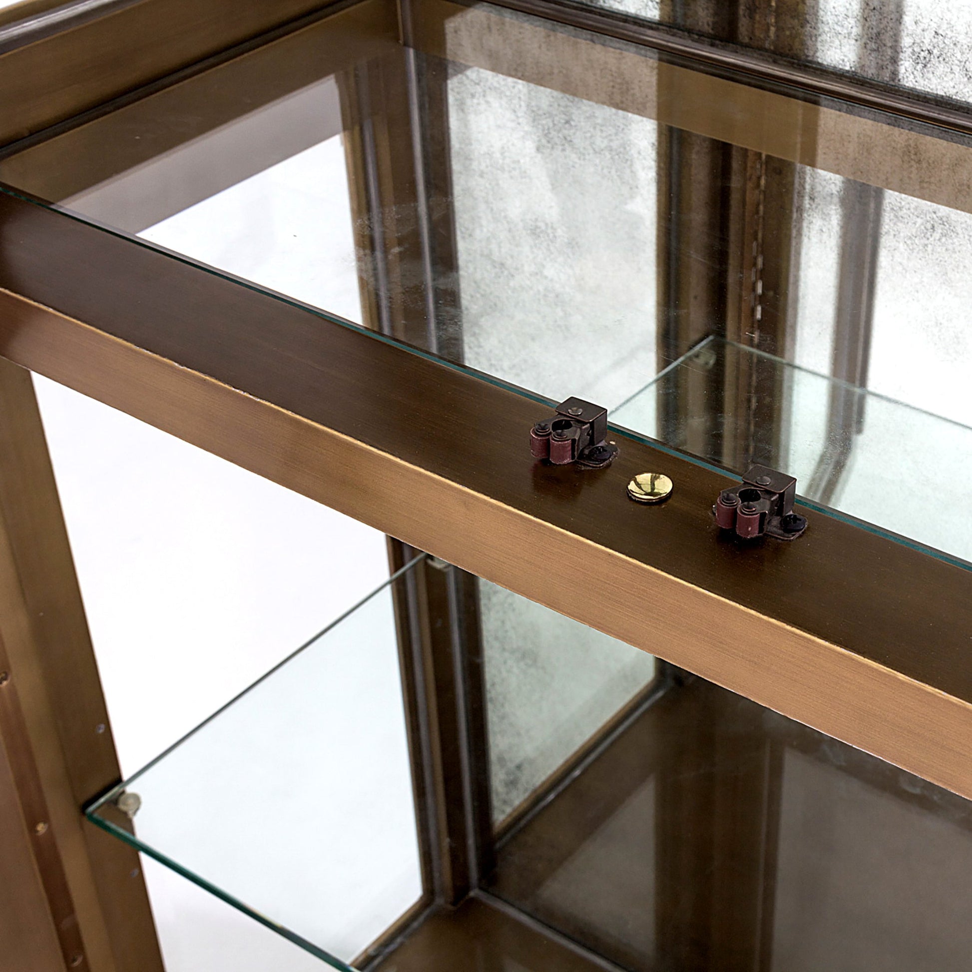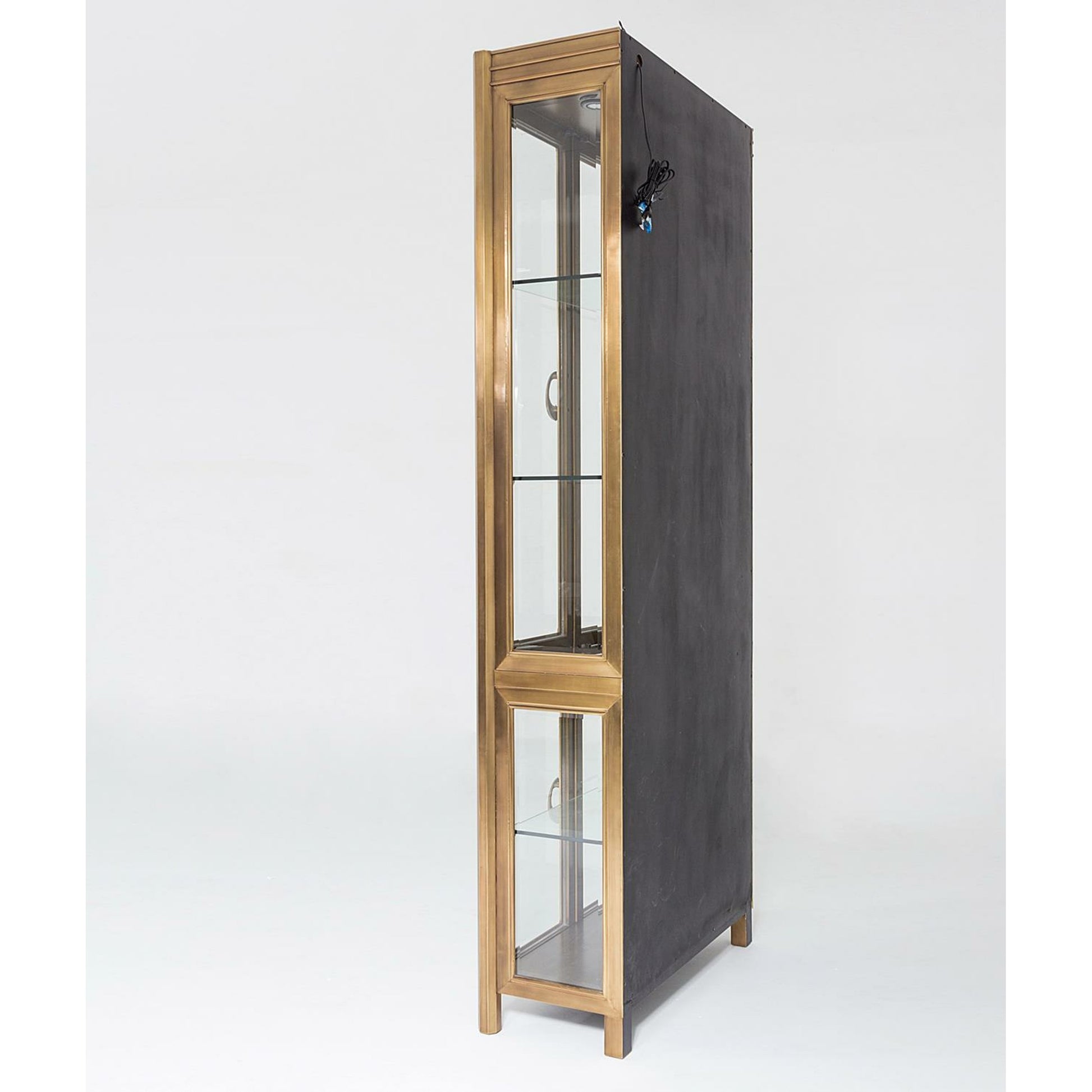 A tall, stately piece of furniture made from an MDF frame and support clad in solid thick brass sheet material. Two compartments, upper and lower, with four shelves- three adjustable, one fixed between the levels. Antique mirror interior backpanel. Beveled glass on all doors and side panels. Two sets of sand casted solid brass handles that have been custom made and designed for this piece specifically. Two upper LED lights shine all the way from the very top of the piece through the series of glass shelves to the bottom shelf of the item.|Apothecary is one term for a medical professional who formulates and dispenses medical materials to physicians, surgeons, and patients. The modern pharmacist (also colloquially referred to as a chemist in British English) has taken over this role. In some languages and regions, the word "apothecary" is still used to refer to a retail pharmacy or a pharmacist who owns one. Apothecaries' investigation of herbal and chemical ingredients was a precursor to the modern sciences of chemistry and pharmacology. This definition of apothecary should help you well imagine how many wonderful, useful, and other oddities could be displayed within this beautiful elegant vitrine.