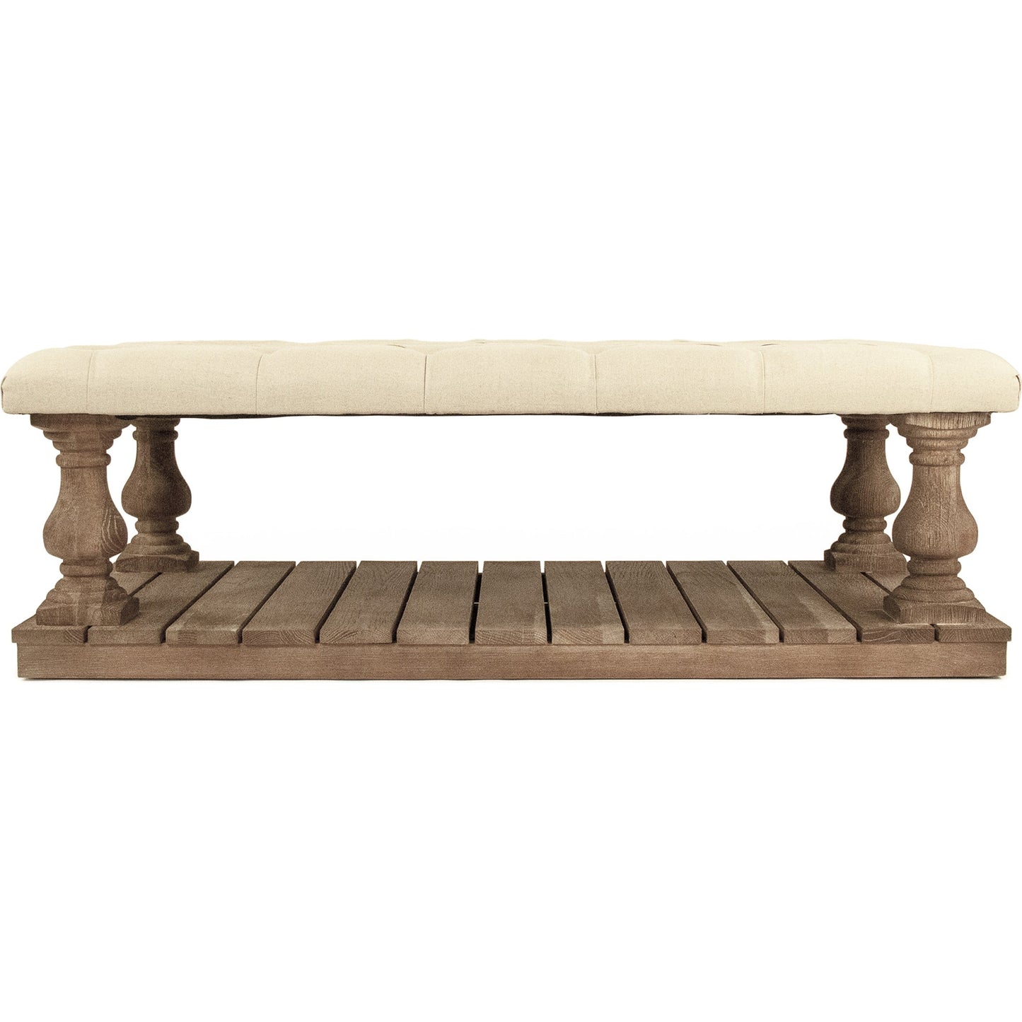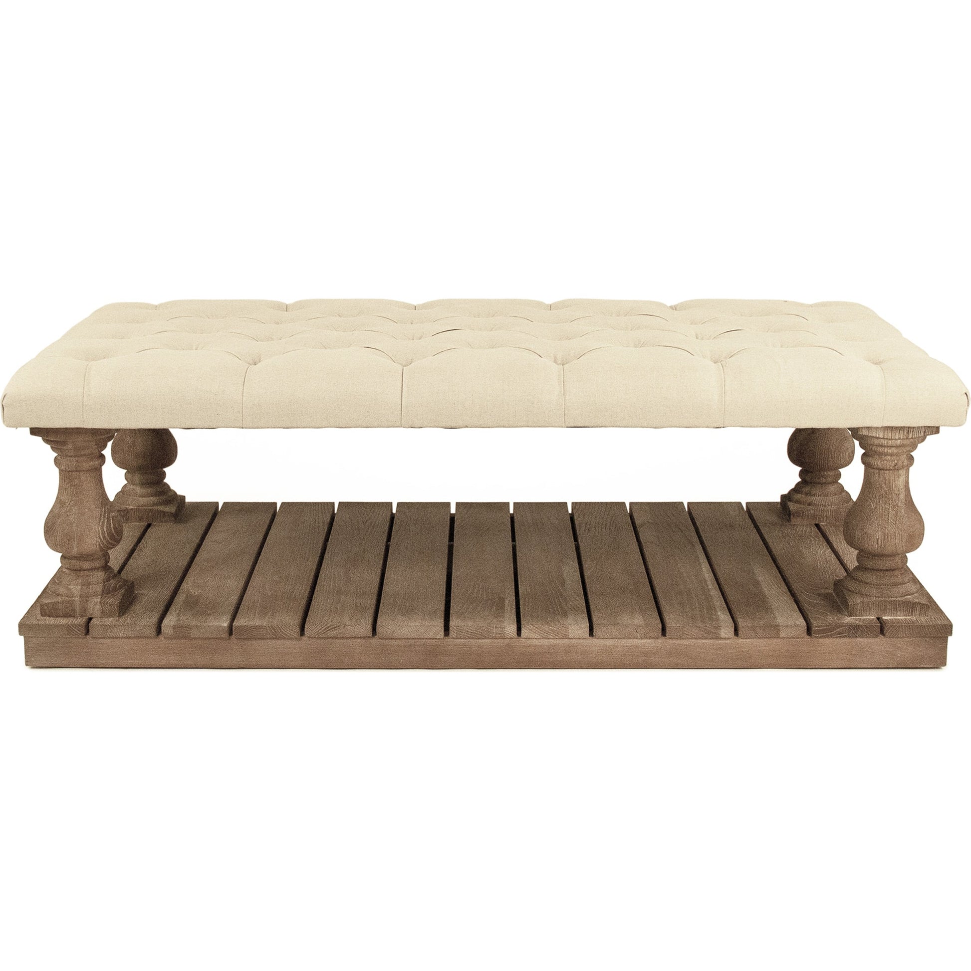 Tufted ottoman with shelf upholstered in natural linen on limed grey oak frame.