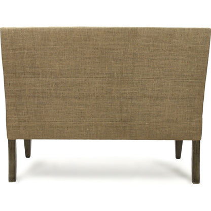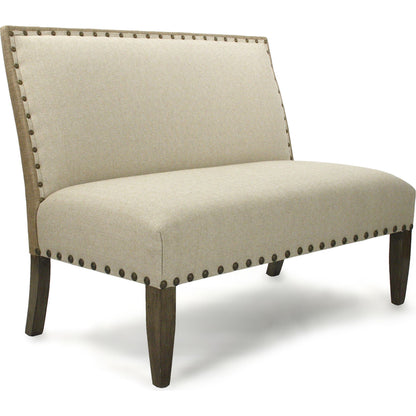 Solid hardwood maple frame bench upholstered in an antique linen with nail head trims.