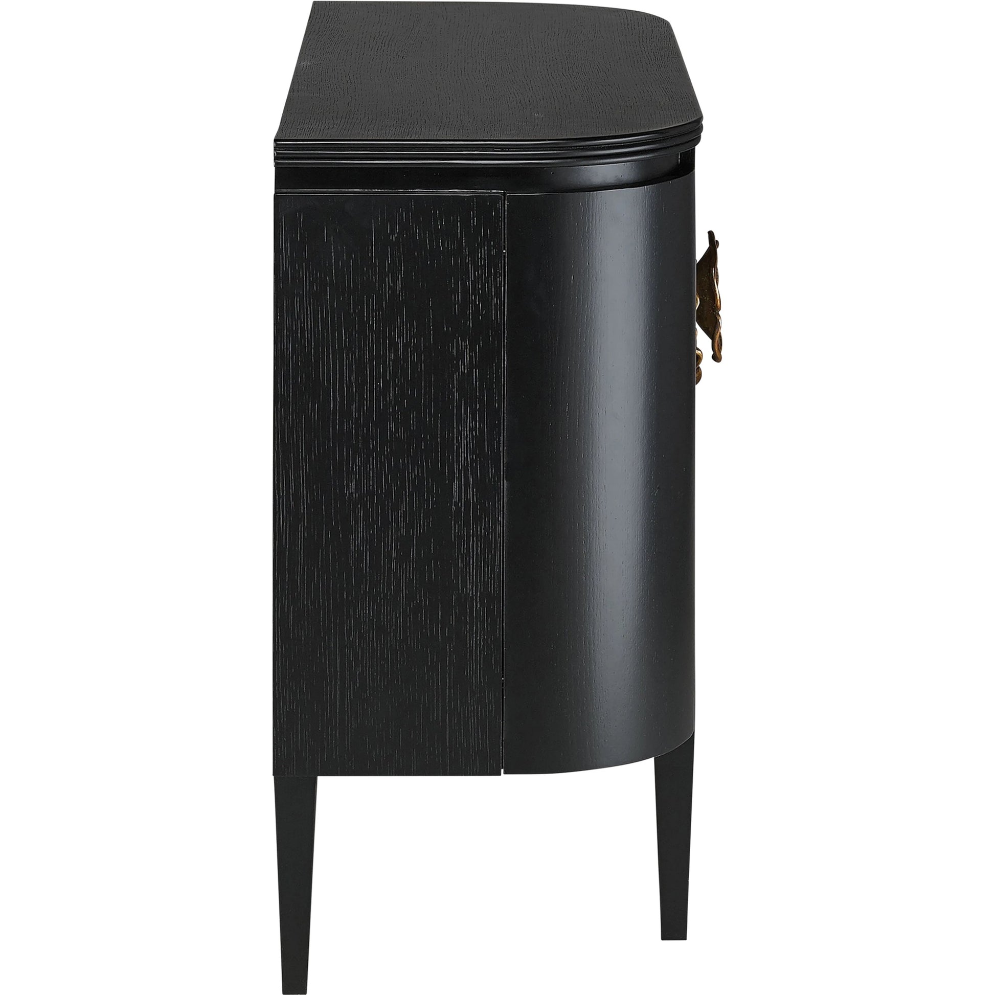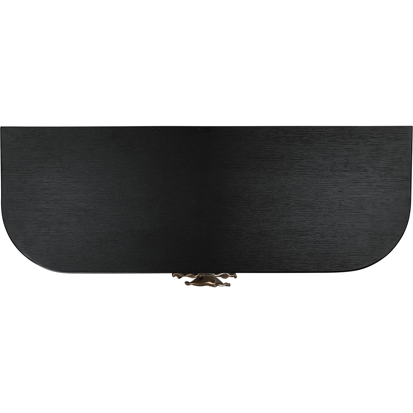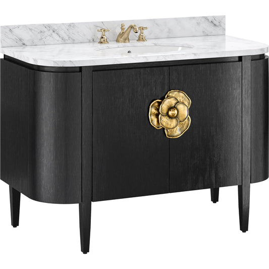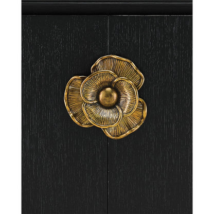 Stunning in its simplicity, the new demi-lune offering is an elegant Caviar Black stained wood that seems to just be the backdrop for the impressively oversized brass flower pull that steals the show.