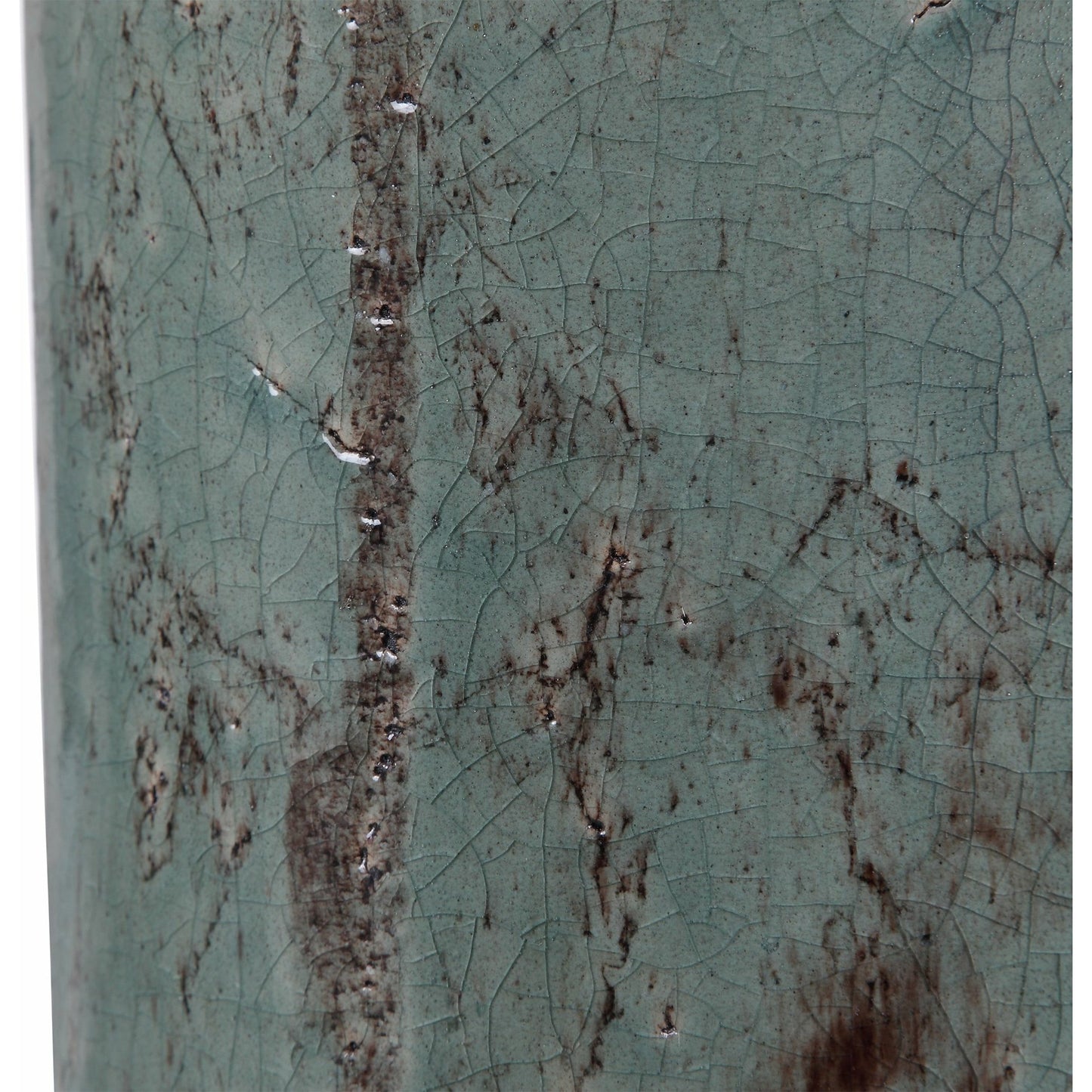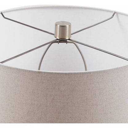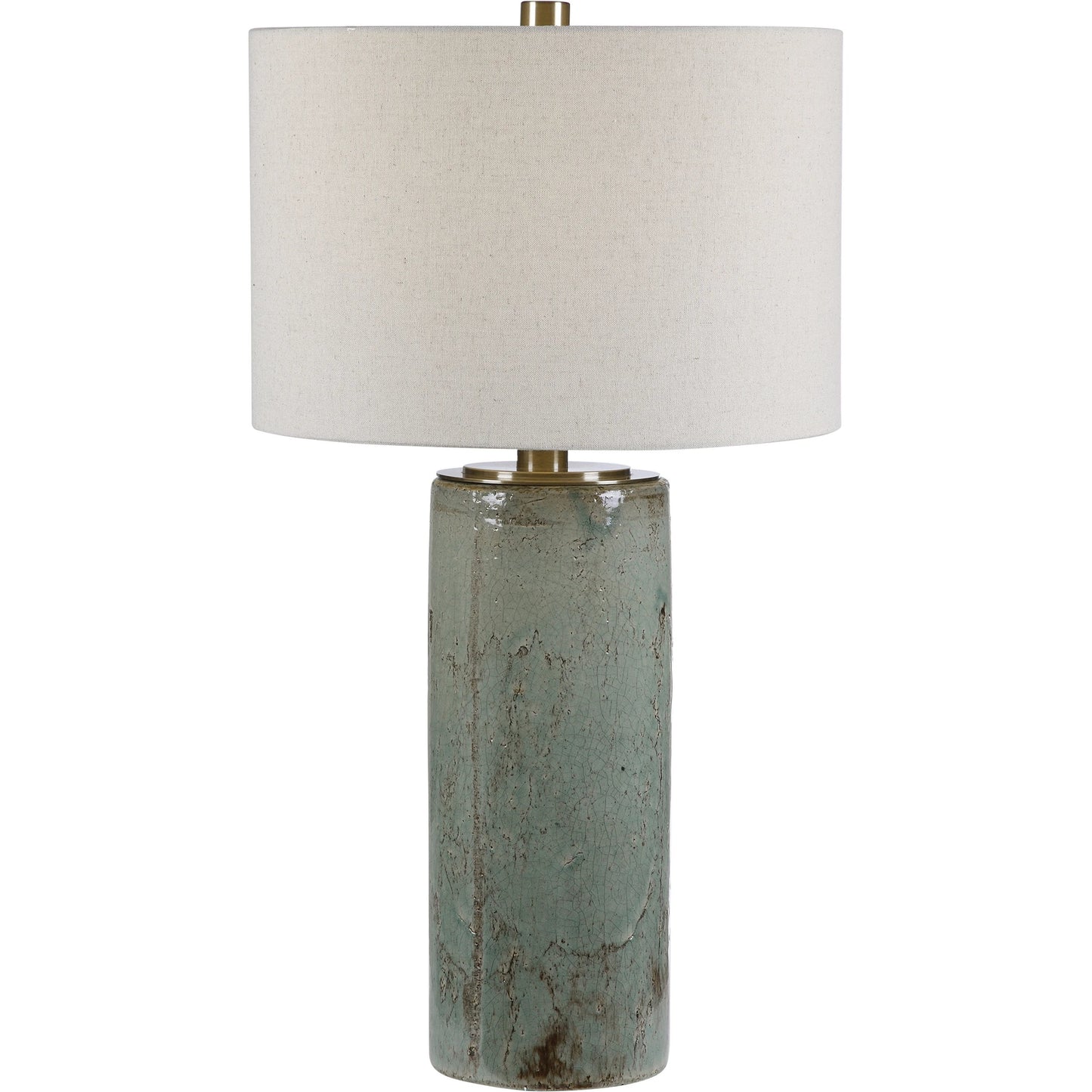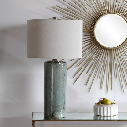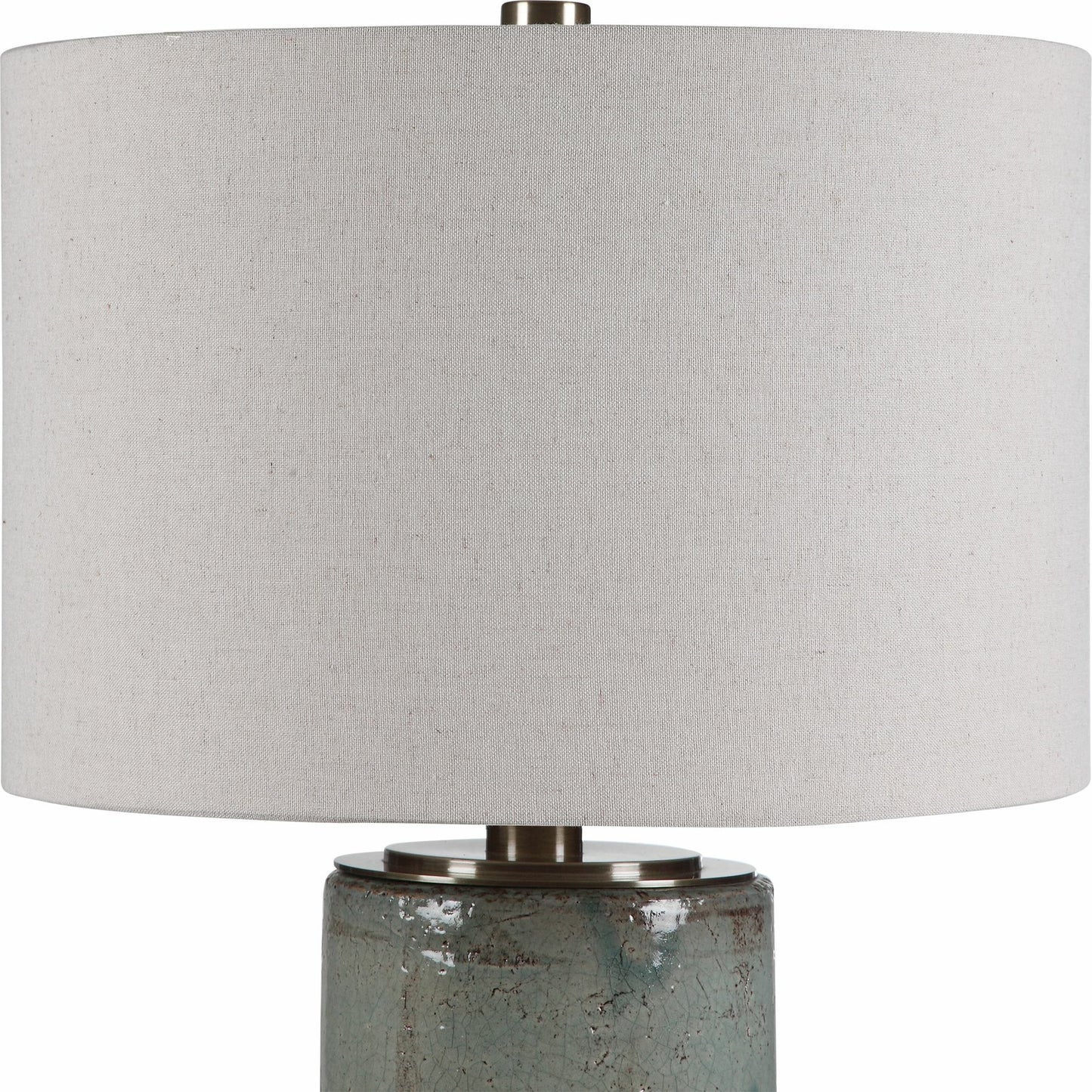 Ceramic Table Lamp Finished In A Crackled Aqua Blue Glaze With Dark Rustic Bronze Distressing, Accented With Brushed Nickel Details. The Round Hardback Drum Shade Is A Light Beige Linen Fabric.