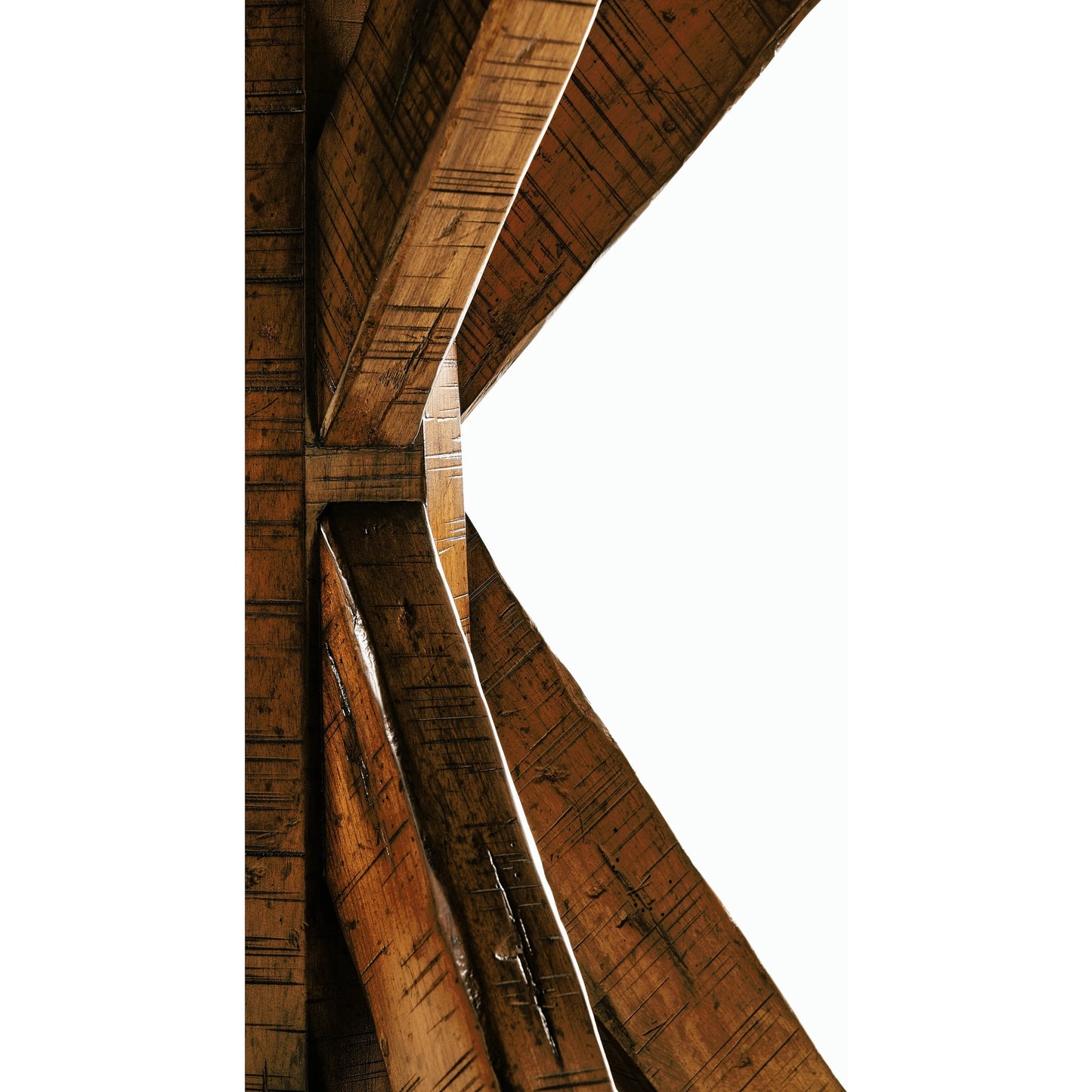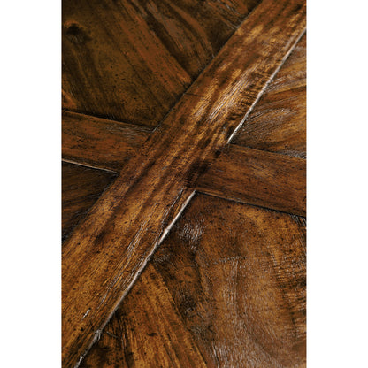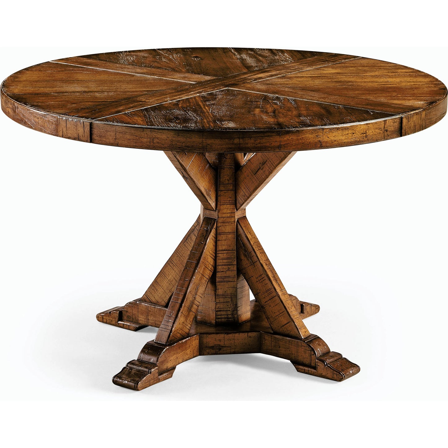 48" Solid topped circular dining table with a rustic finish showing exposed saw marks and set on a bracketed country living base.
