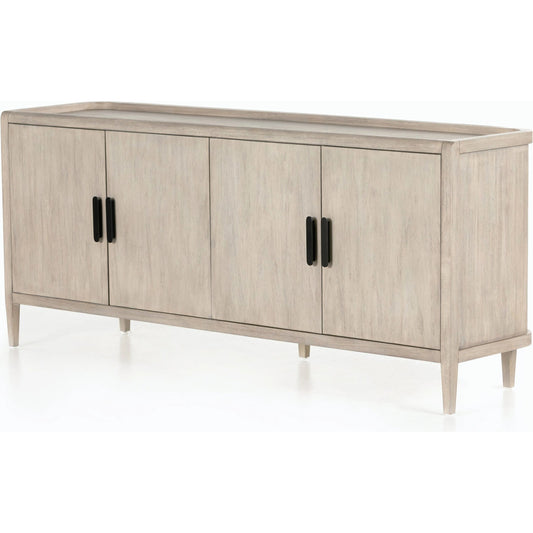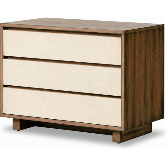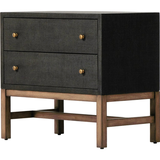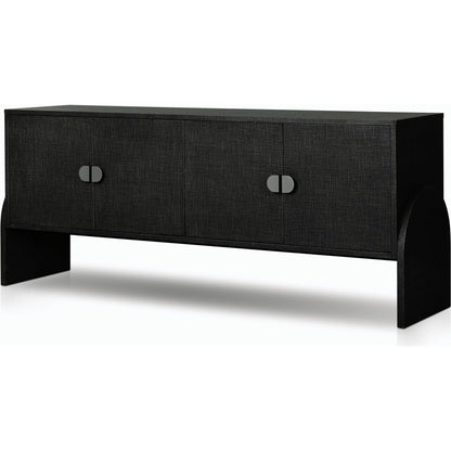 Talk about novelty. Made from painted black linen, arched legs soften otherwise clean, modern shaping. Gunmetal, half-moon iron hardware completes the look. Rear cutouts for cord management.