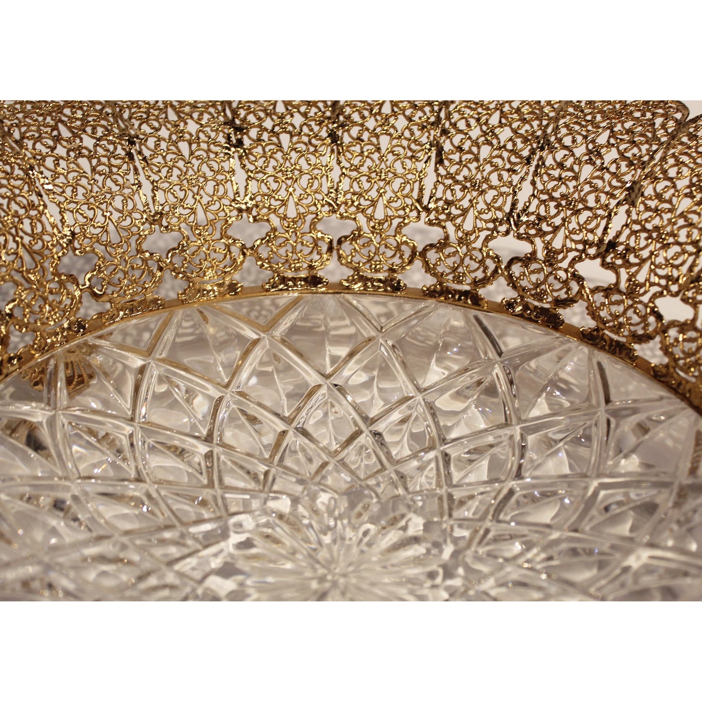 Round Clear Crystal bowl with hand engravings adorned with a delicately woven golden detail around the rim. Lost-wax cast details in brass.