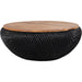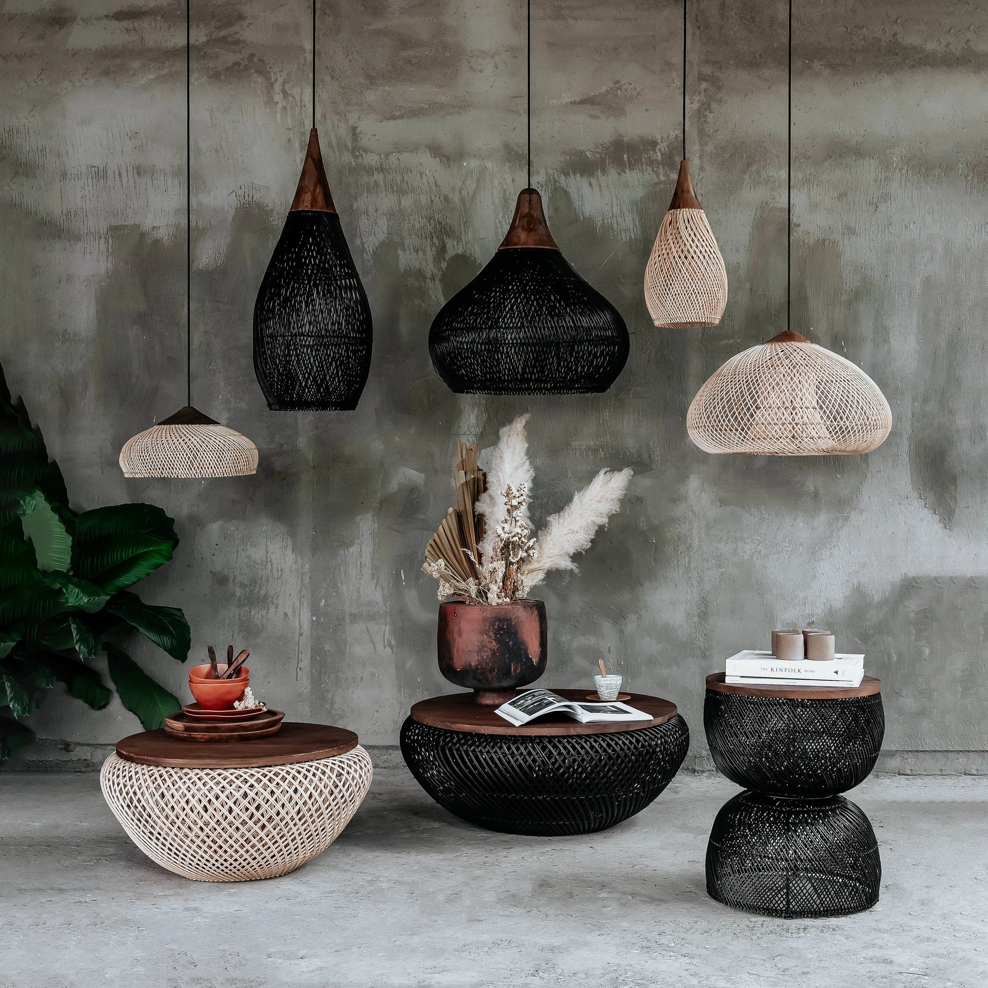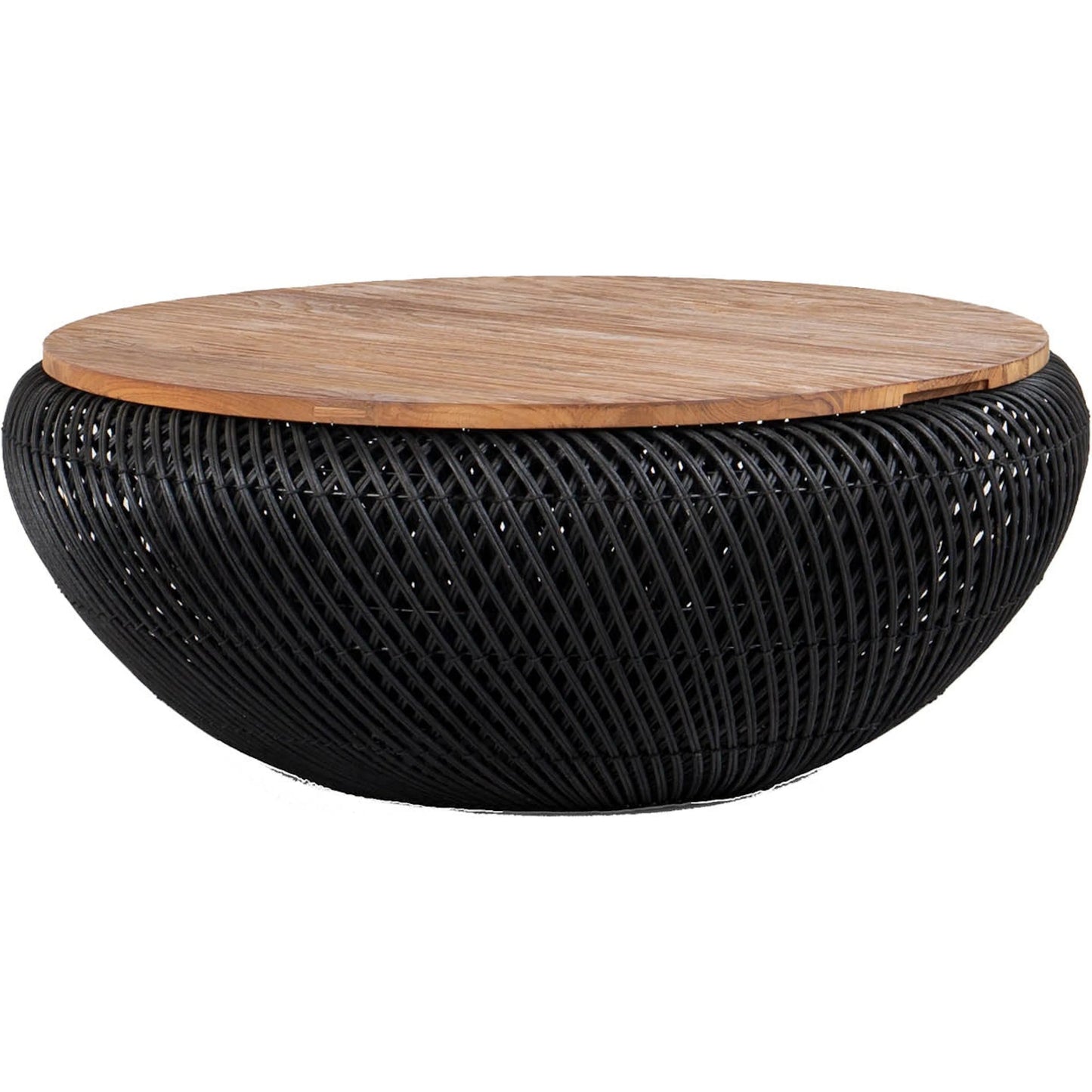 Made from ethically sourced natural materials, this table is full of character and history, and doubles as a storage space. The top is sturdy reclaimed teak with a traditional rattan weave for the base. The base is given a black finish evoking volcanic rock or tropical midnight while the top reflects unique patterns found only in nature.