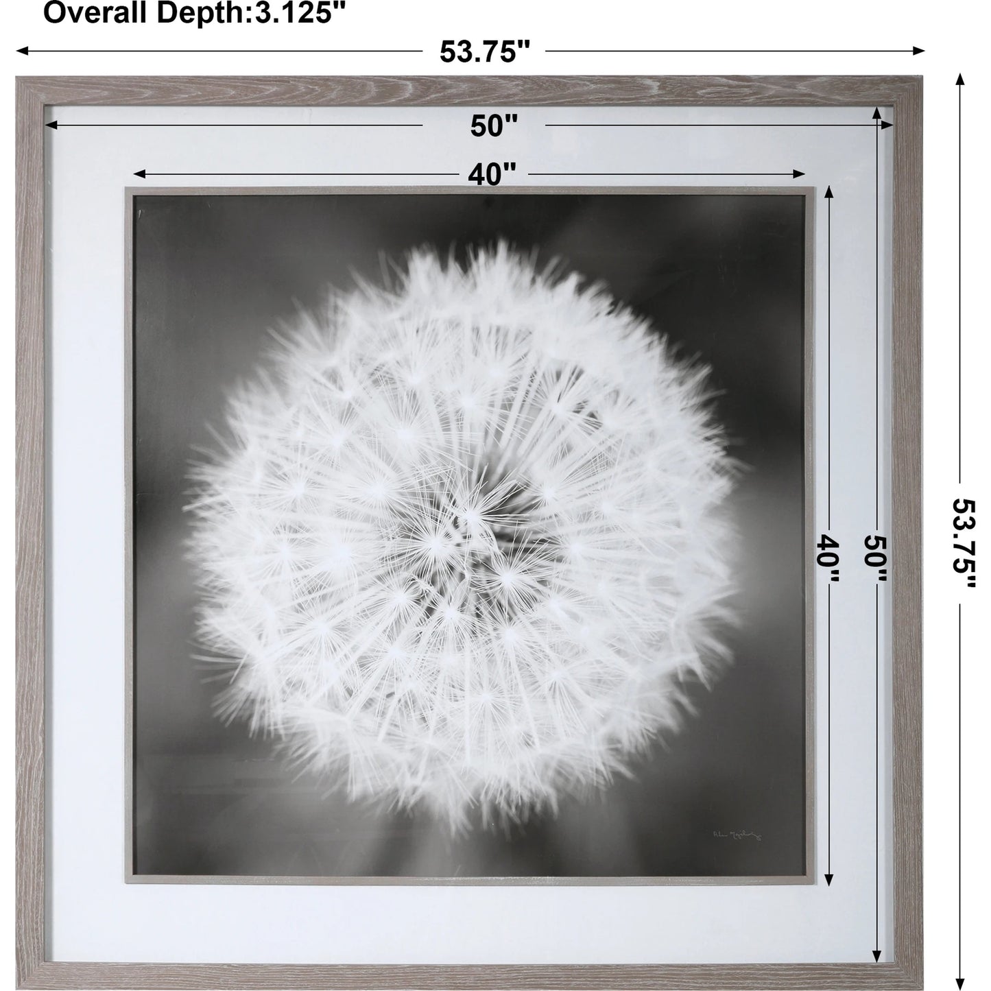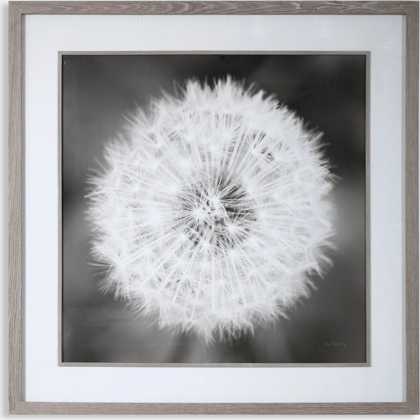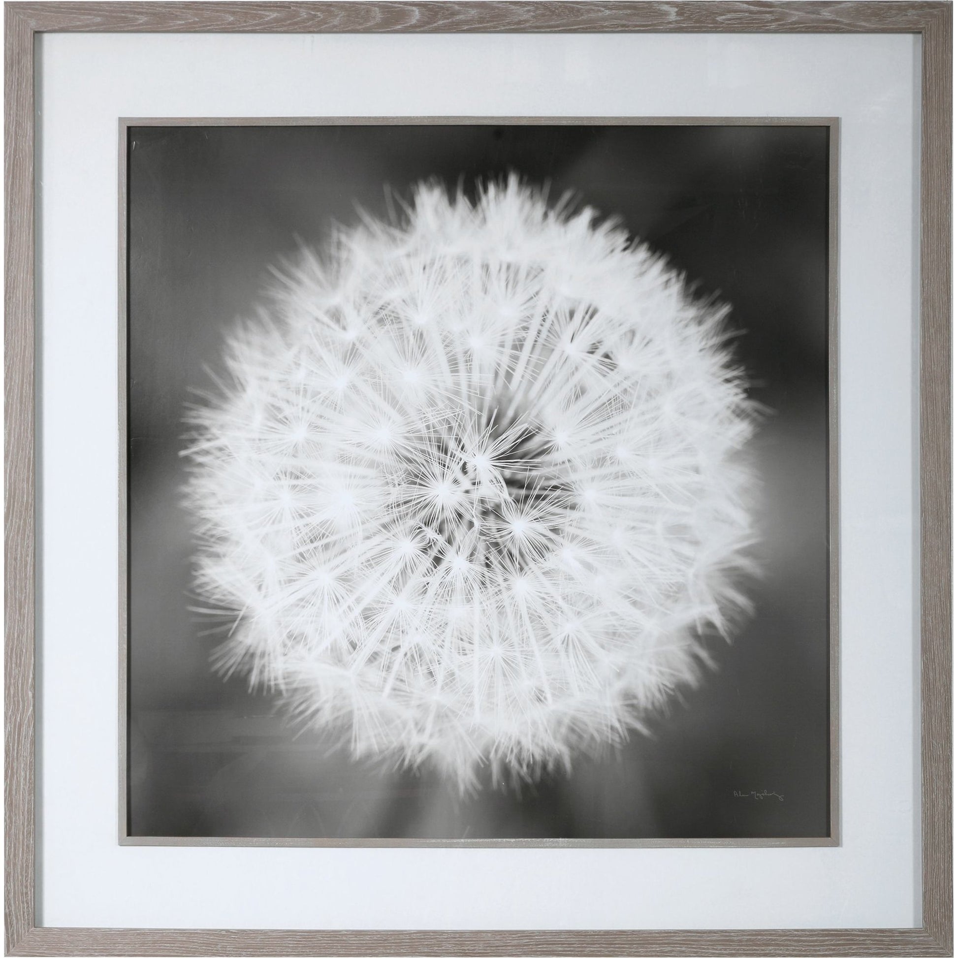 This Black And White Dandelion Framed Print Is A Great Neutral Piece Of Artwork That Adds Interest To Any Space. The Print Is Accented By A Driftwood Gray Pine Wood Frame With A Matching Fillet And A Large White Mat.