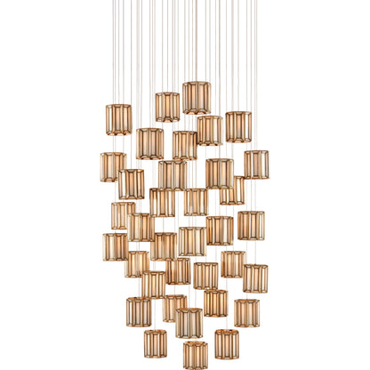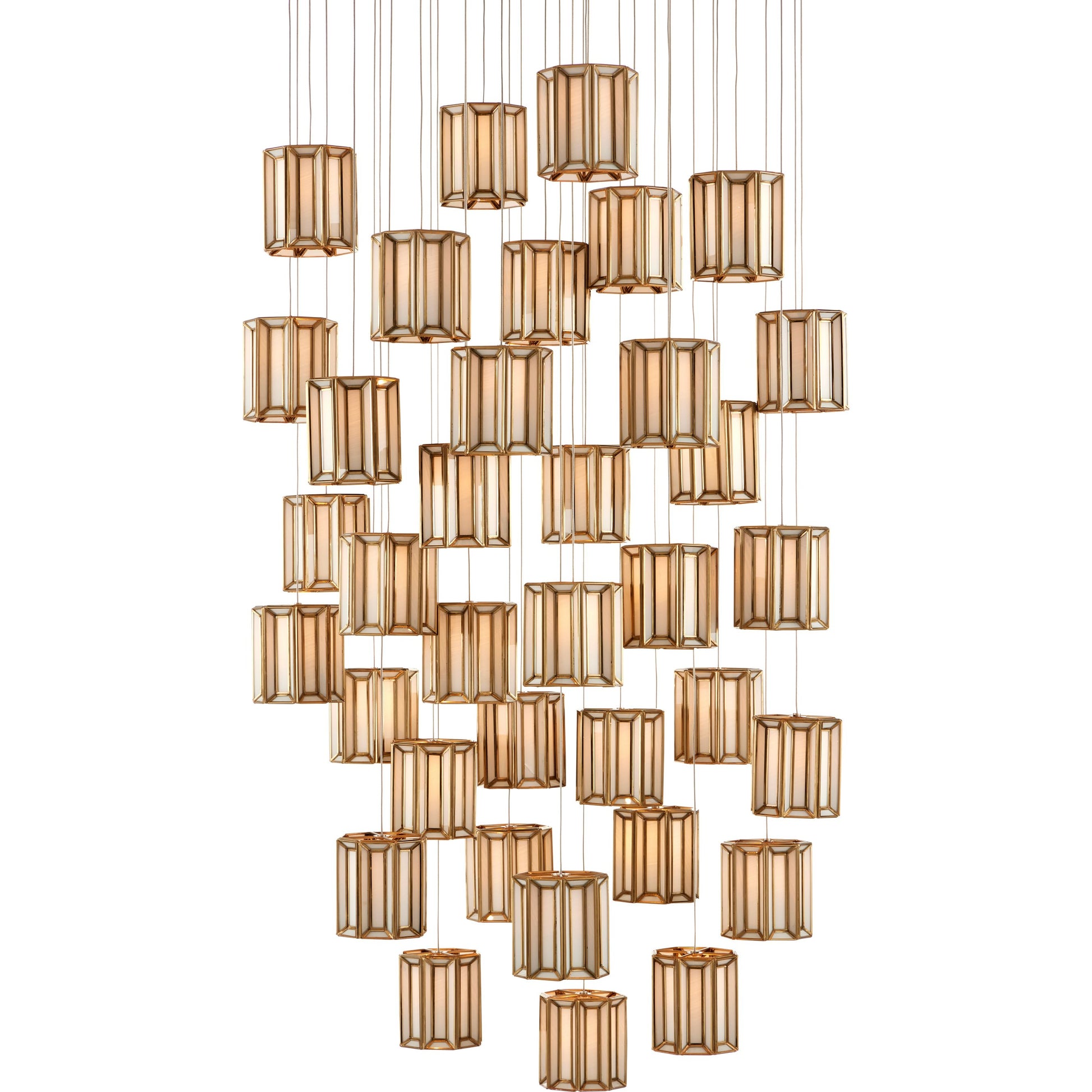 When a soft glow is desired, milk glass is one of the best materials to diffuse illumination. Our Daze 36-Light Multi-Drop Pendant is made of articulated panels of white milk glass that are joined together by ribs of metal in an antique brass finish. This brass and white multi-drop pendant, which joins a number of fixtures in the Daze family designed by Clarence Mallari, will turn luminous when it is switched on.