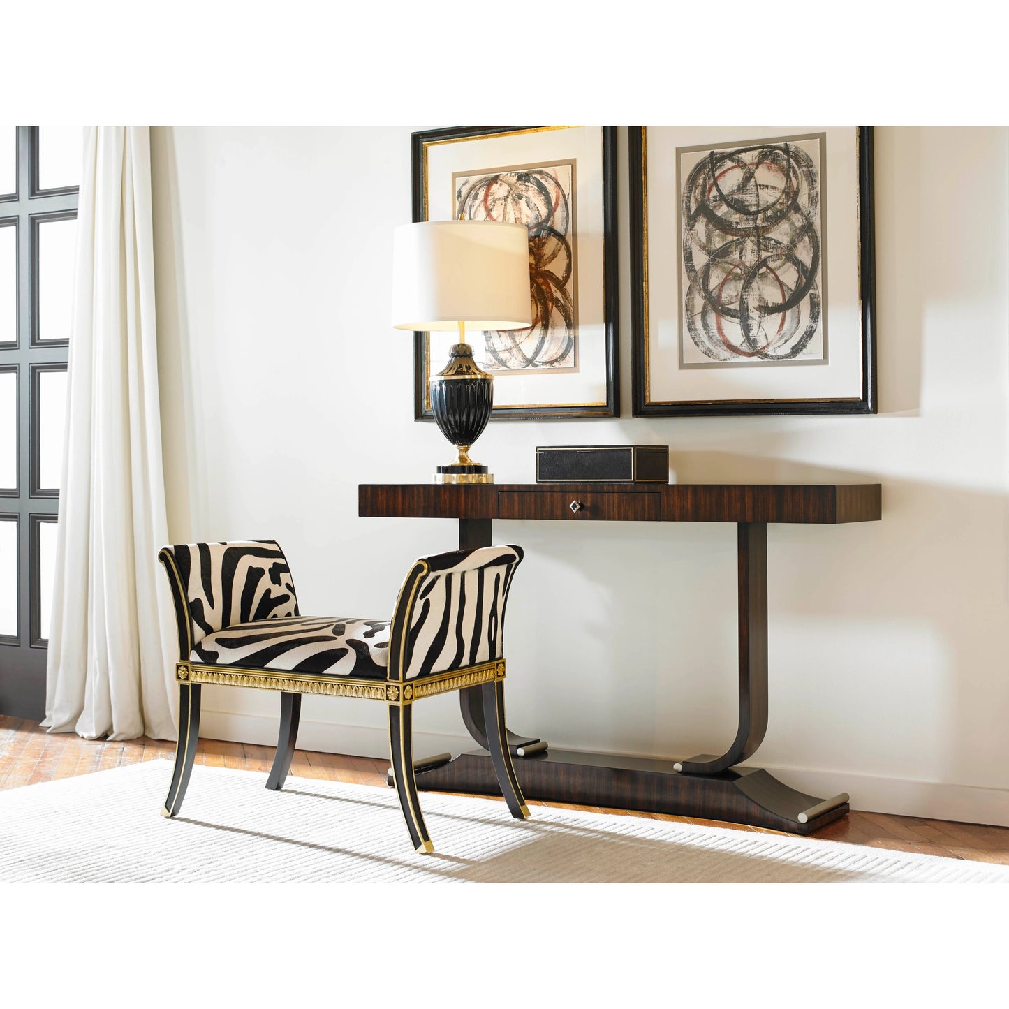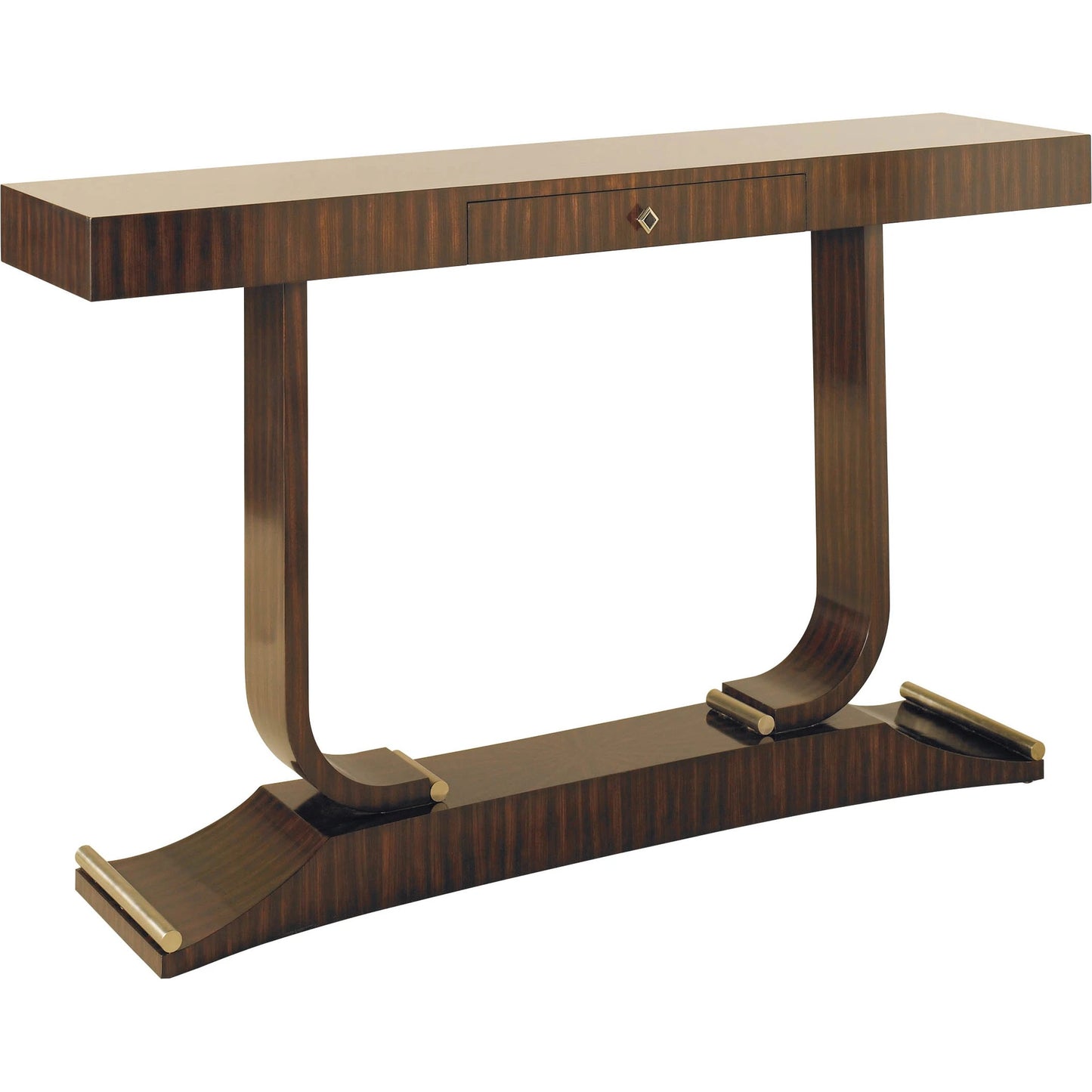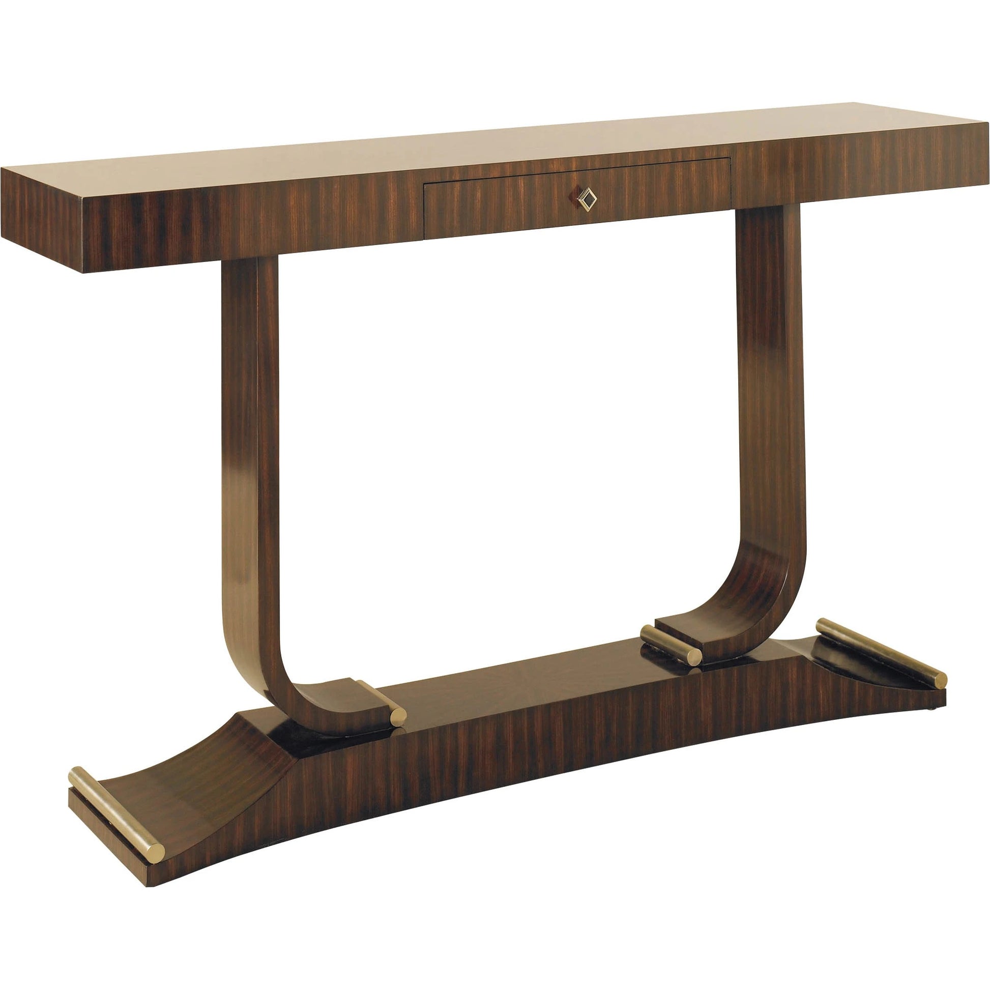 French Polish Ebony Zebrano Veneer Console Table, Brushed Satina Brass Accents.