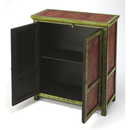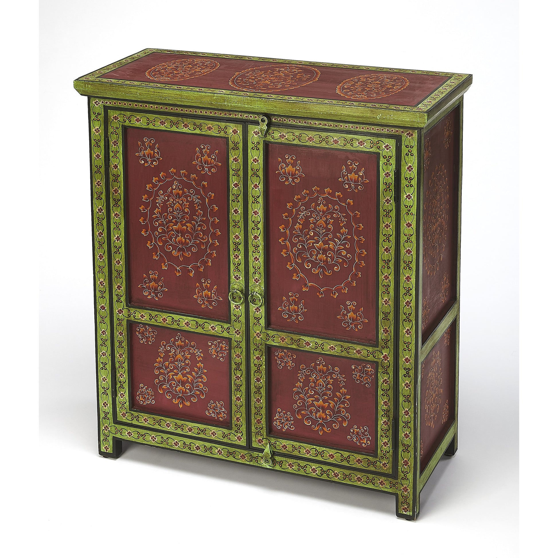 This wide cabinet comes with much storage space. Built from Meranti wood and MDF, it stands 30'' W x 13"D x 36"H. This hand painted piece offers a convenient spot to tuck away anything from seasonal clothes and spare linens to canned food and coffee cups. Beautiful hand painted floral patterns adorn all visable sides of this cabinet.Behind the door, you'll find single shelf for storage.