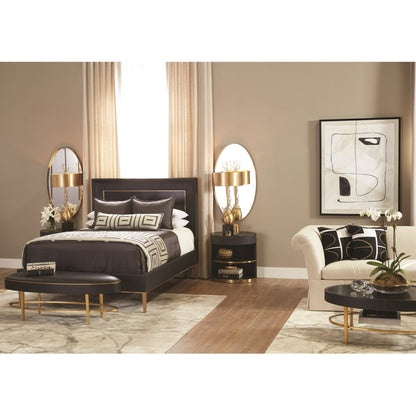 The Ellipse Bedside Cabinet is generously sized with a perfect ellipse shape made of stained American white oak veneers cut into quadrants to create a beautiful wood grain pattern. Covered in black or ivory leather and brass-plated steel.