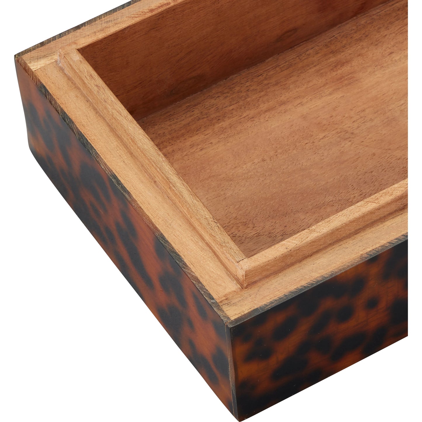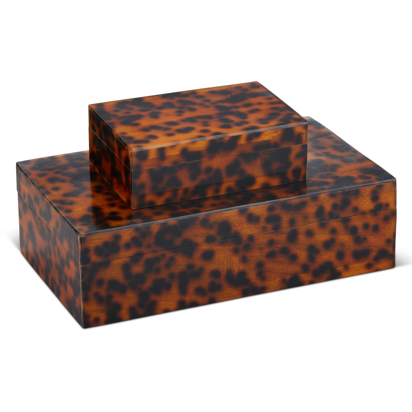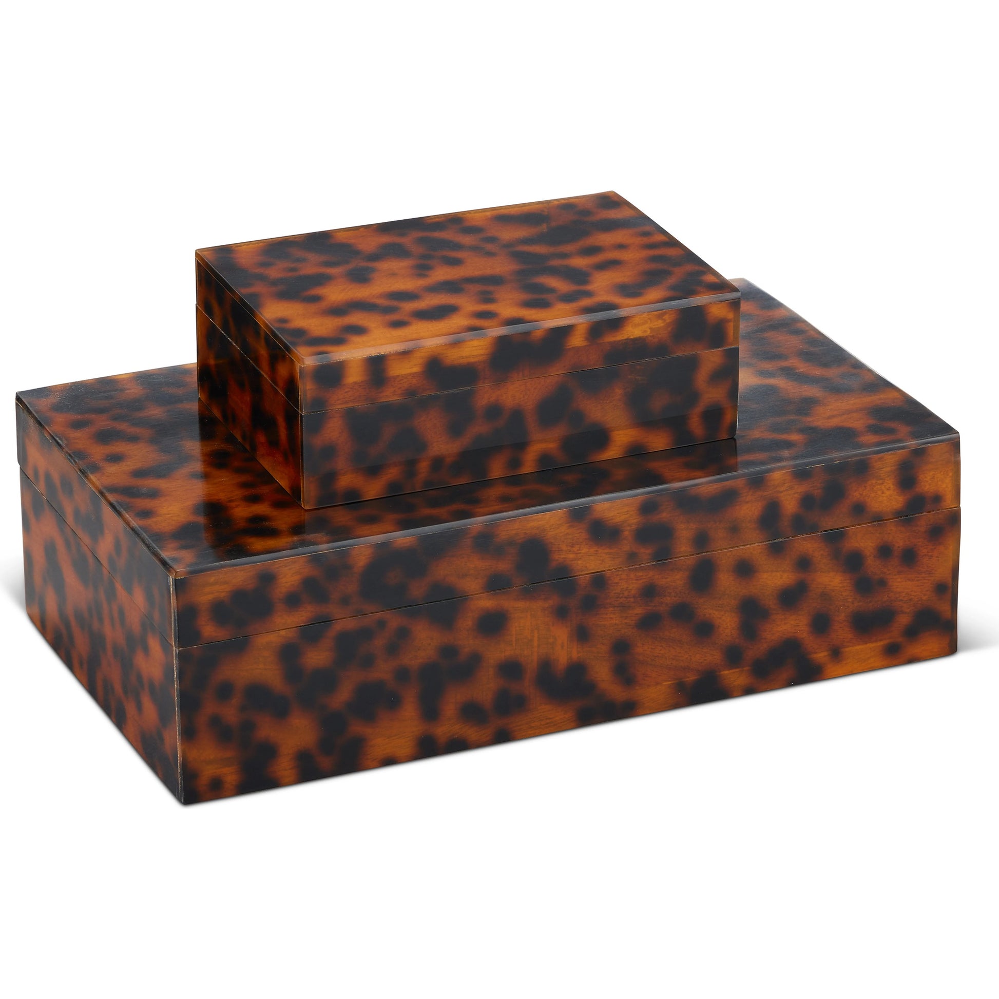 The Faux Tortoise Box Set is made of black and brown mottled composite. The chic pattern has been popular in interiors for centuries, which makes these brown decorative boxes timeless. Adding interest and texture to a room, tortoiseshell acts as a neutral, so it works with any color scheme and every design style from modern to traditional. These boxes will be durable because they have solid wood interiors.