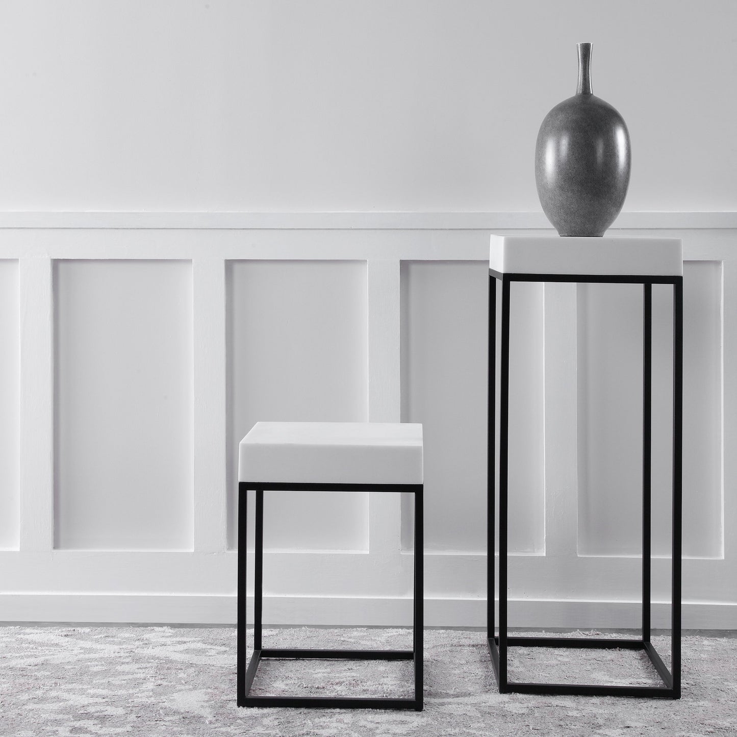 This Modern Plant Stand Combines A White Marble Look, Atop A Simple Steel Base Finished In Aged Black.