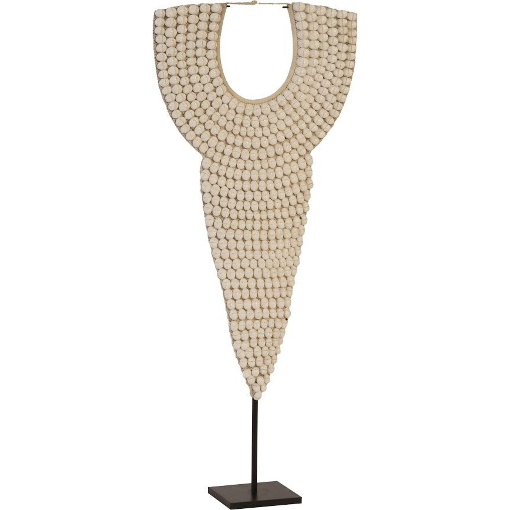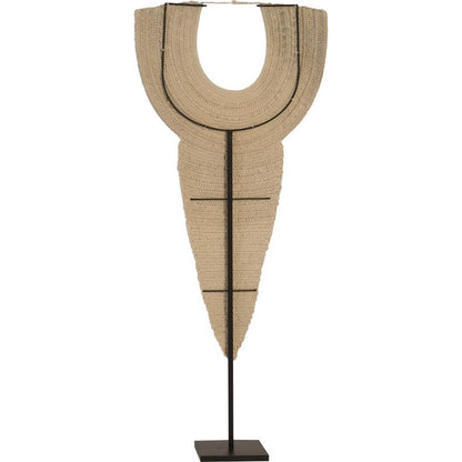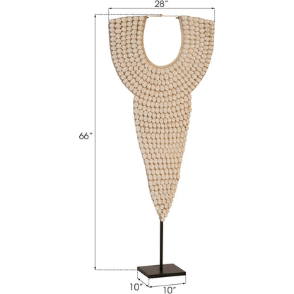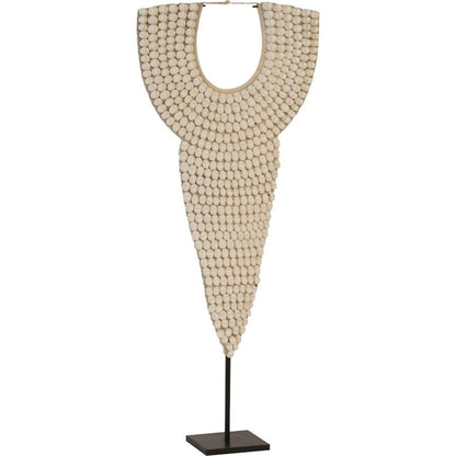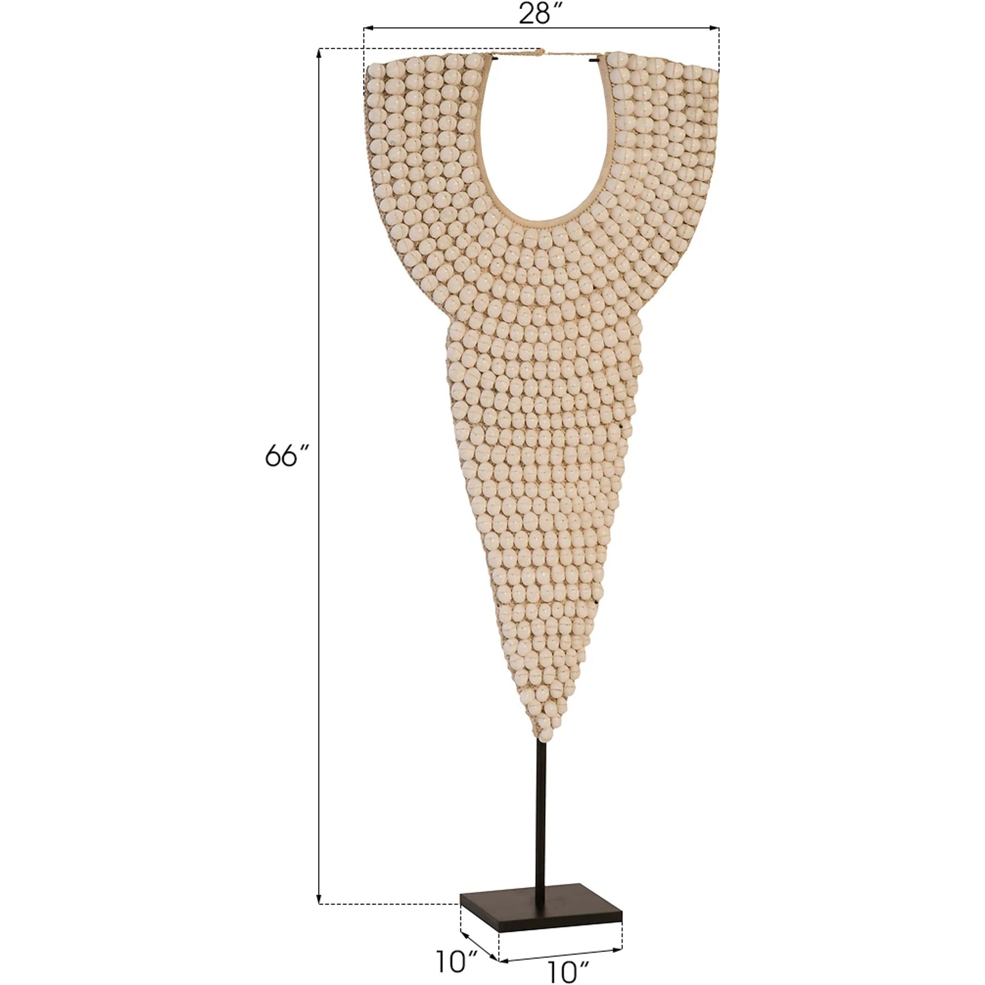 The Giant Shell Necklace Sculpture is handmade with natural shells threaded through a neutral fabric. Displayed on a metal stand, this colossal necklace can stand alone as a floor sculpture, or be place on a table as an oversized accent piece.