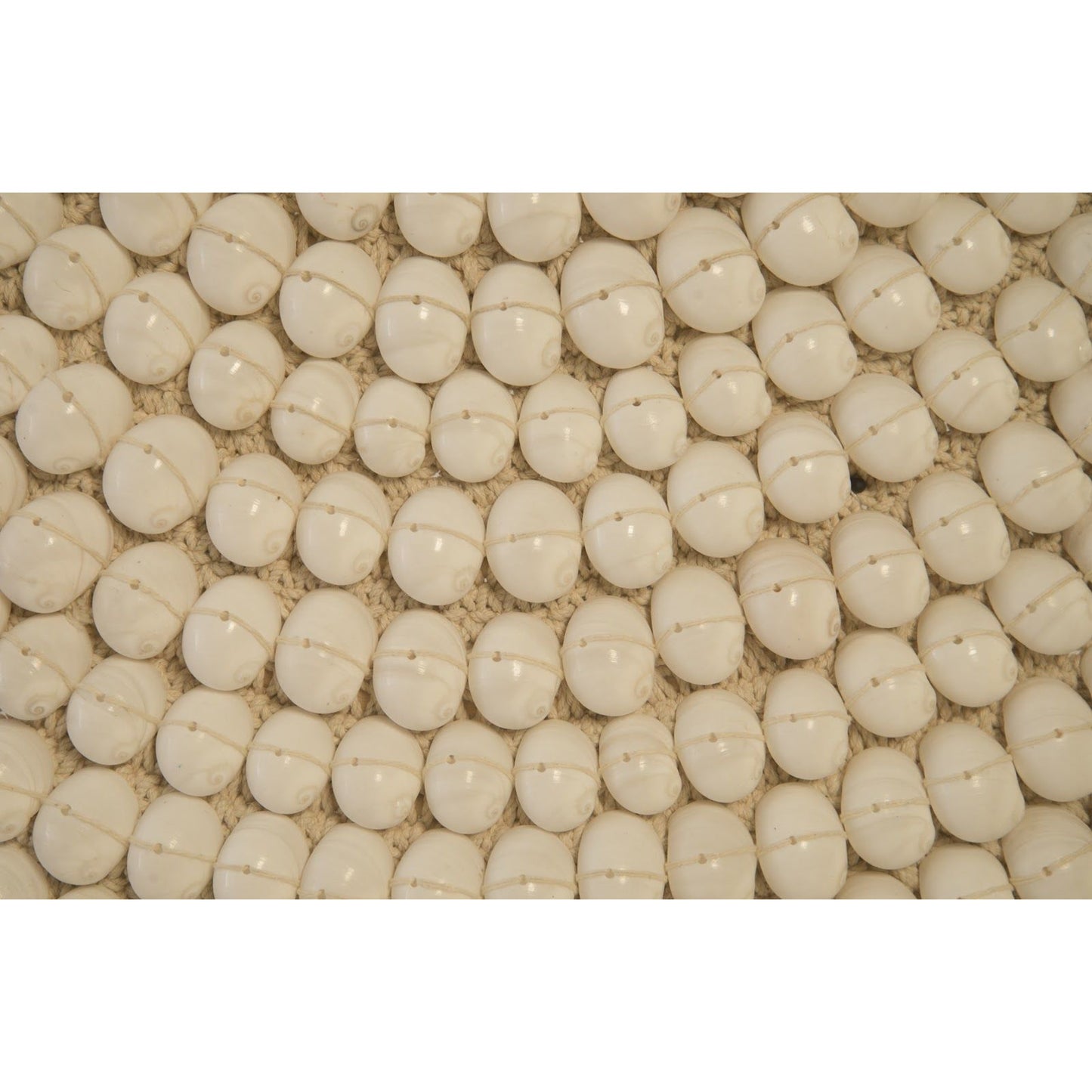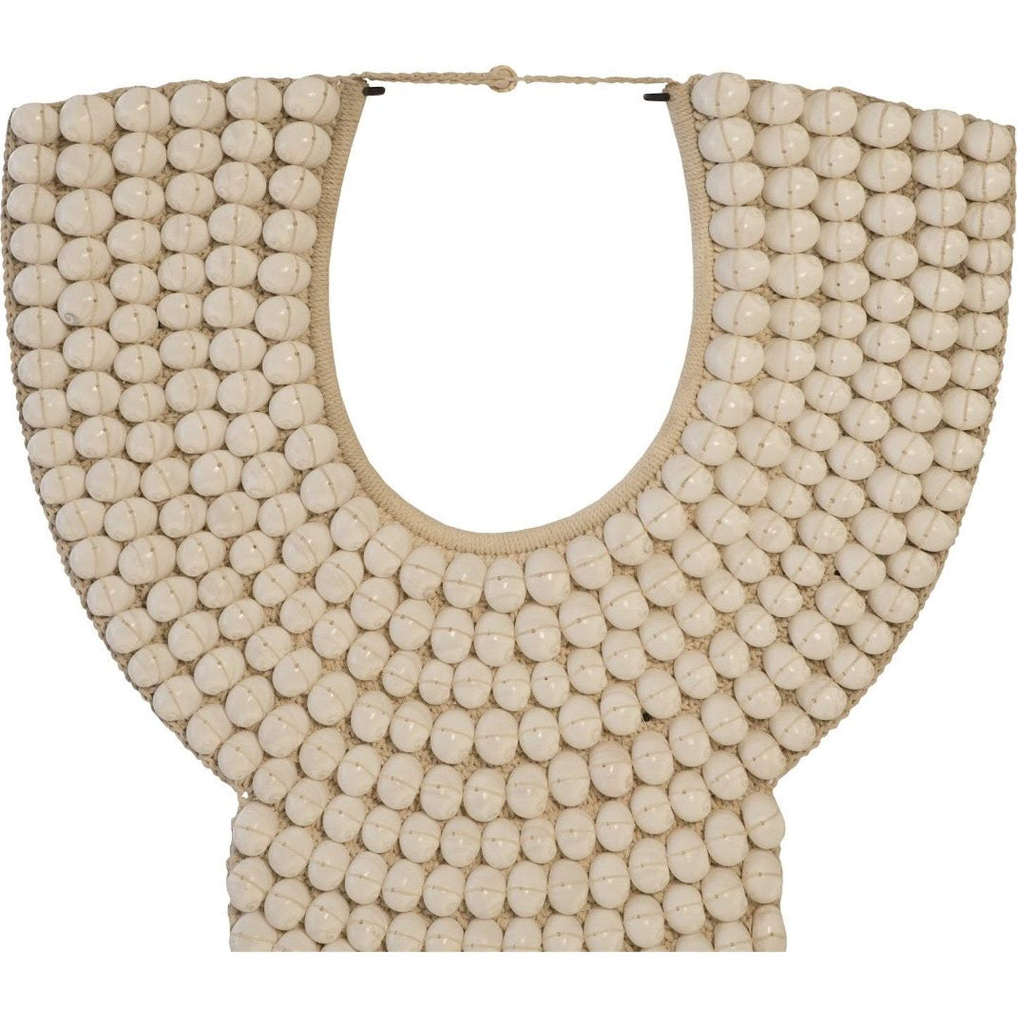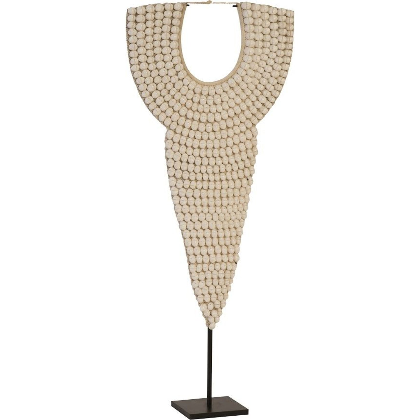 The Giant Shell Necklace Sculpture is handmade with natural shells threaded through a neutral fabric. Displayed on a metal stand, this colossal necklace can stand alone as a floor sculpture, or be place on a table as an oversized accent piece.