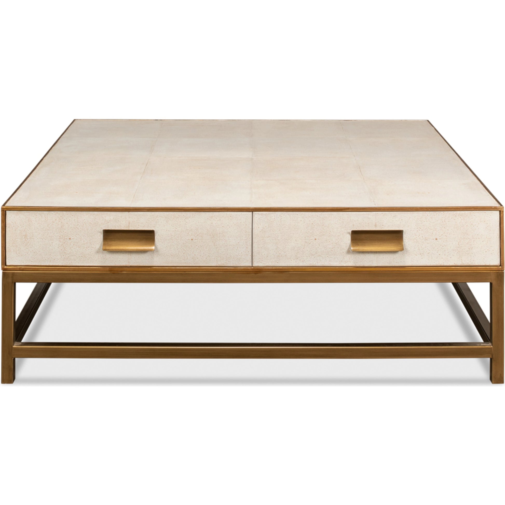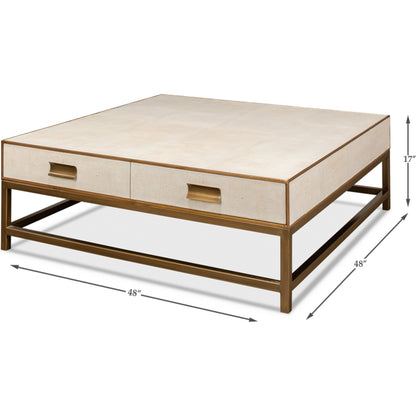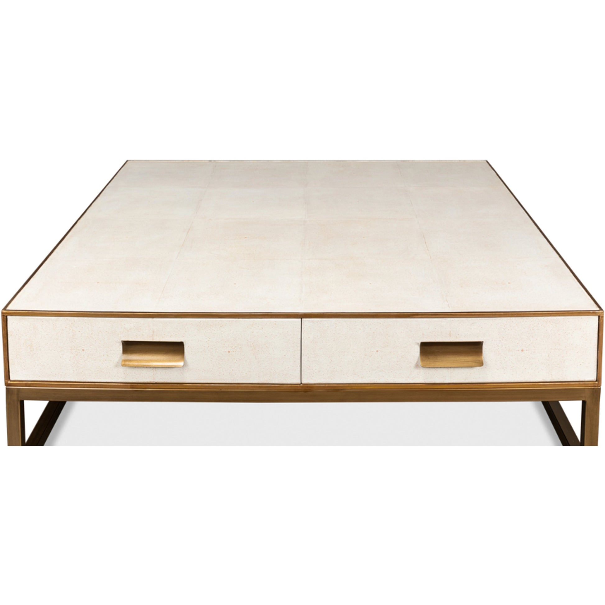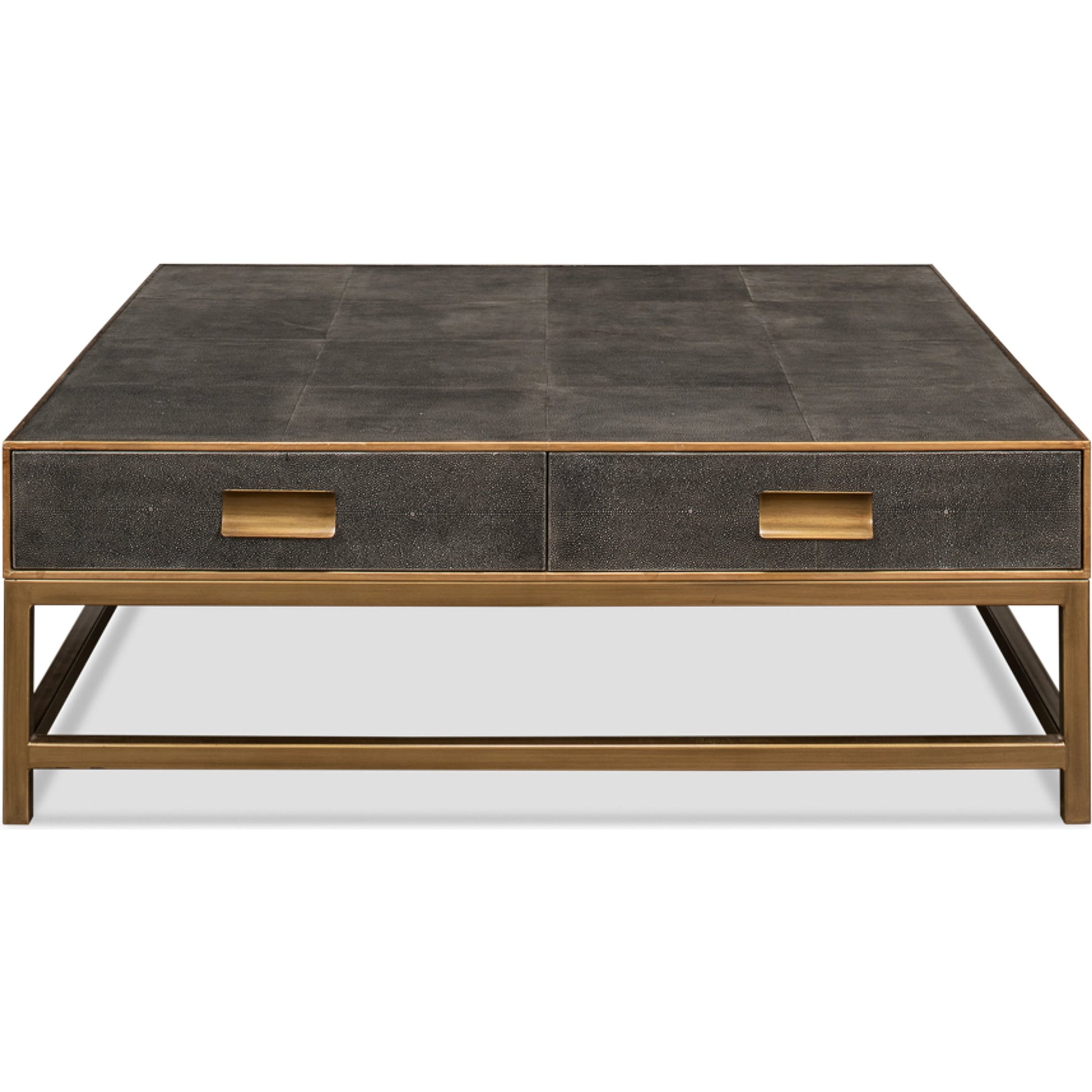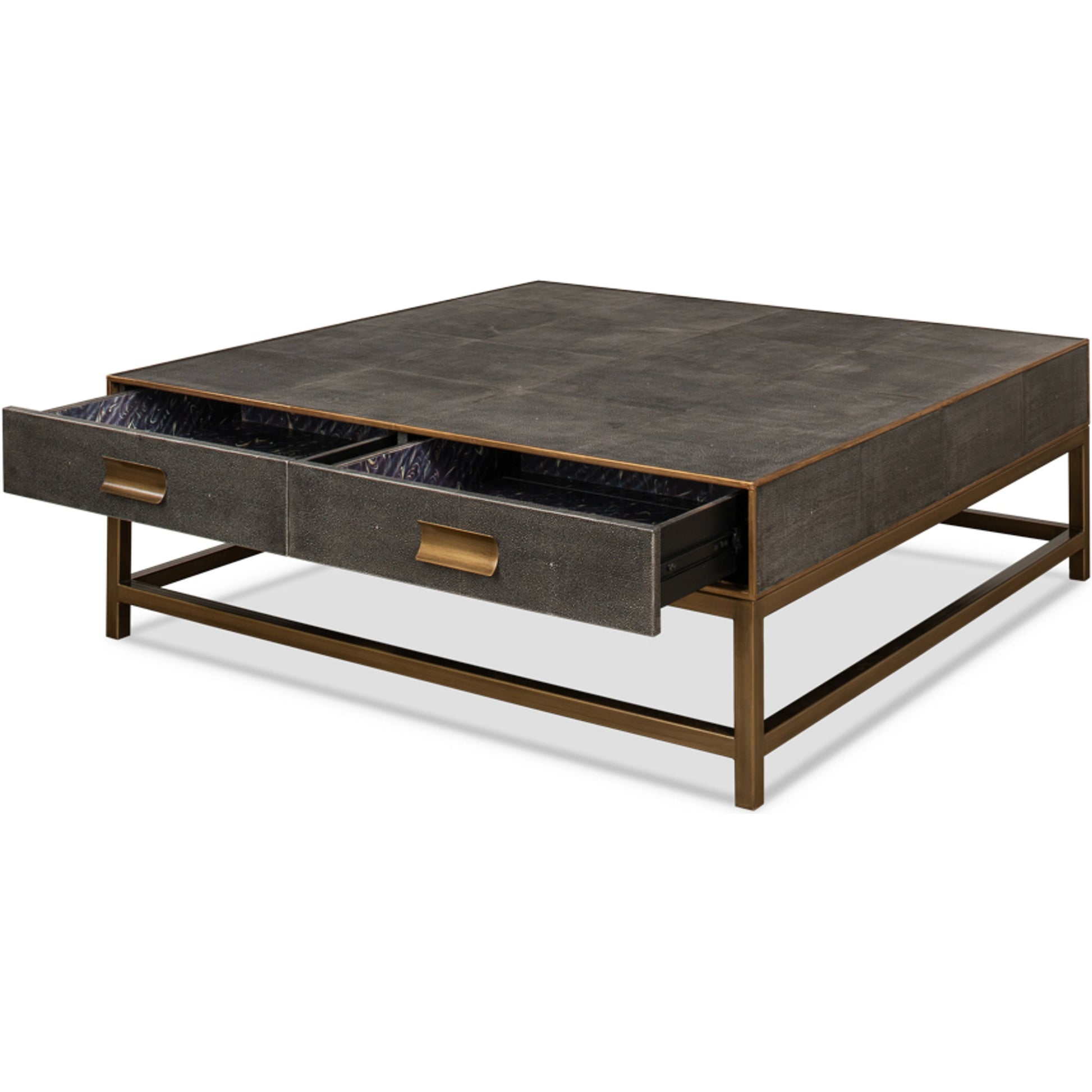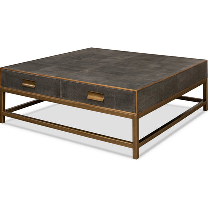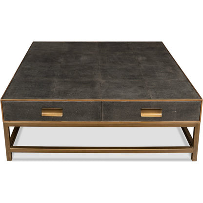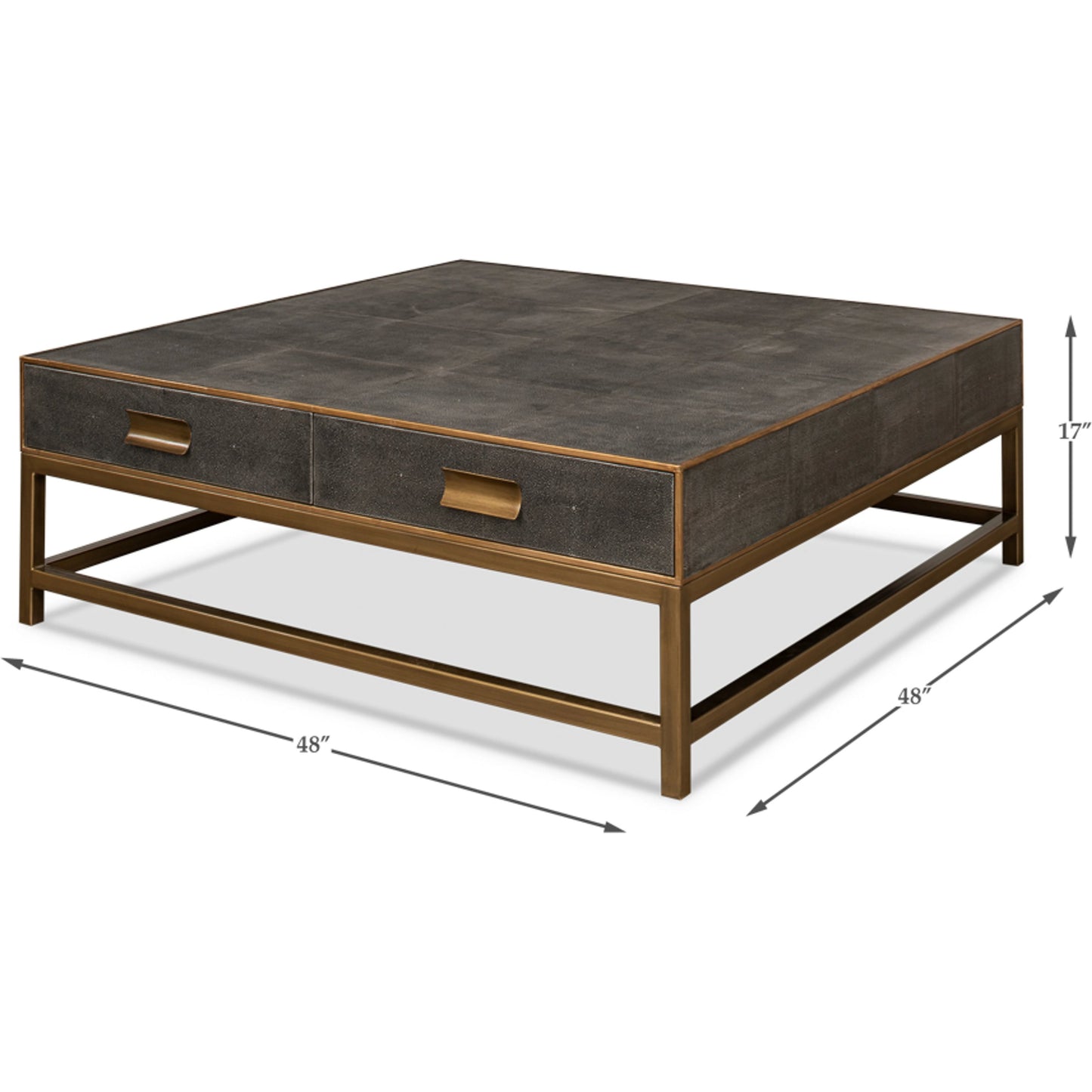 Unveil contemporary love with the Gideon Shagreen Square Coffee Table in Antique Grey. Crafted in wood, adorned with gold leather trim, and brass knobs, it's where romance meets modern sophistication.