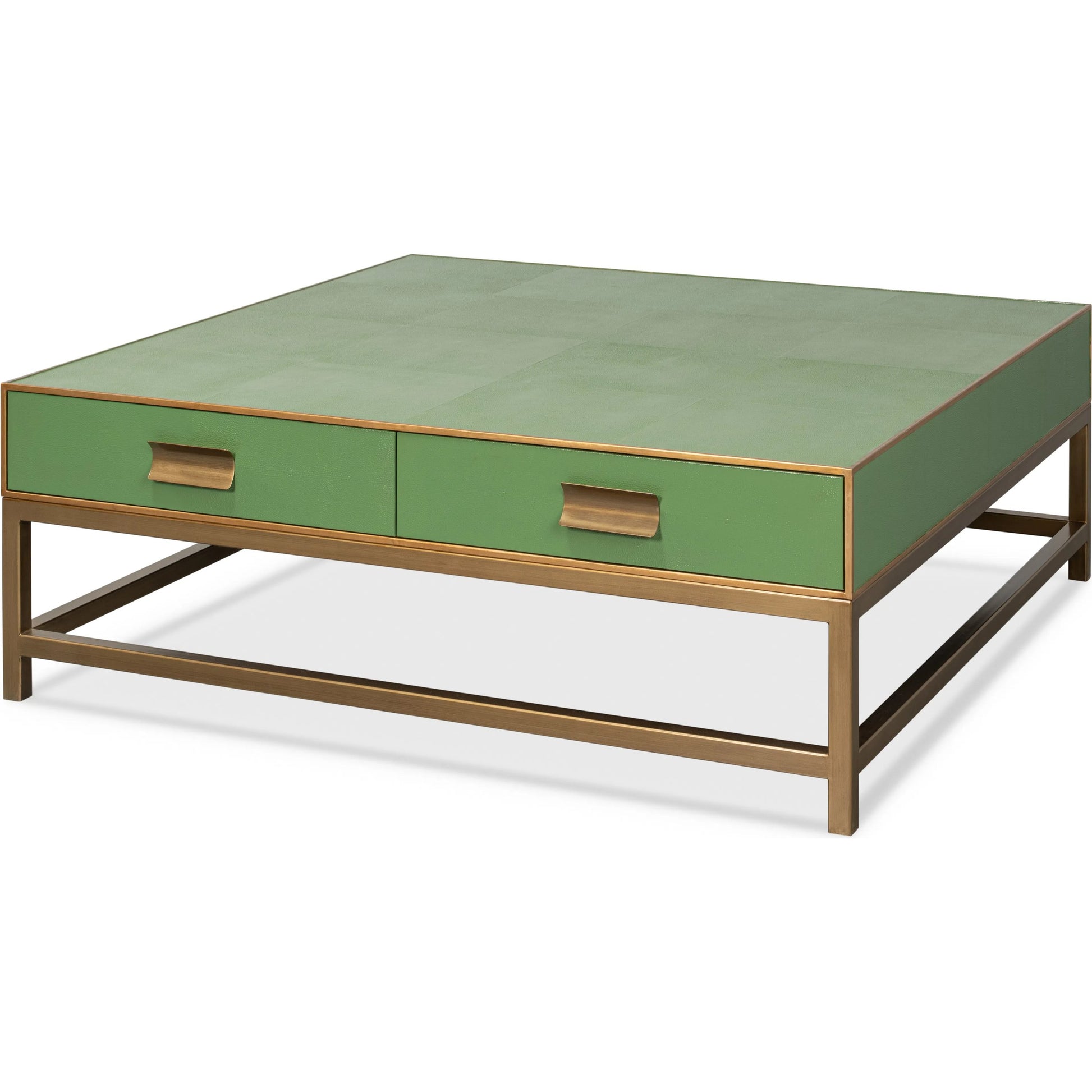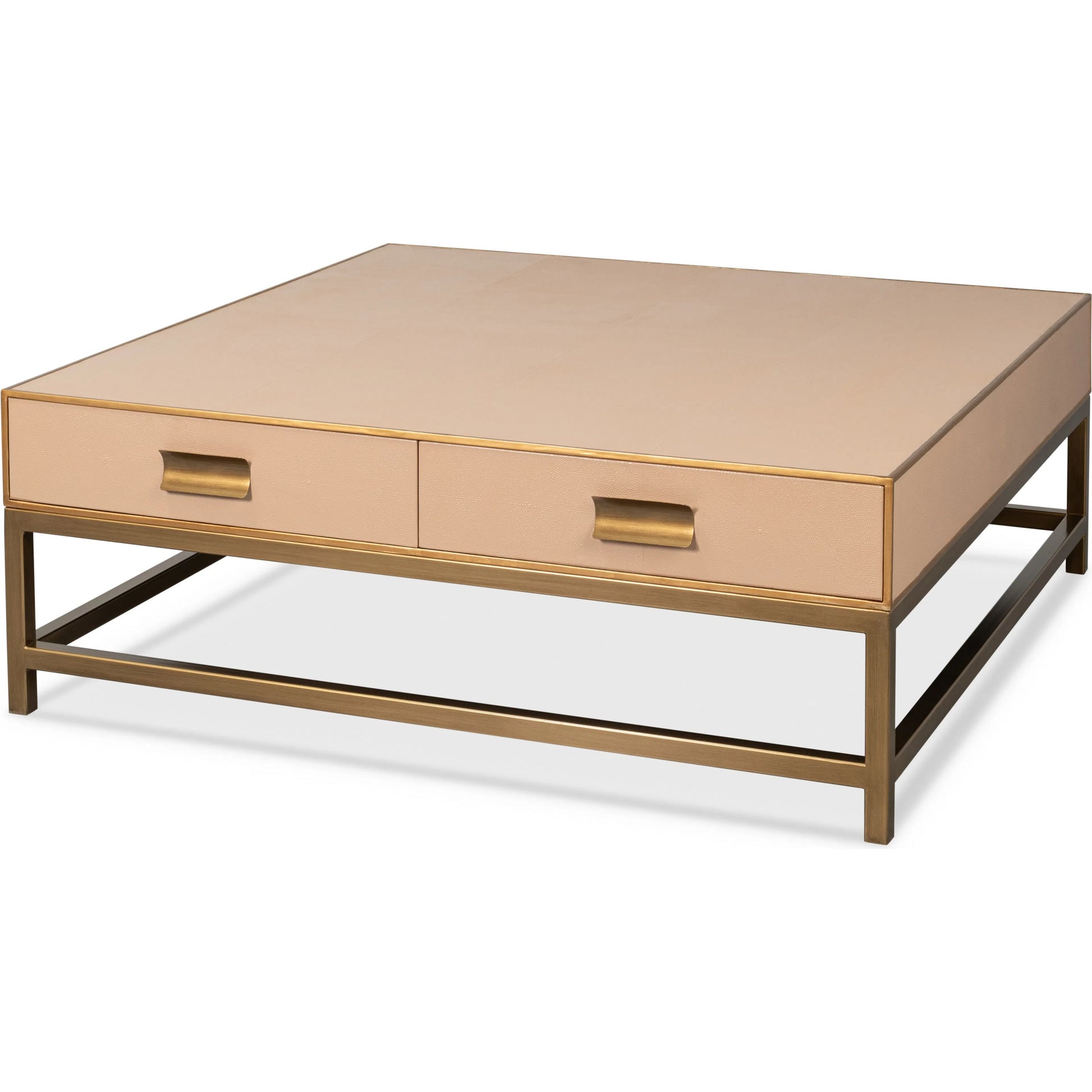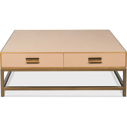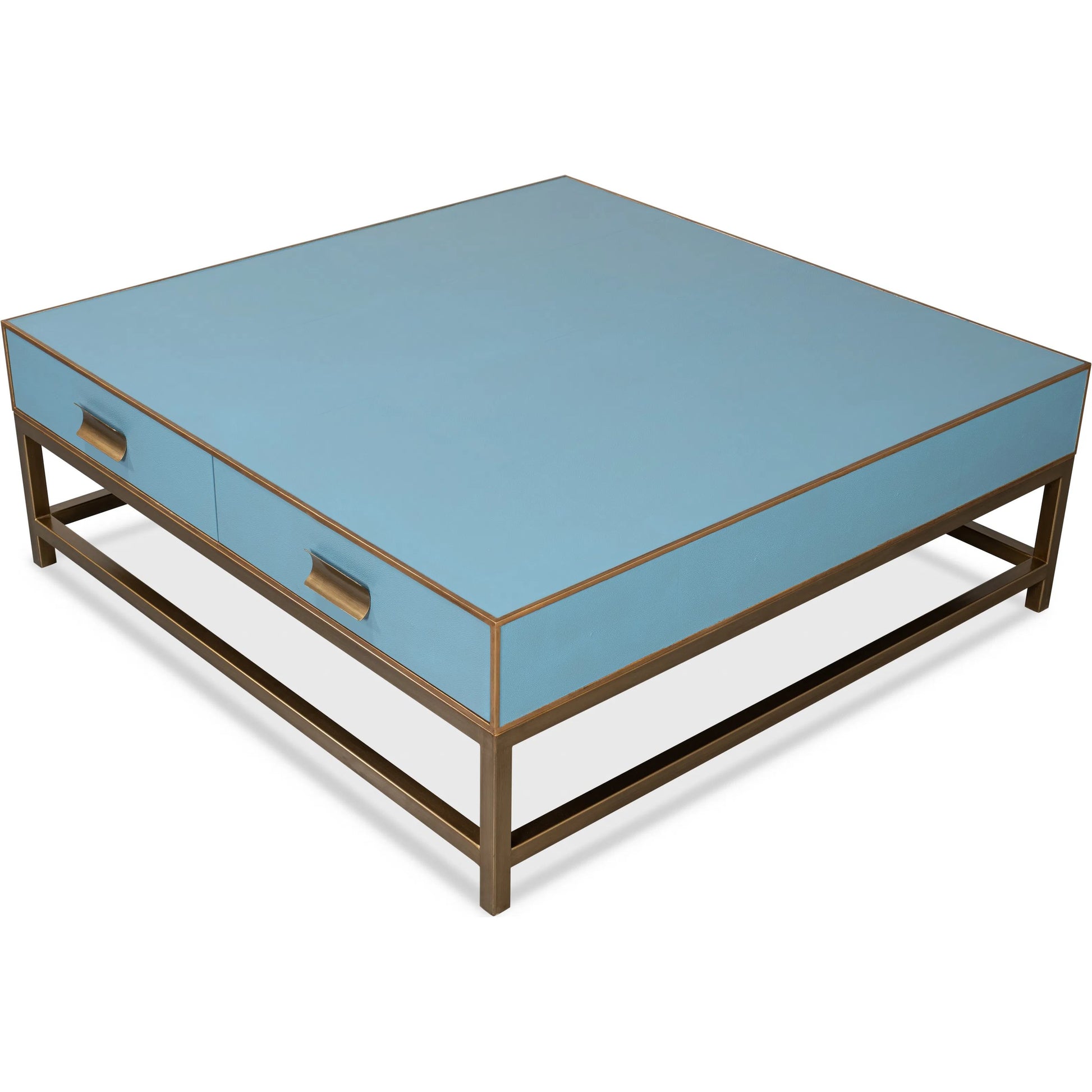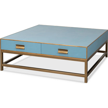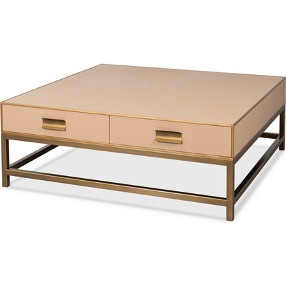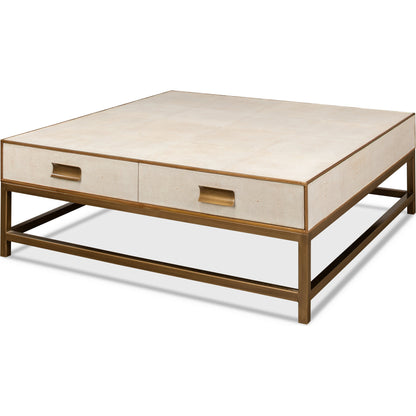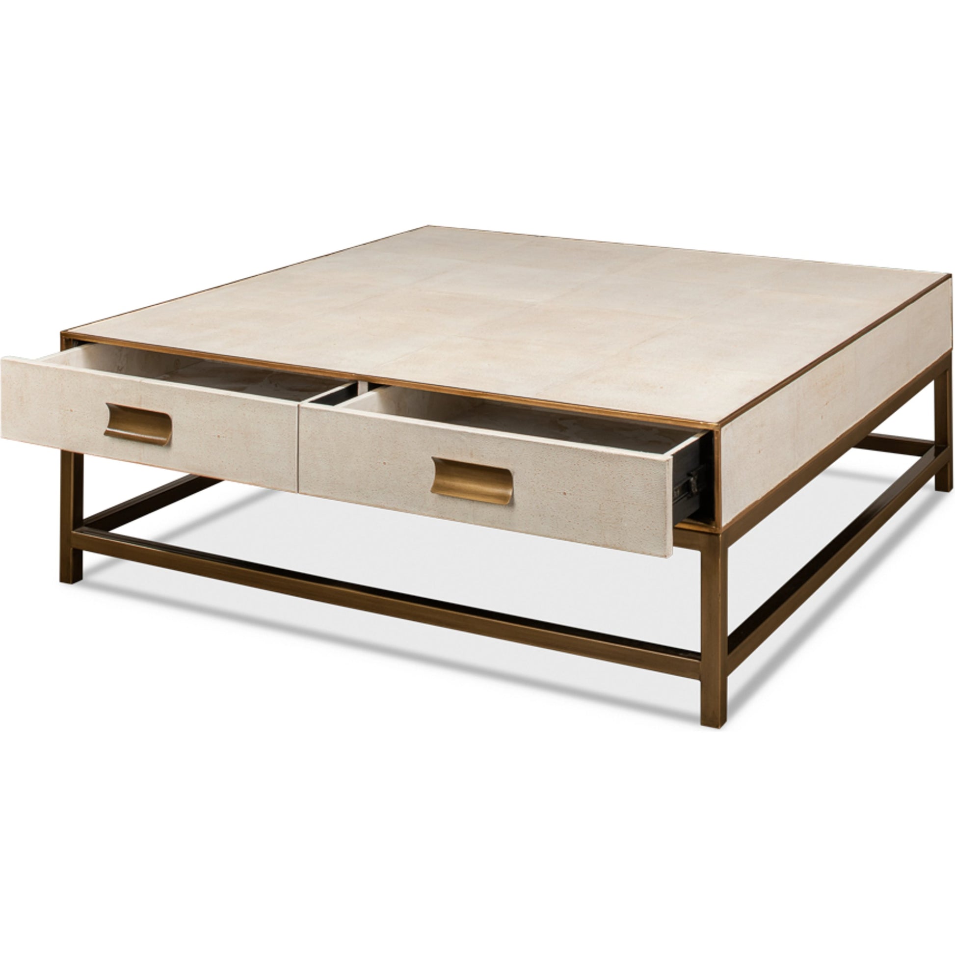 Unveil contemporary love with the Gideon Shagreen Square Coffee Table in Antique Grey. Crafted in wood, adorned with gold leather trim, and brass knobs, it's where romance meets modern sophistication.