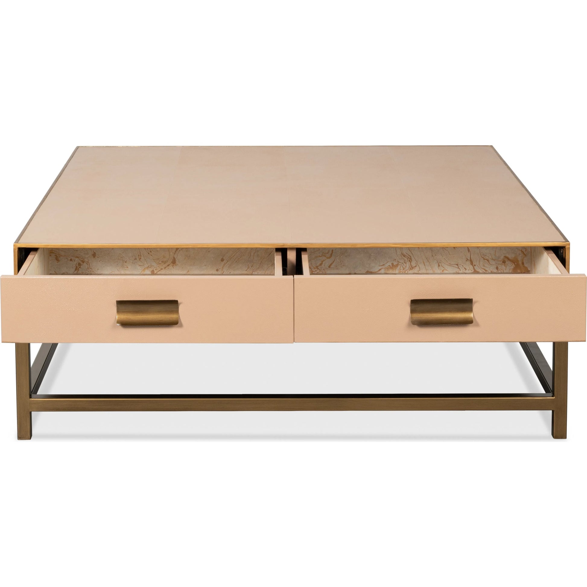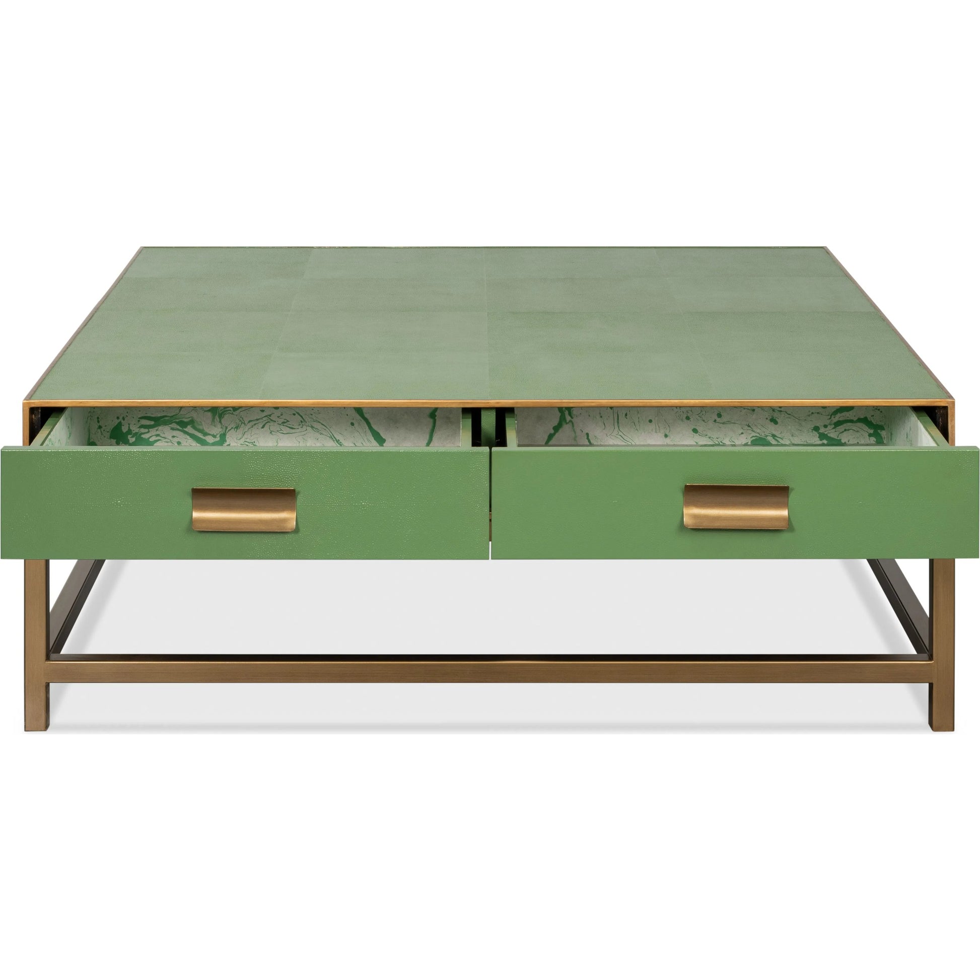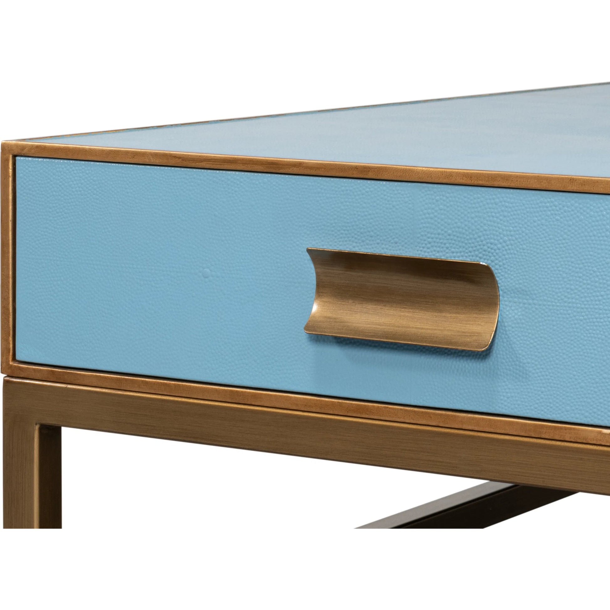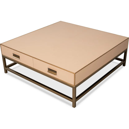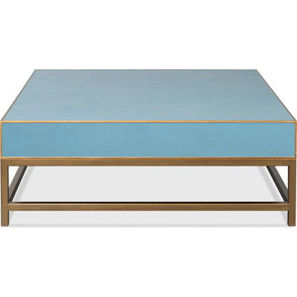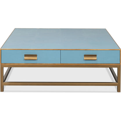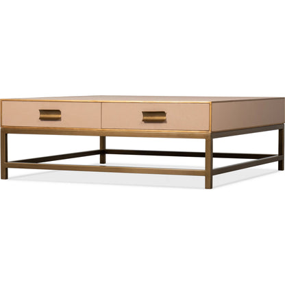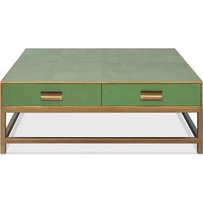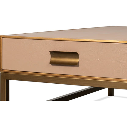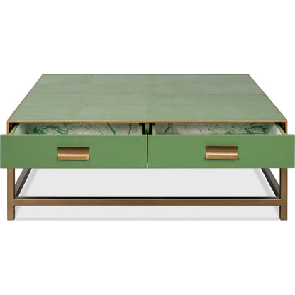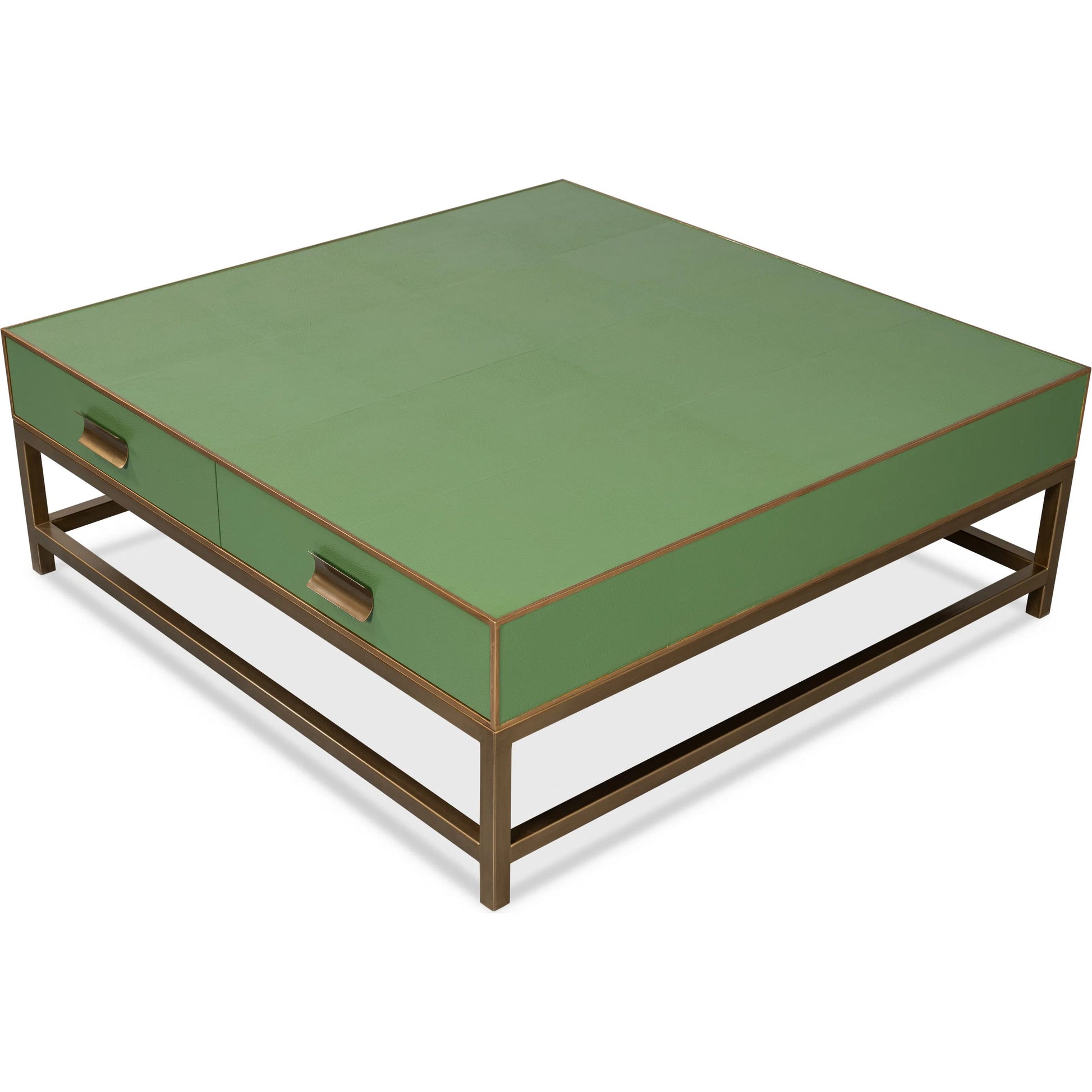 Unveil contemporary love with the Gideon Shagreen Square Coffee Table in Antique Grey. Crafted in wood, adorned with gold leather trim, and brass knobs, it's where romance meets modern sophistication.
