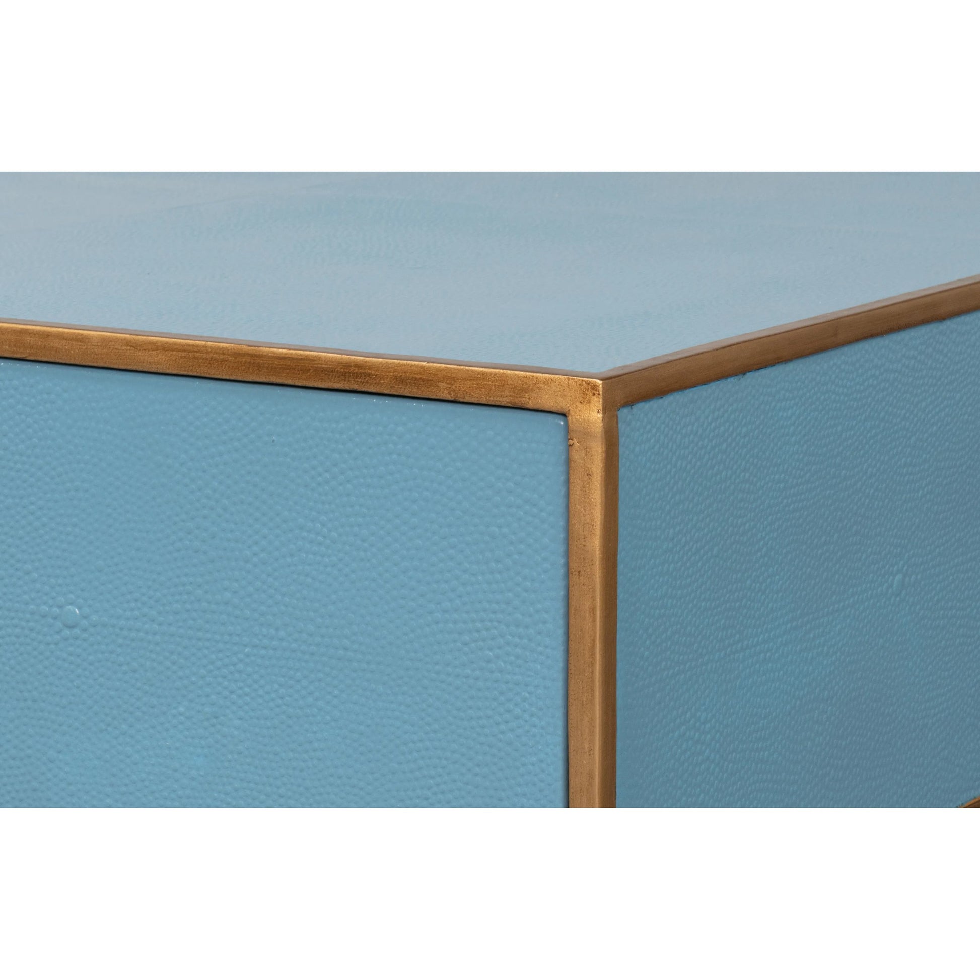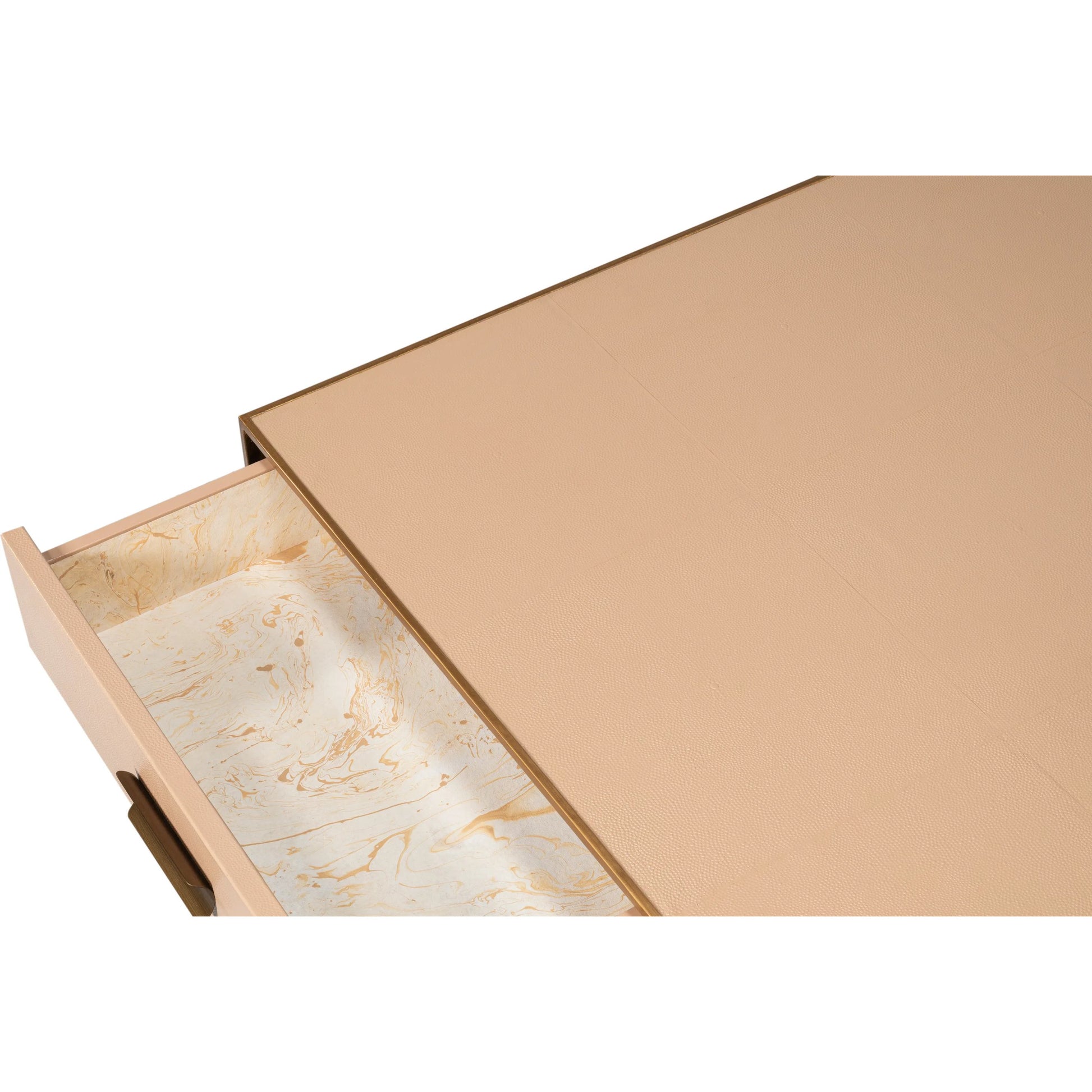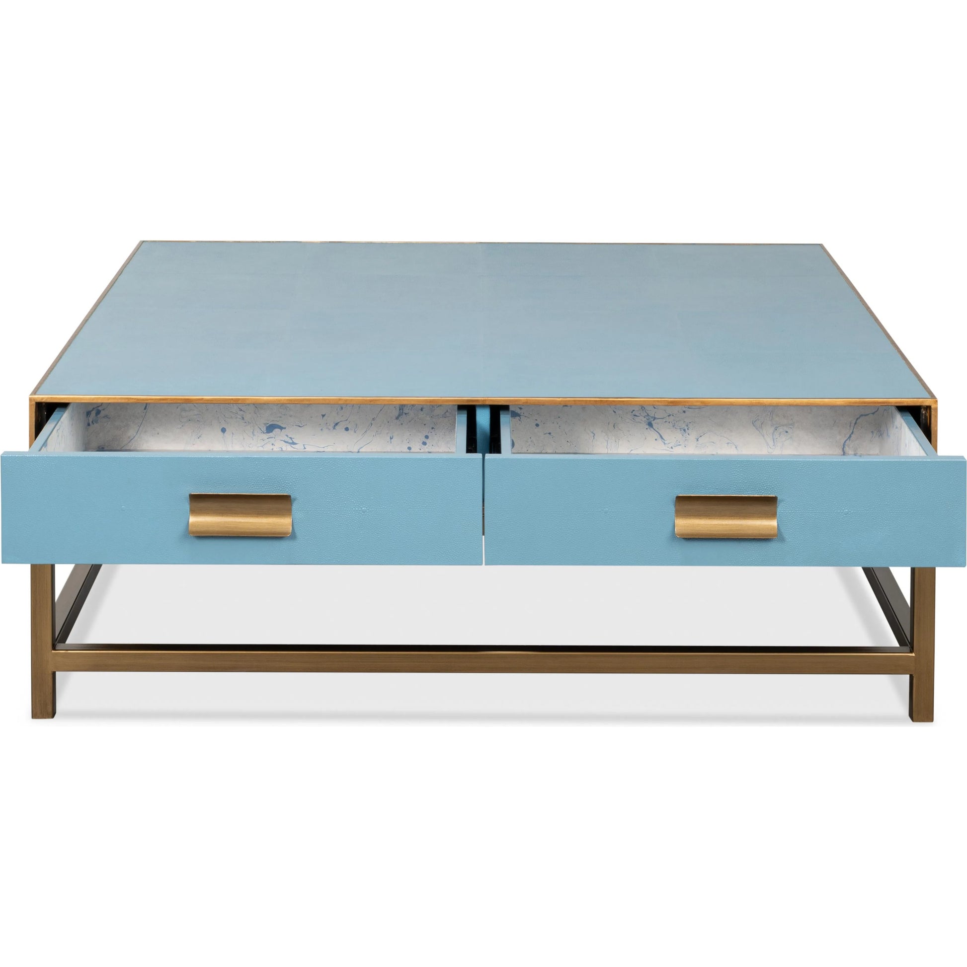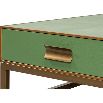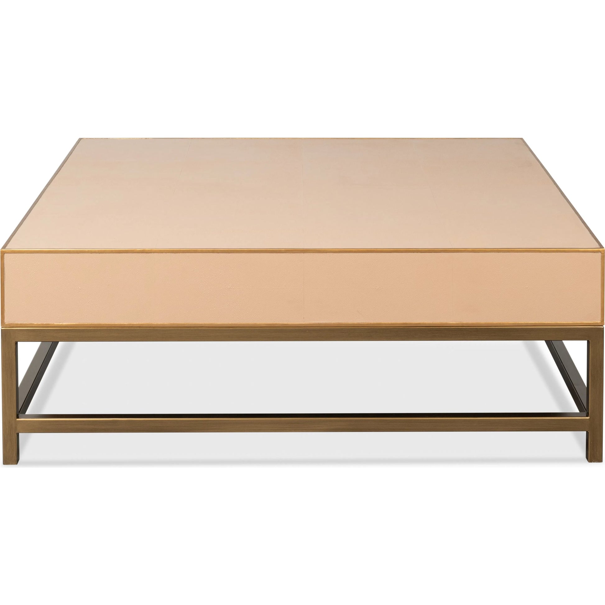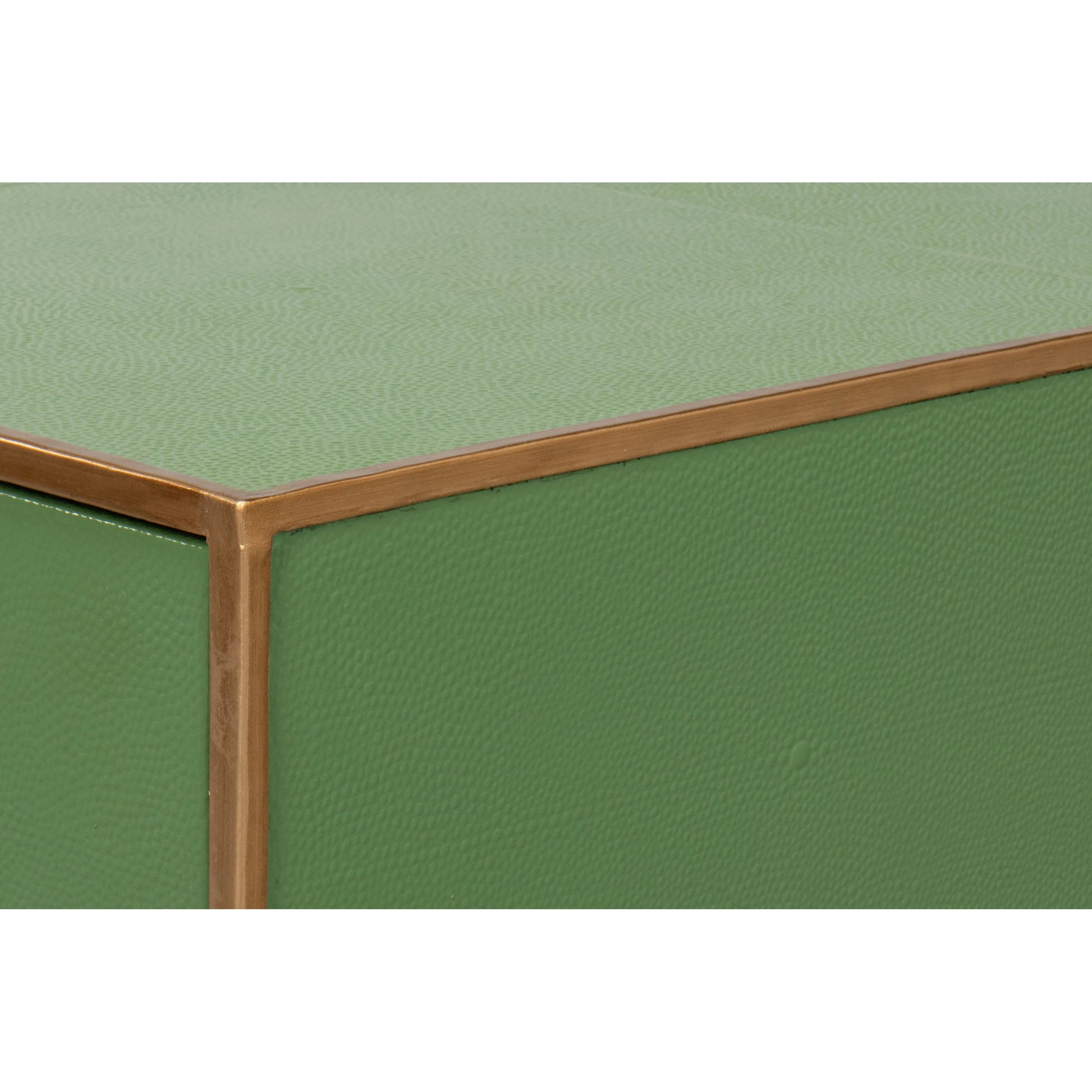 Unveil contemporary love with the Gideon Shagreen Square Coffee Table in Antique Grey. Crafted in wood, adorned with gold leather trim, and brass knobs, it's where romance meets modern sophistication.