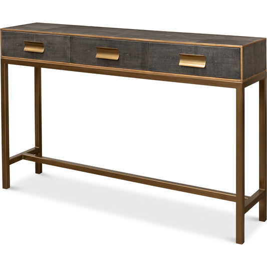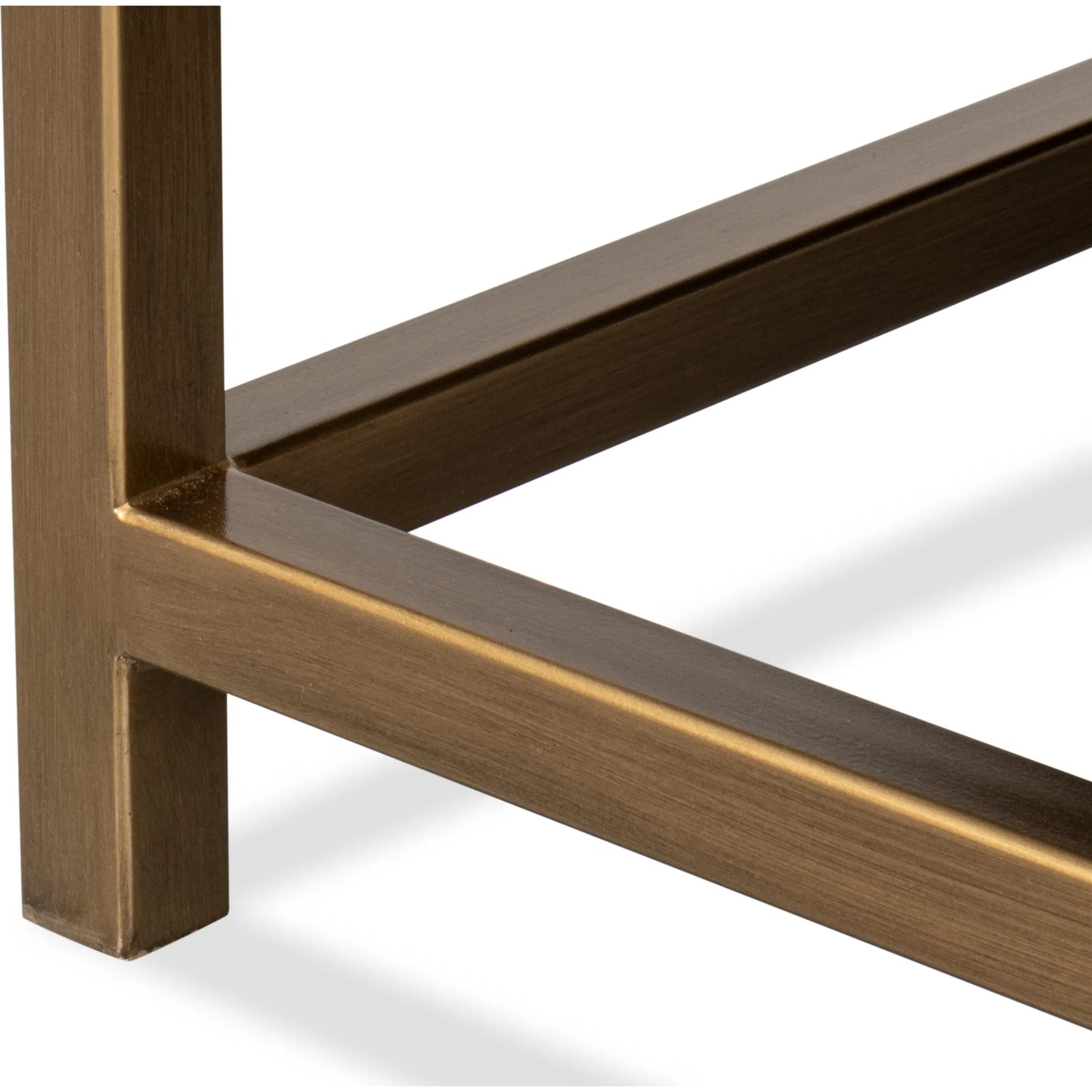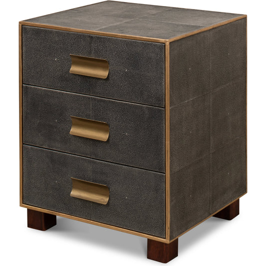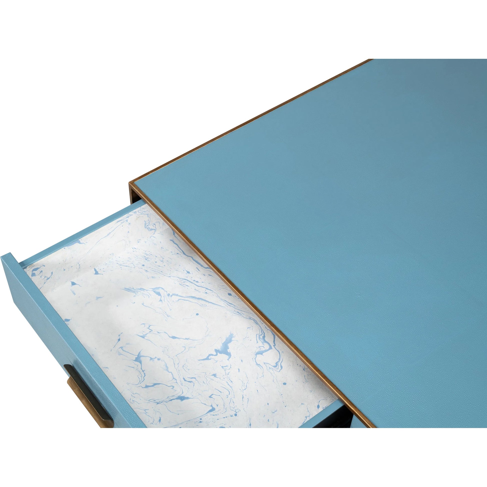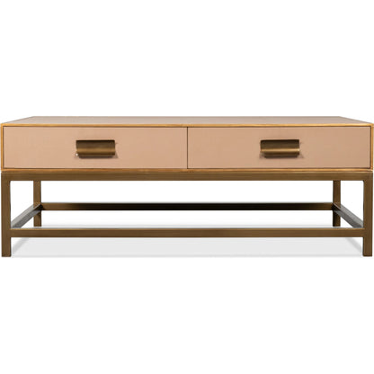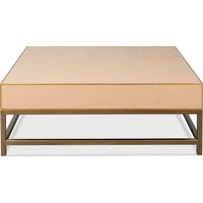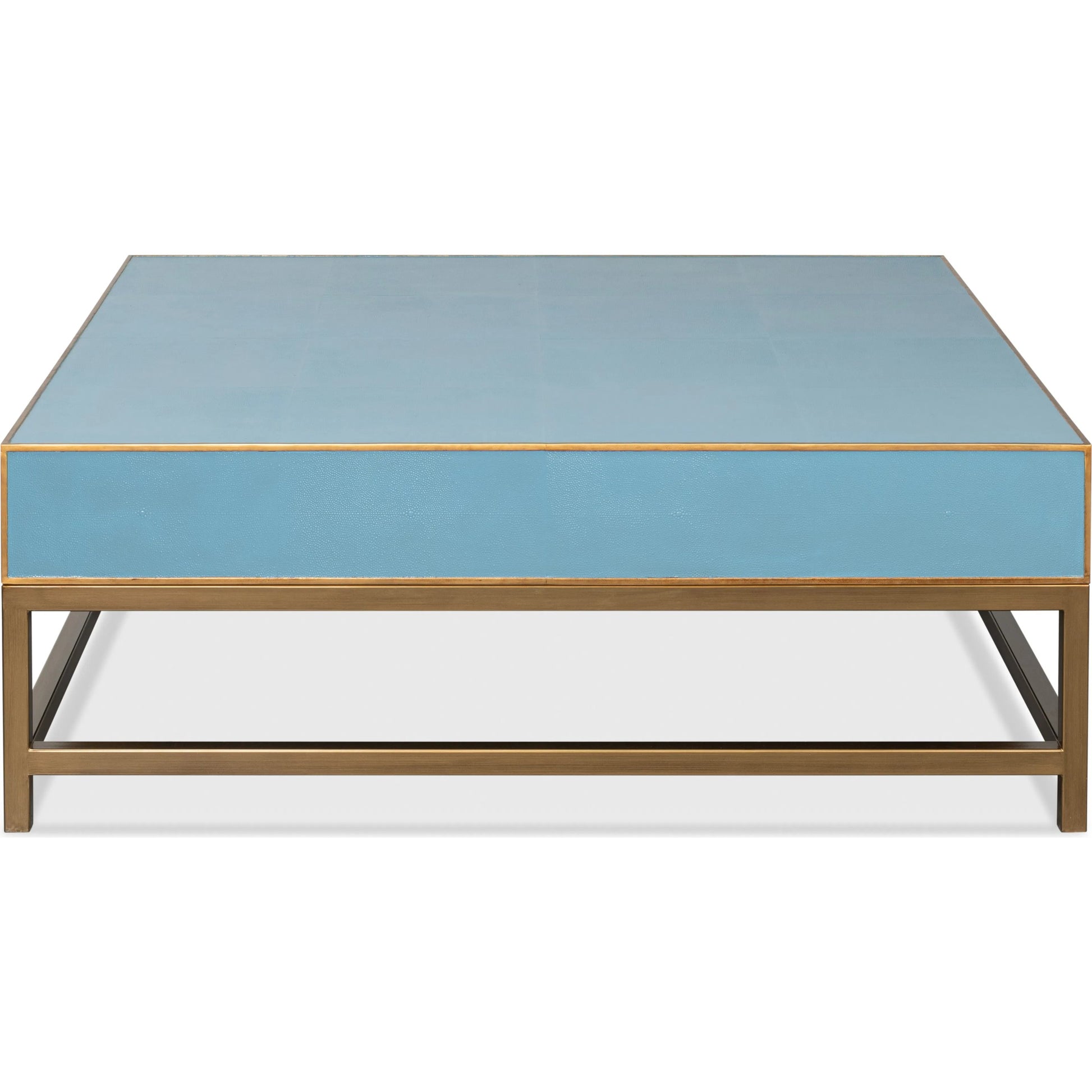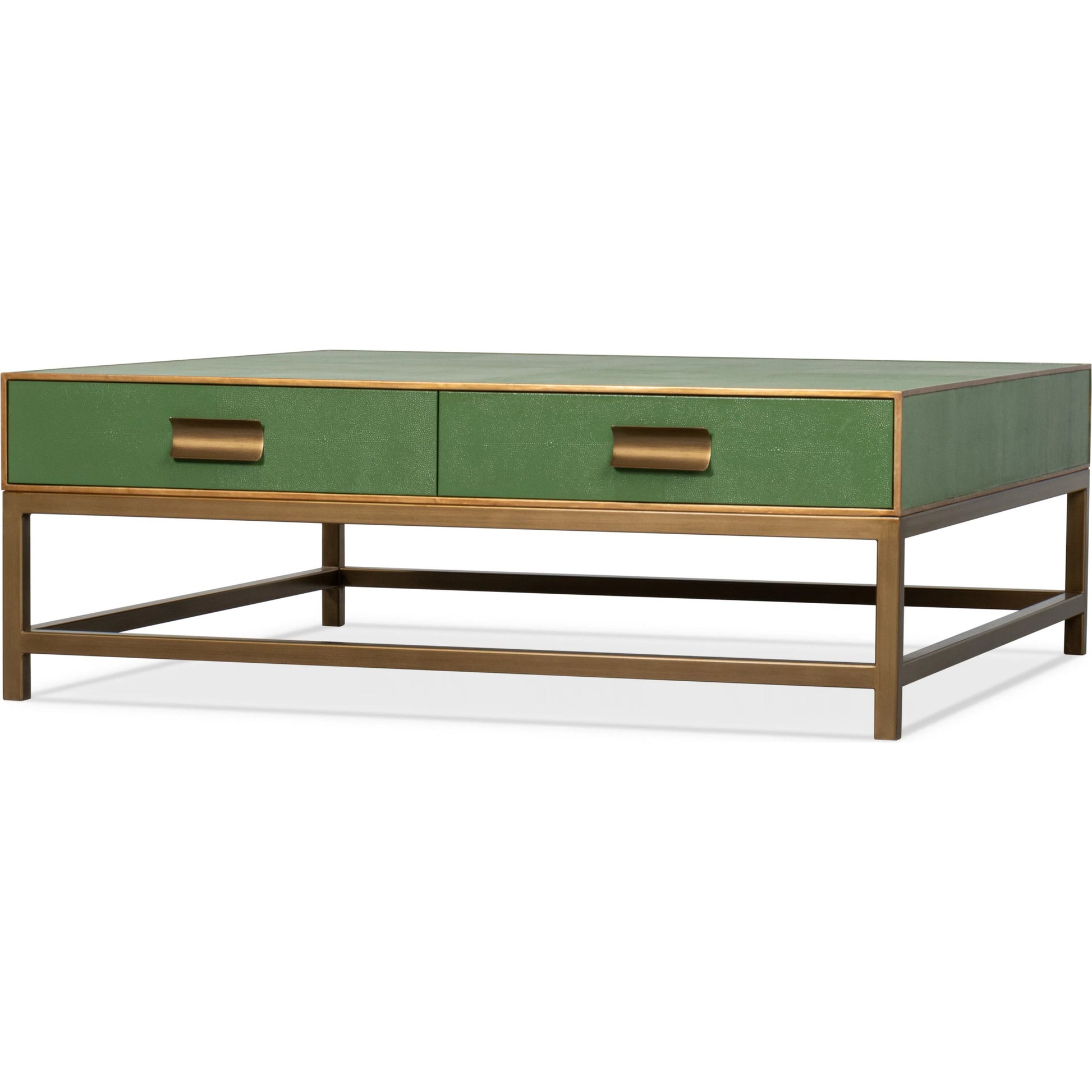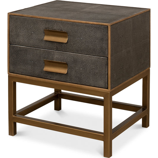 Unveil contemporary love with the Gideon Shagreen Square Coffee Table in Antique Grey. Crafted in wood, adorned with gold leather trim, and brass knobs, it's where romance meets modern sophistication.