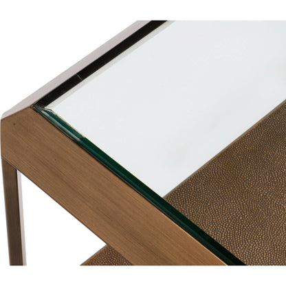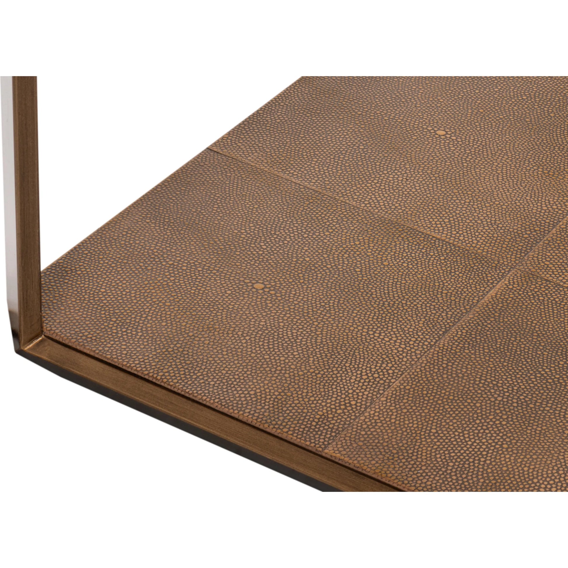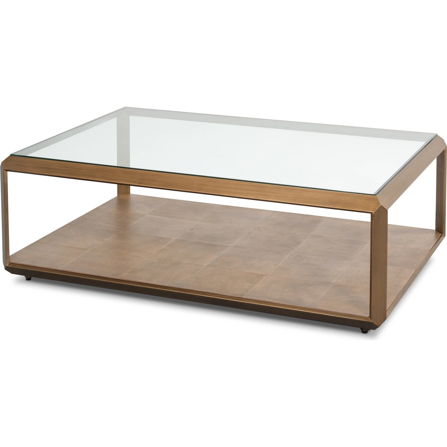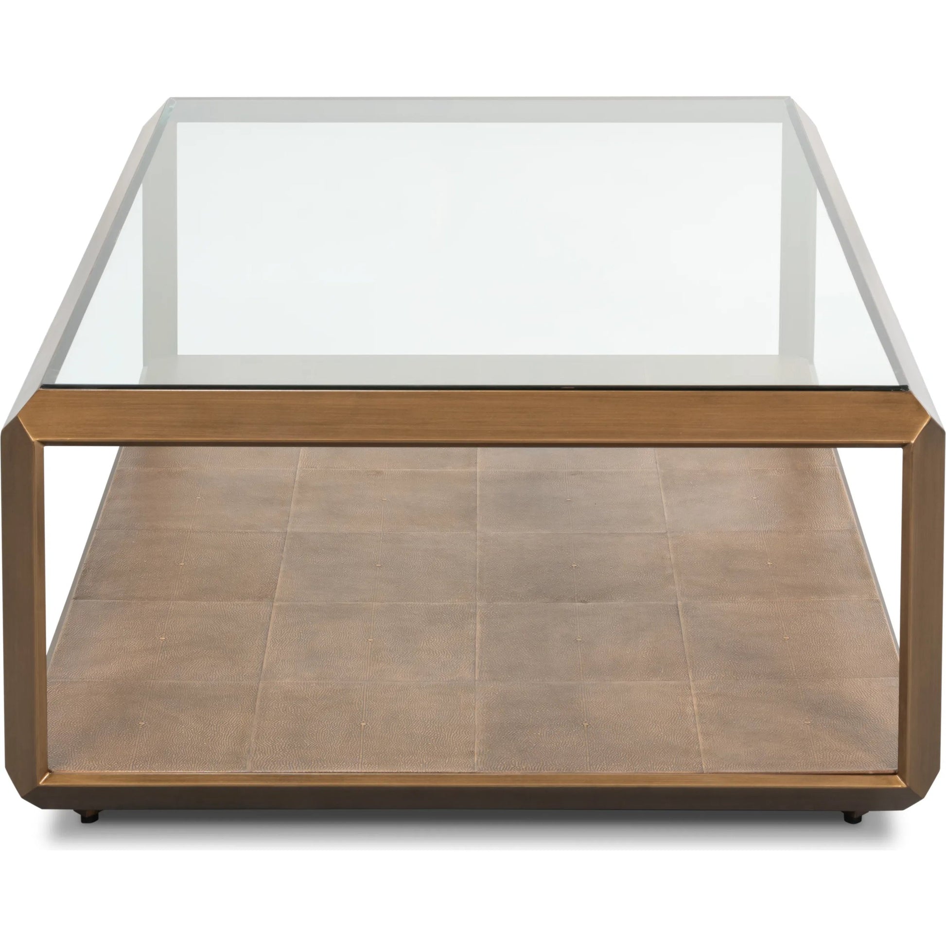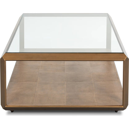 Enhance your living room with the Gilbert cocktail table, featuring a sleek transitional style where antique brass frames a glass top and shagree leather wraps the base shelf. Its versatile and adaptable design and size make it a perfect centerpiece for any space, adding both functionality and elegance. The perfect companion to the Gilbert cocktail table.