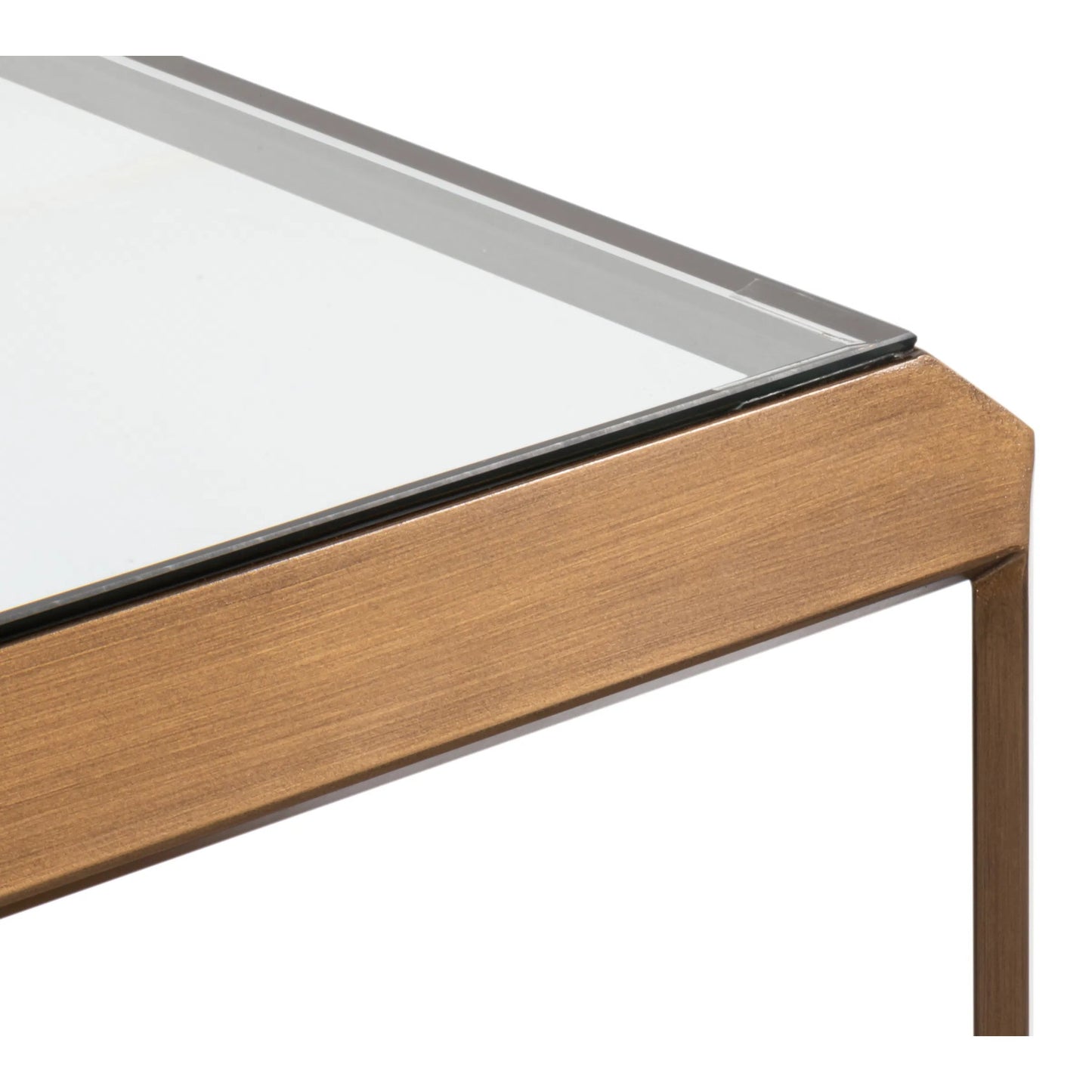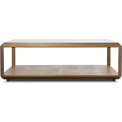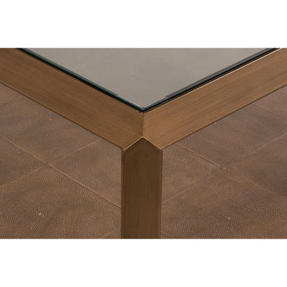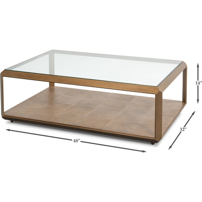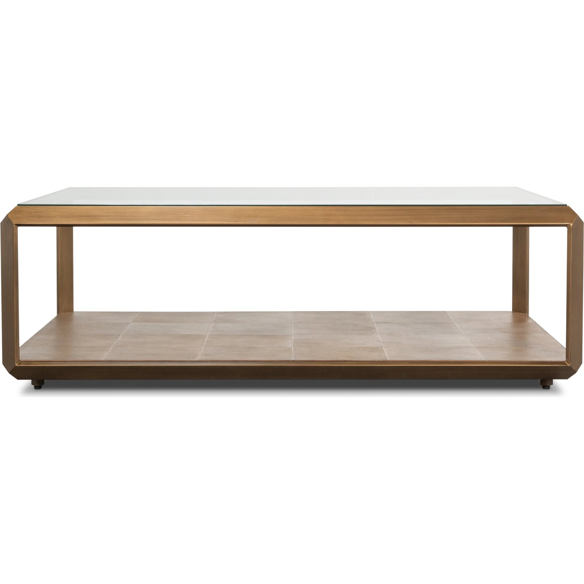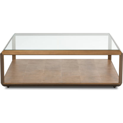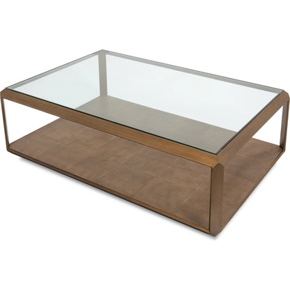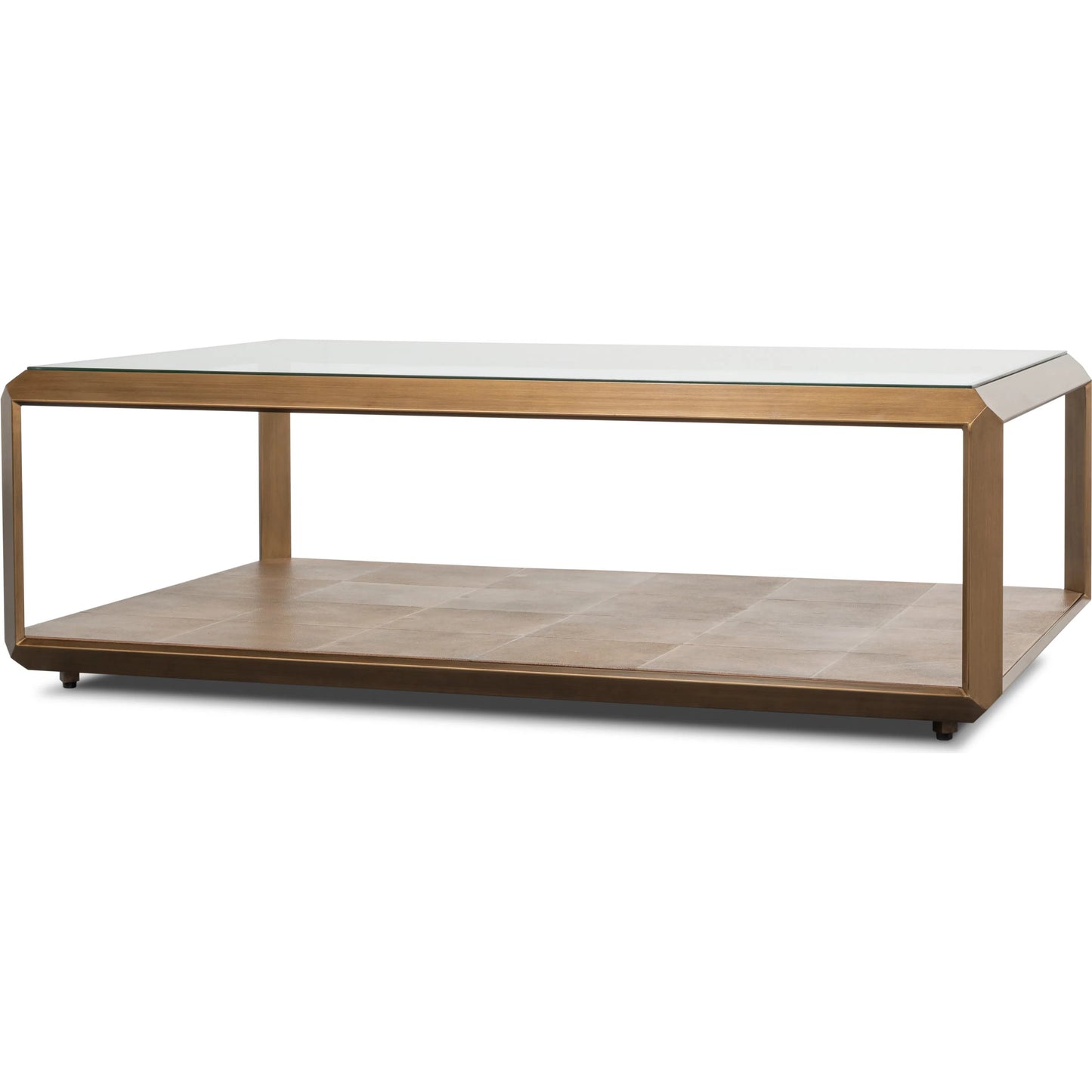 Enhance your living room with the Gilbert cocktail table, featuring a sleek transitional style where antique brass frames a glass top and shagree leather wraps the base shelf. Its versatile and adaptable design and size make it a perfect centerpiece for any space, adding both functionality and elegance. The perfect companion to the Gilbert cocktail table.