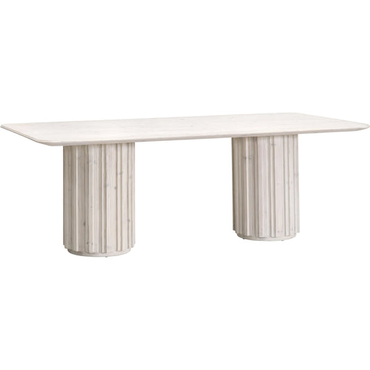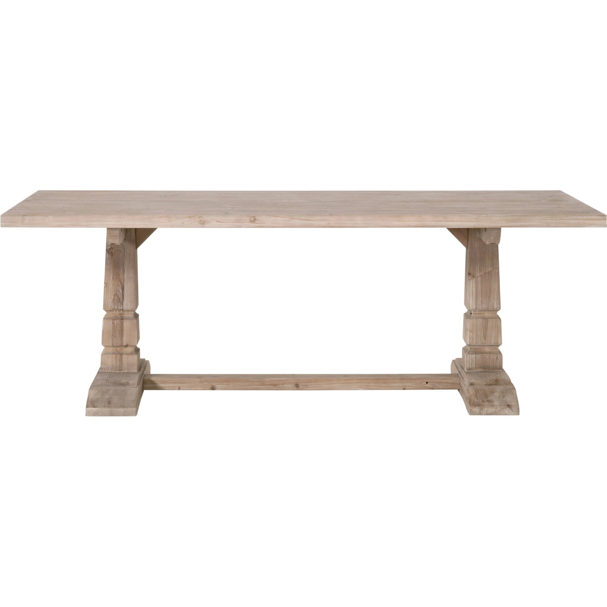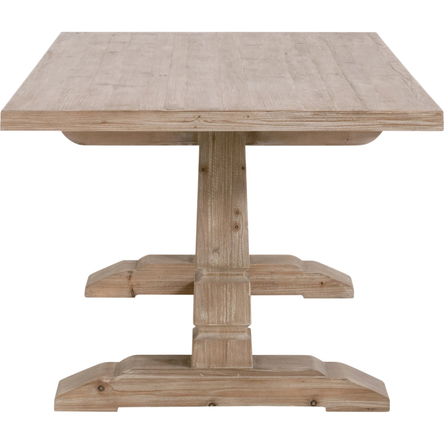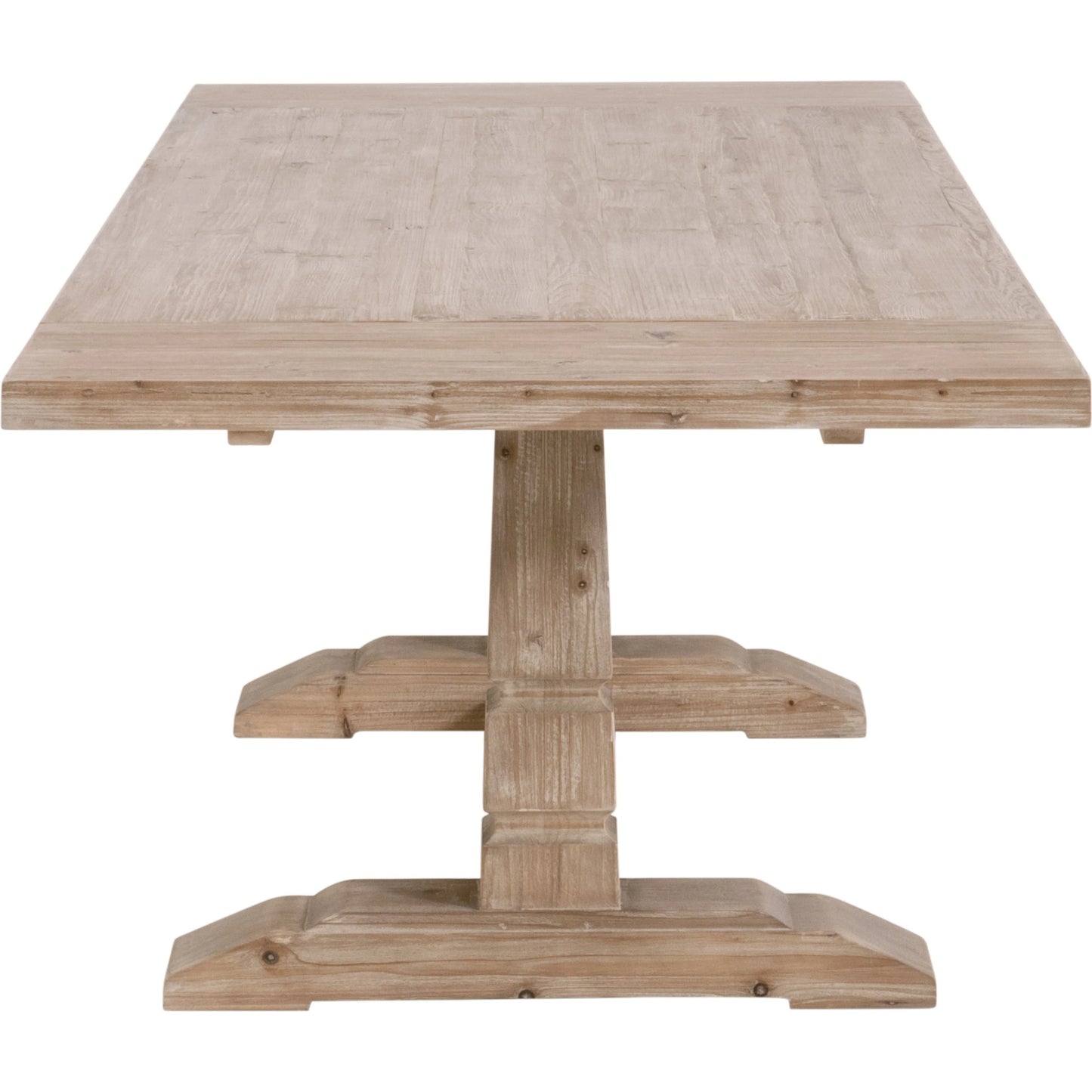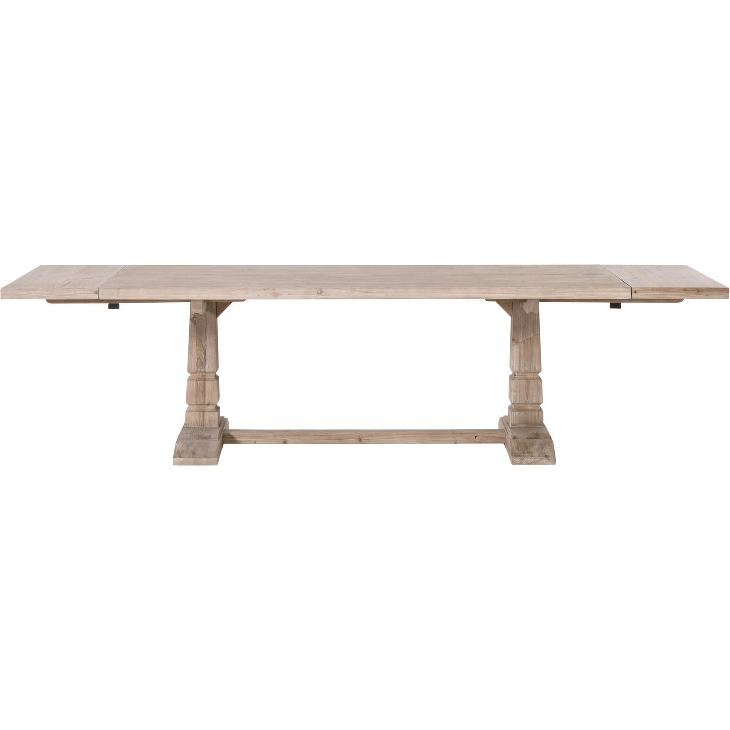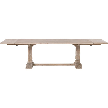 This large extension dining table has a rustic charm that can meld with many interior designs. It is constructed with a reclaimed pine wood, adding character and organic modern style to this table. It contains two removable extension leaves that can be added to the ends of the table when additional seating and space is desired. The trestle-style base adds stability and decorative design for an eye-catching component. Can comfortably seat up to 10 people.