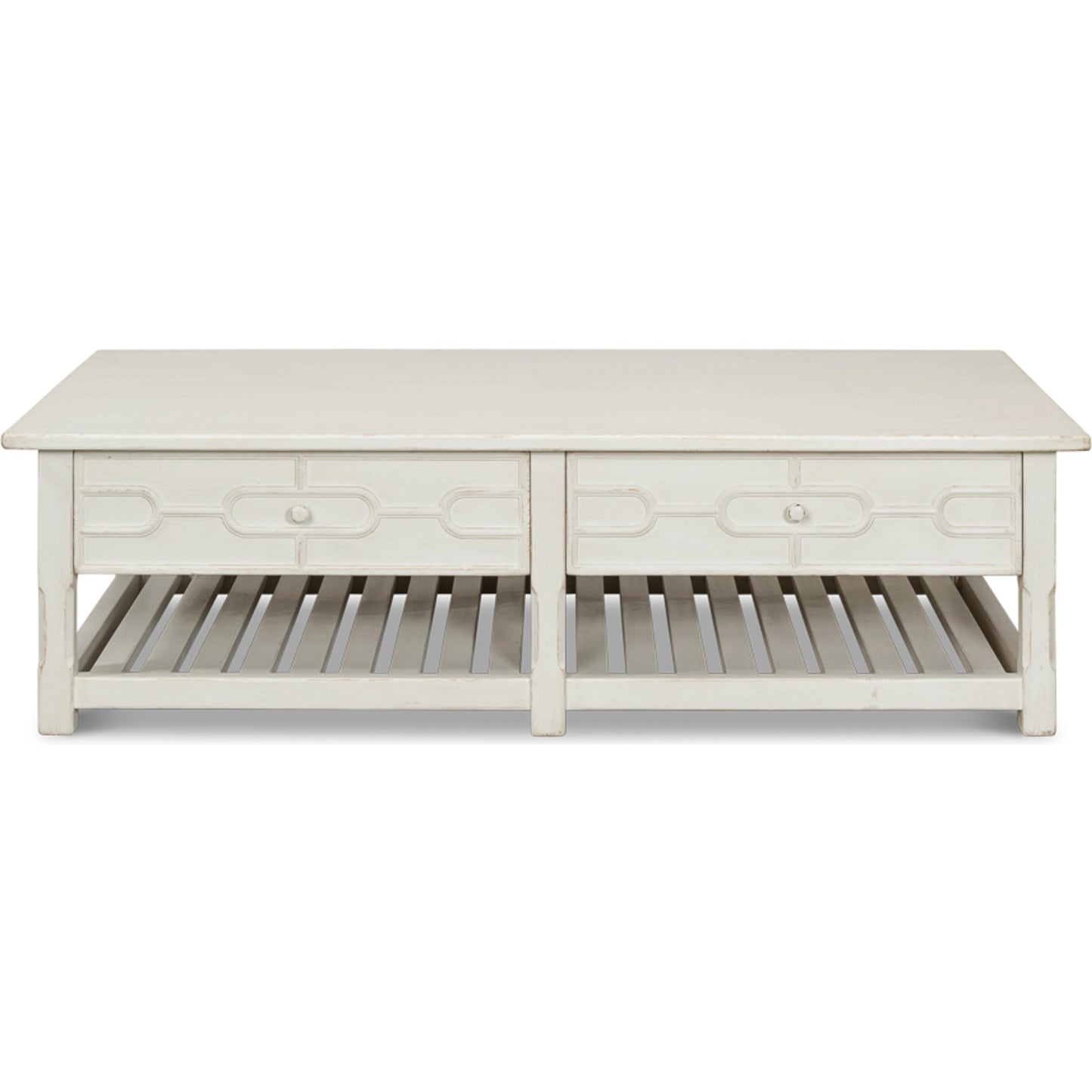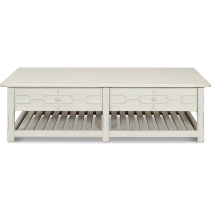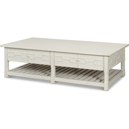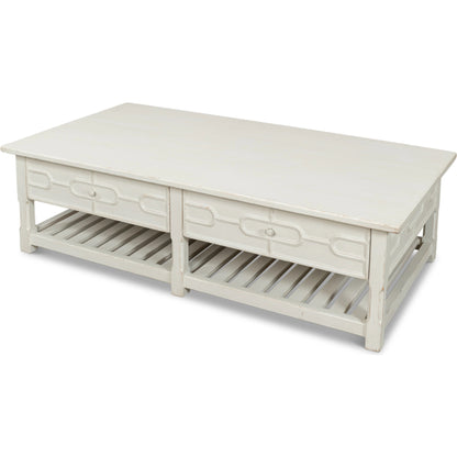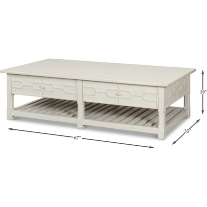 Versatile and eye-catching with trellis details evocative of an English garden, this pine coffee table speaks to old world construction, charm and the advantages of functionality, with four drawers and a lower storage shelf. Finished in antique white.