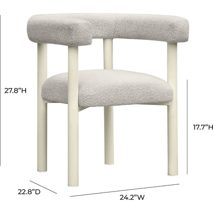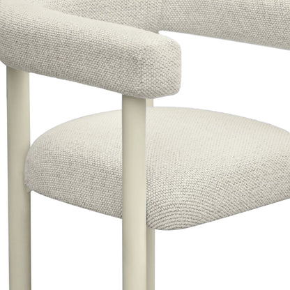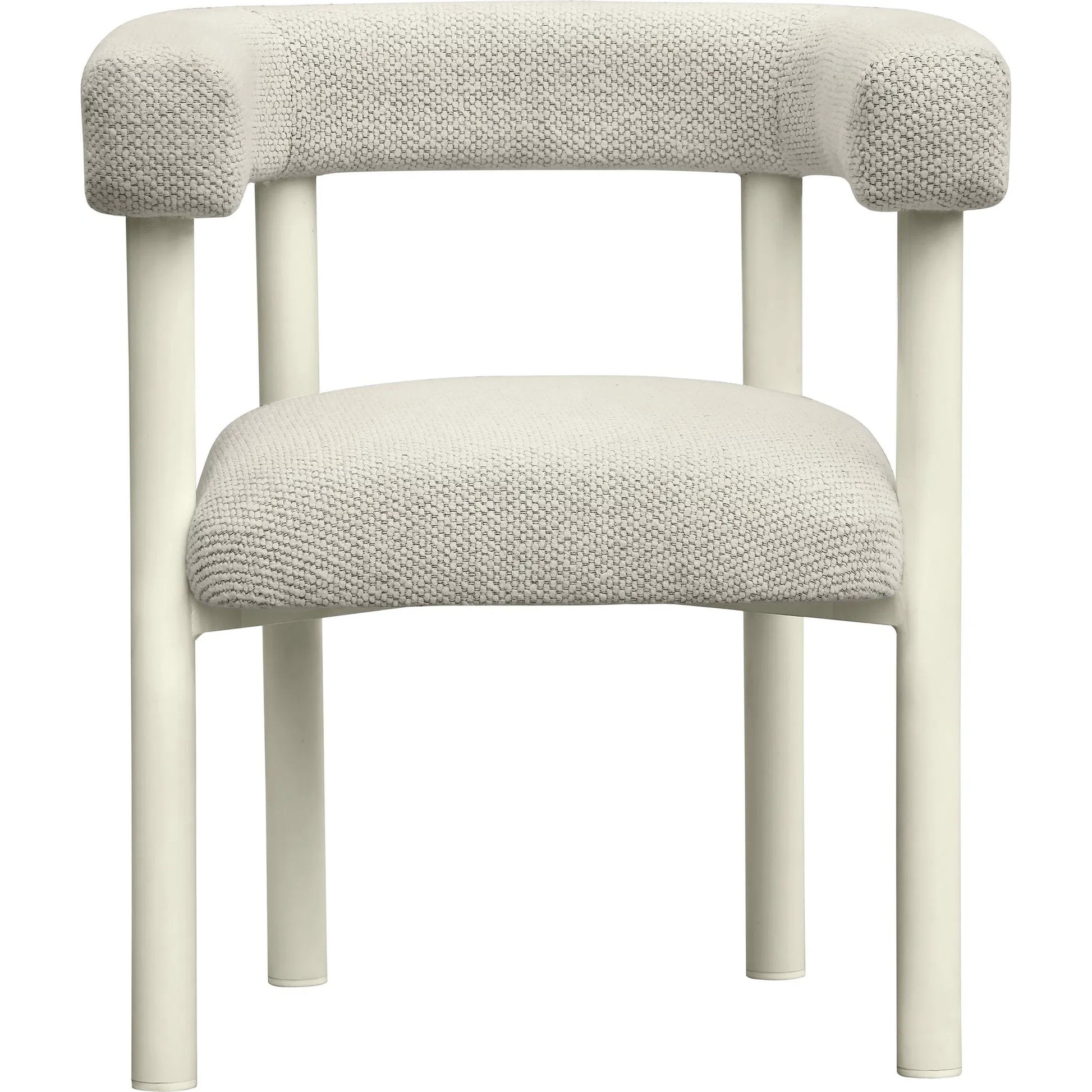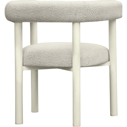 Transport yourself to the Greek Isles with the cream-toned Jackie Outdoor Textured Dining Chair. Crafted with a brand-new concept, a nubby textured outdoor fabric, this chair boasts groundbreaking uniqueness in outdoor-grade materials. Designed with water protection in mind, Jackie serves as both a dining and accent chair. Constructed with weather-resistant high-grade aluminum and substantial backrest padding at a height of 28.4", it easily slides under any outdoor dining table for efficient use of space.