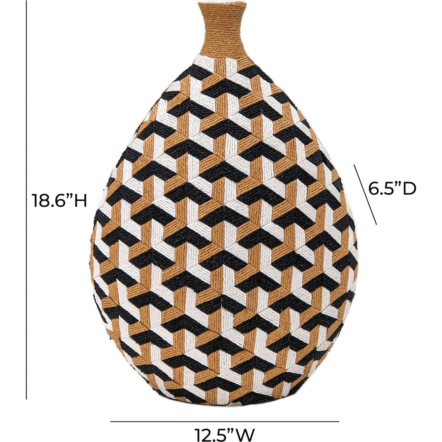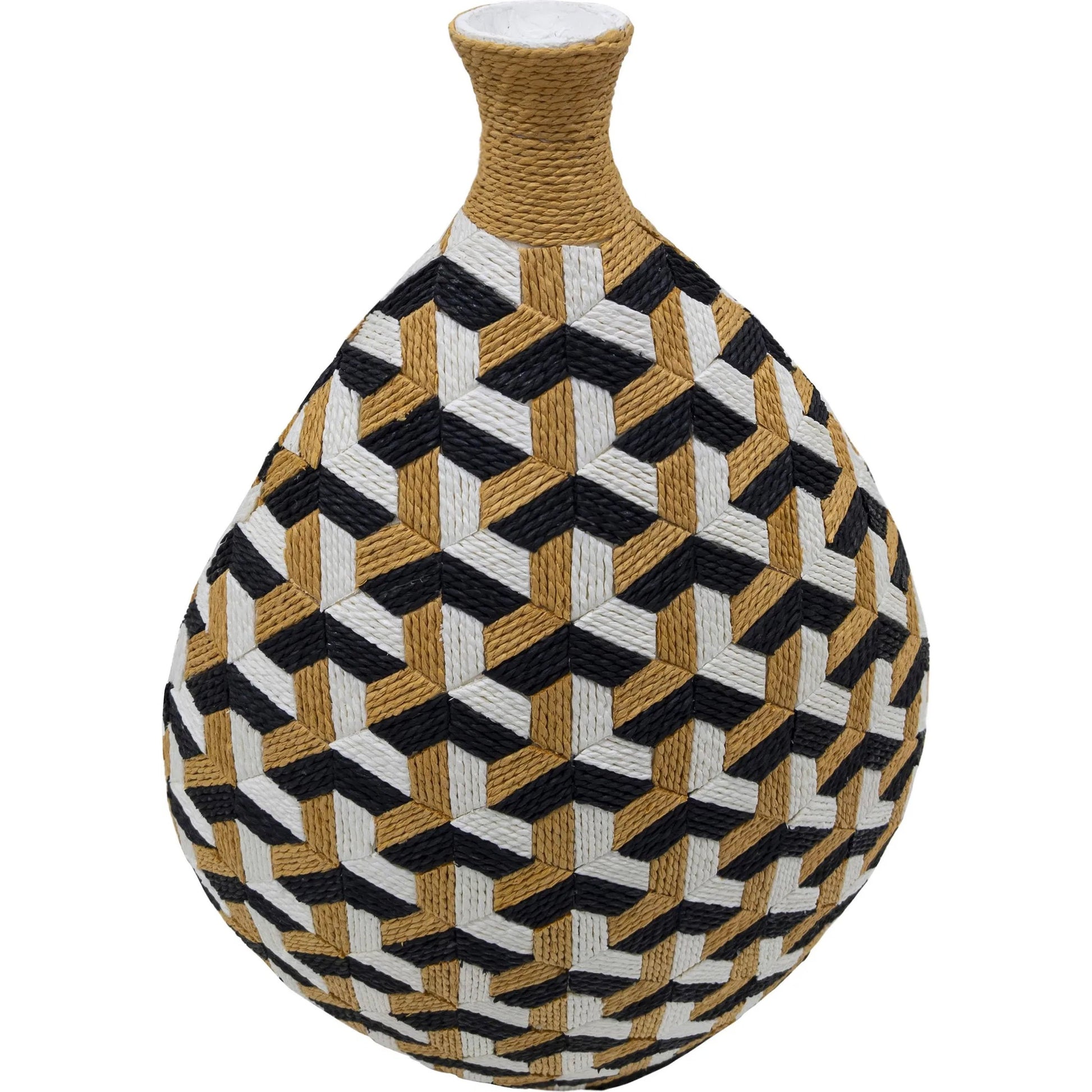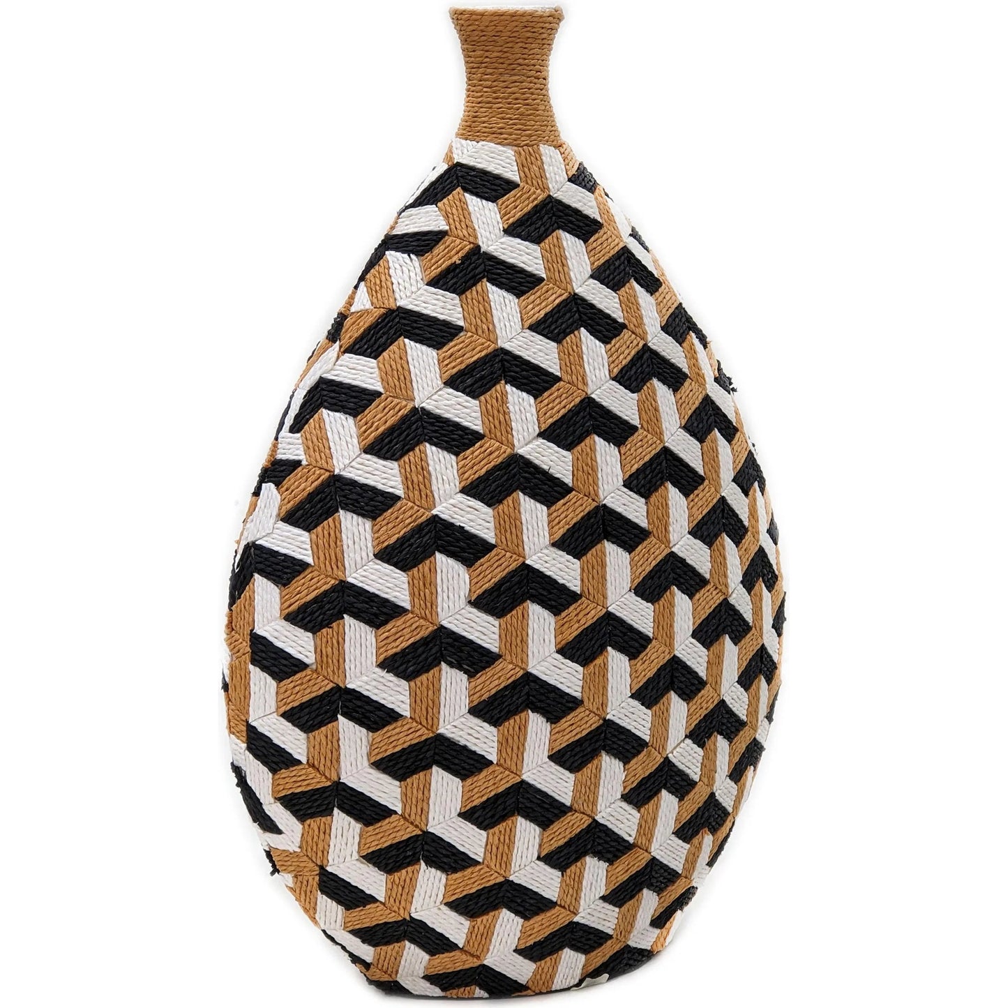 Introducing the Jahia Decorative Vase, a masterpiece of meticulous craftsmanship available in either a bold geometric or an avant-garde Cubism pattern, where each roped tile is hand-placed with precision, demanding hours of dedicated effort. Its distinctive shape, crowned with a delicate, small neck, is perfectly designed to hold minimalist branches, transforming a simple arrangement into a striking display. This decor vase is not just a vessel but a piece of art, ready to elevate the charm of your home. It is ideal for styling your next selfie with a touch of bold uniqueness.