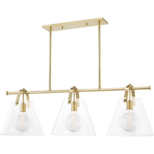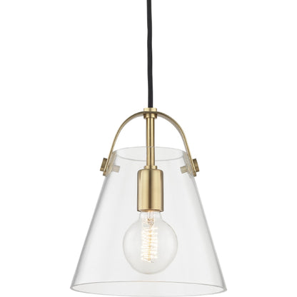 A metal strap arches over the open-top shade of this bell-shaped fixture that rings with style. An incandescent bulb shines through the clear glass shade—adding lots of light anywhere the linear, sconce or pendant is placed.