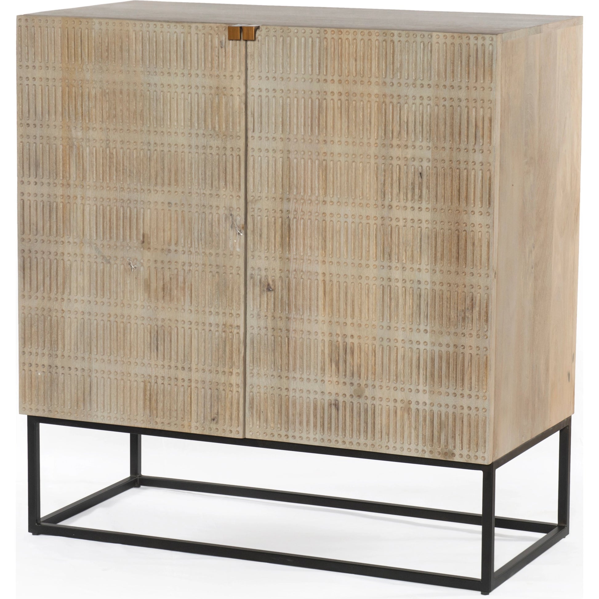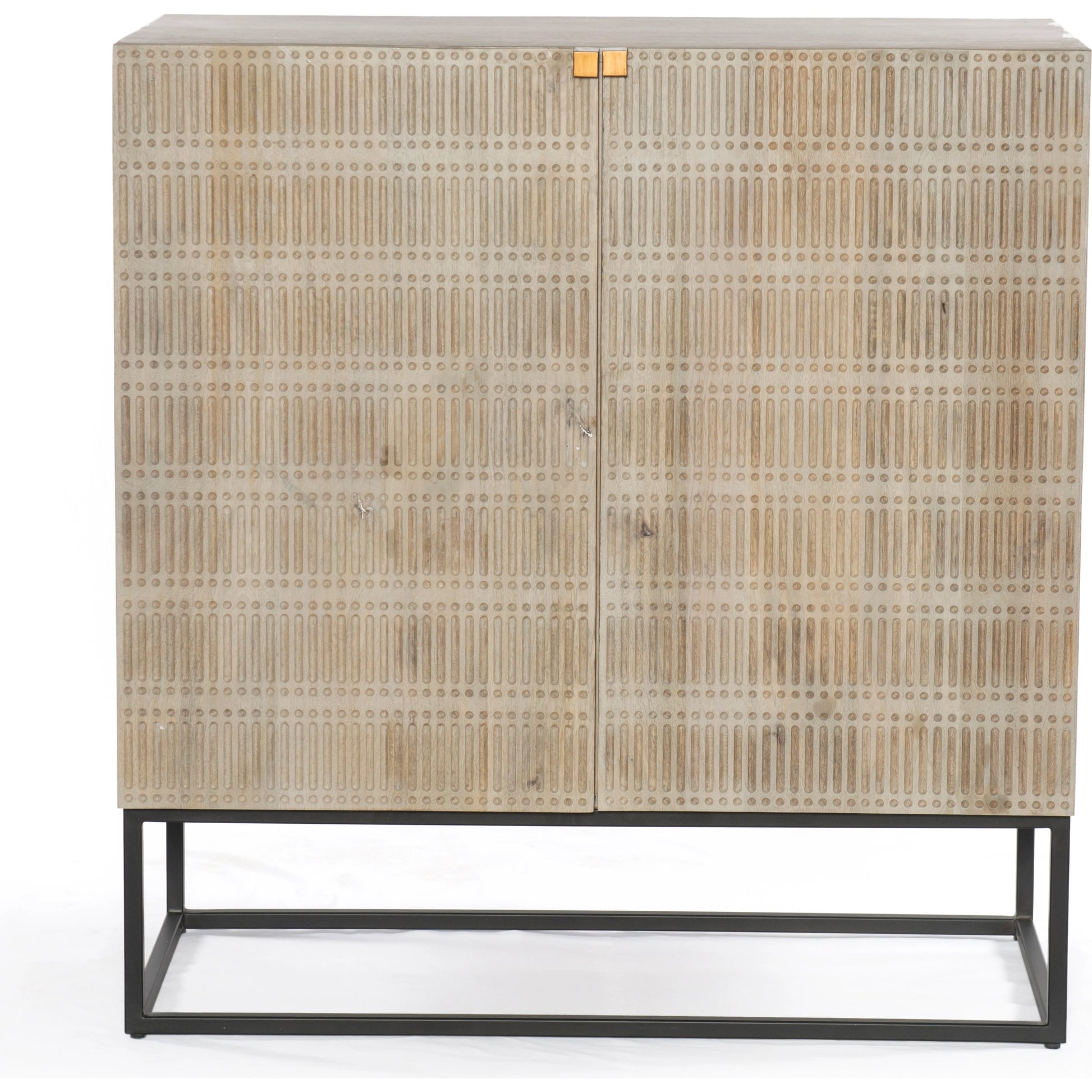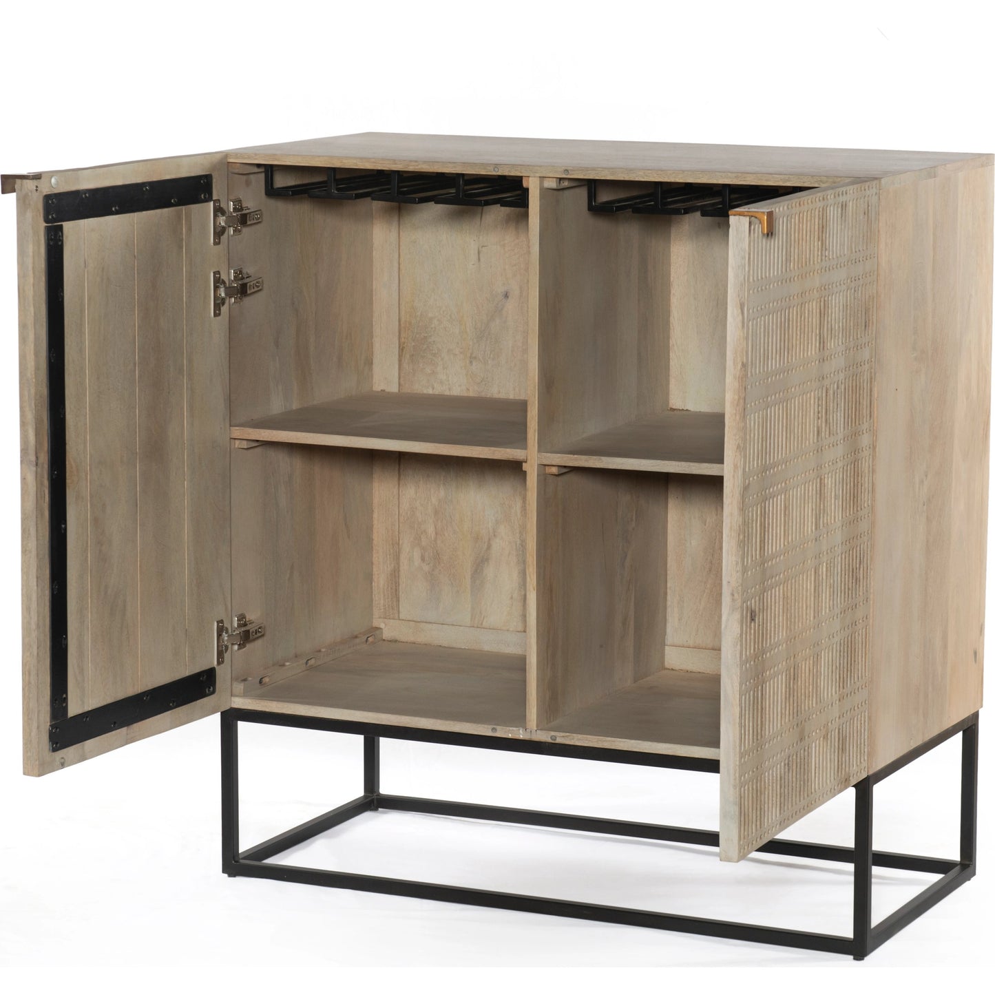 Uniquely carved mango wood highlighting texture and craftsmanship, while a slim gunmetal base adds an airy, cage-like look to contemporary bar storage. Inside, spacious open shelving and wine glass holders await.
