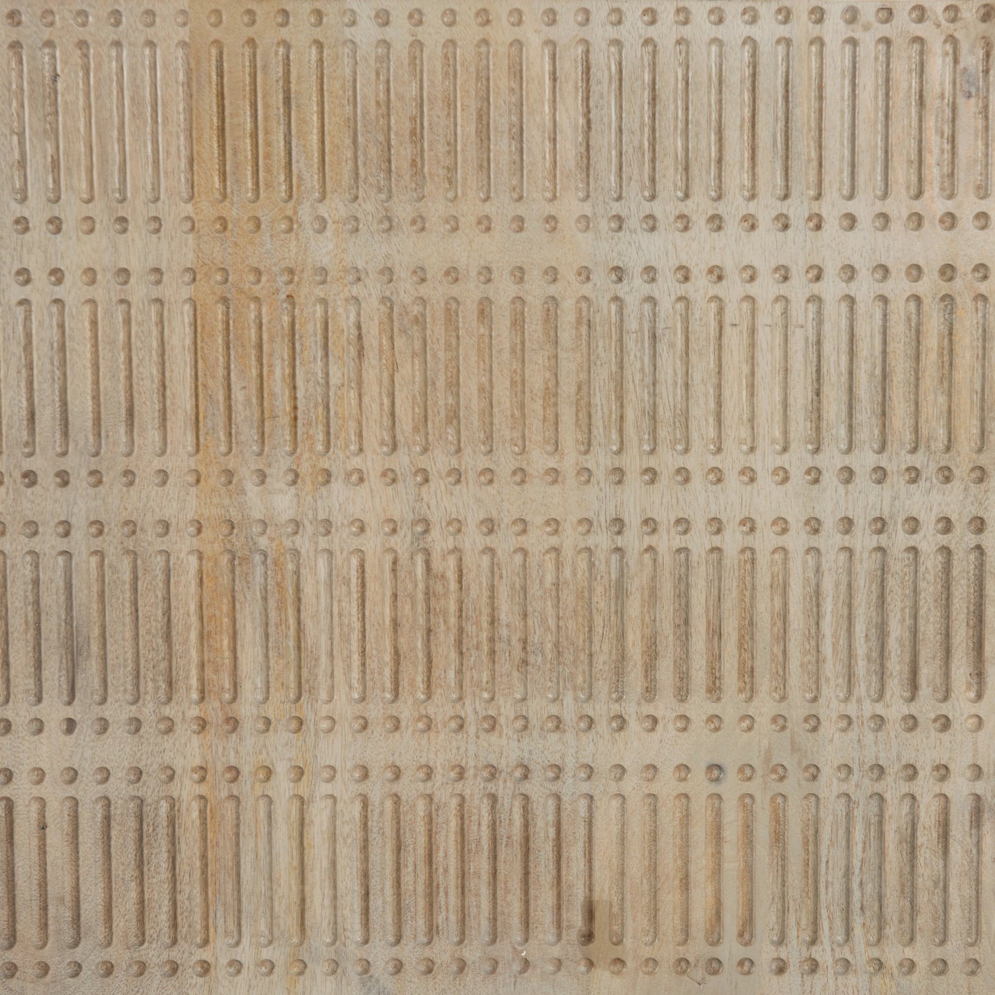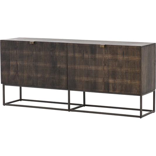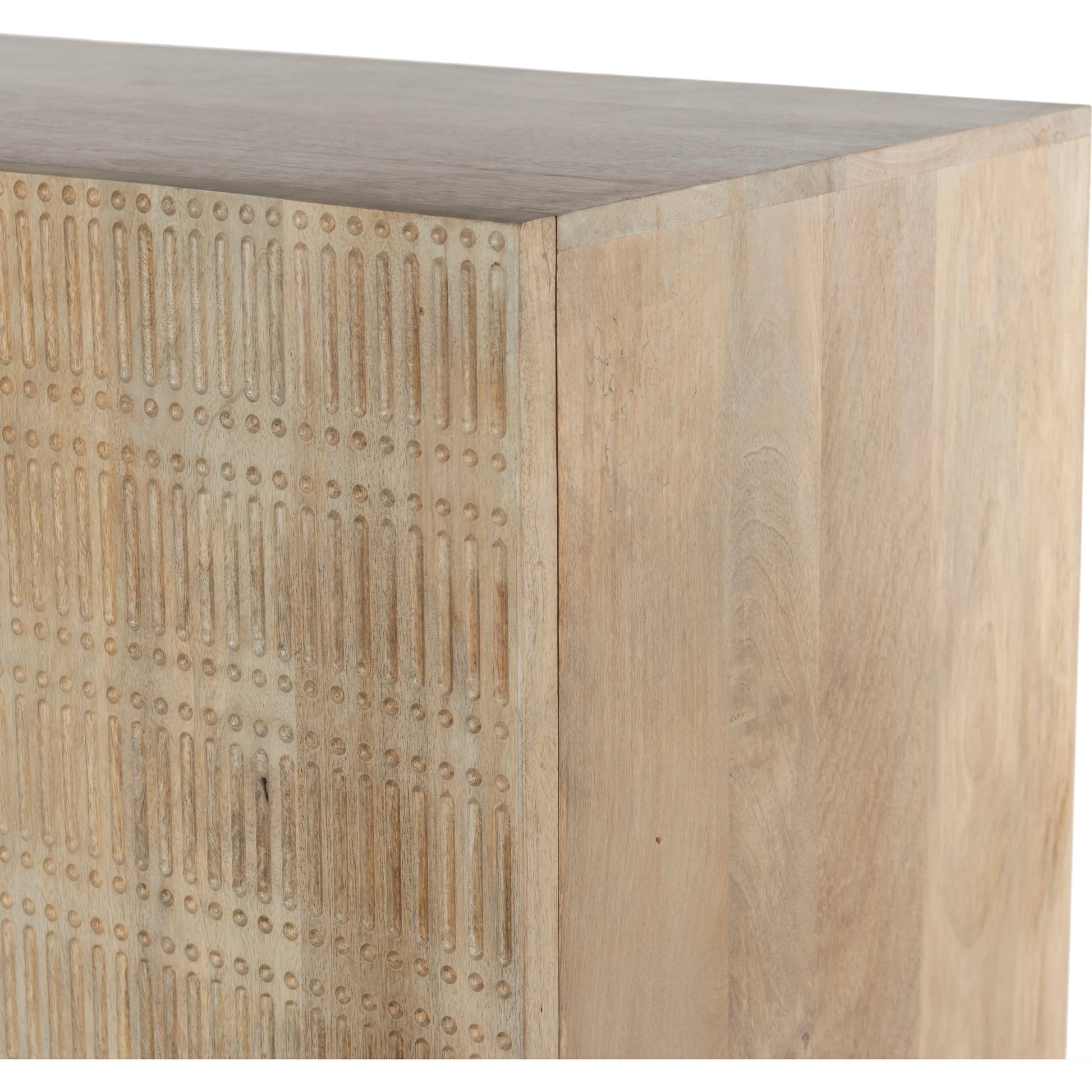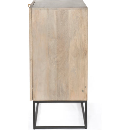 Uniquely carved mango wood highlighting texture and craftsmanship, while a slim gunmetal base adds an airy, cage-like look to contemporary bar storage. Inside, spacious open shelving and wine glass holders await.