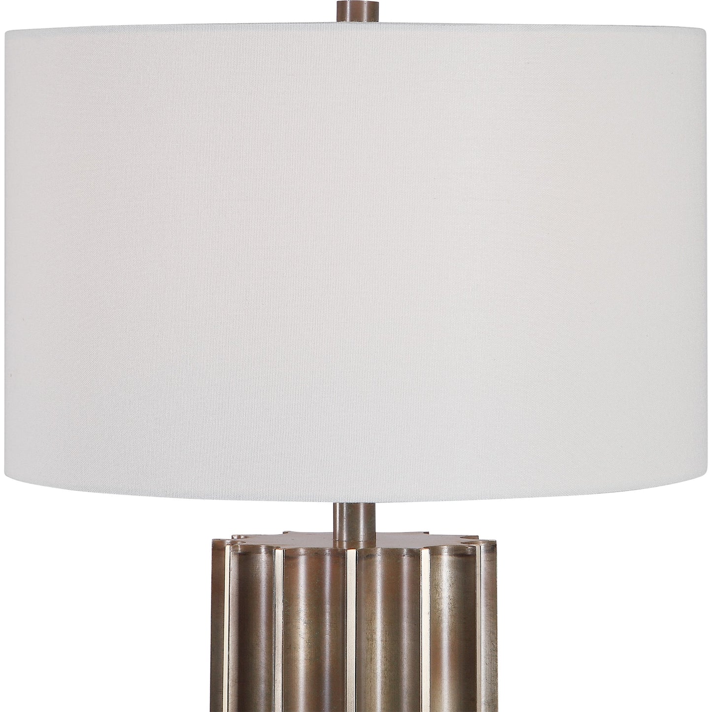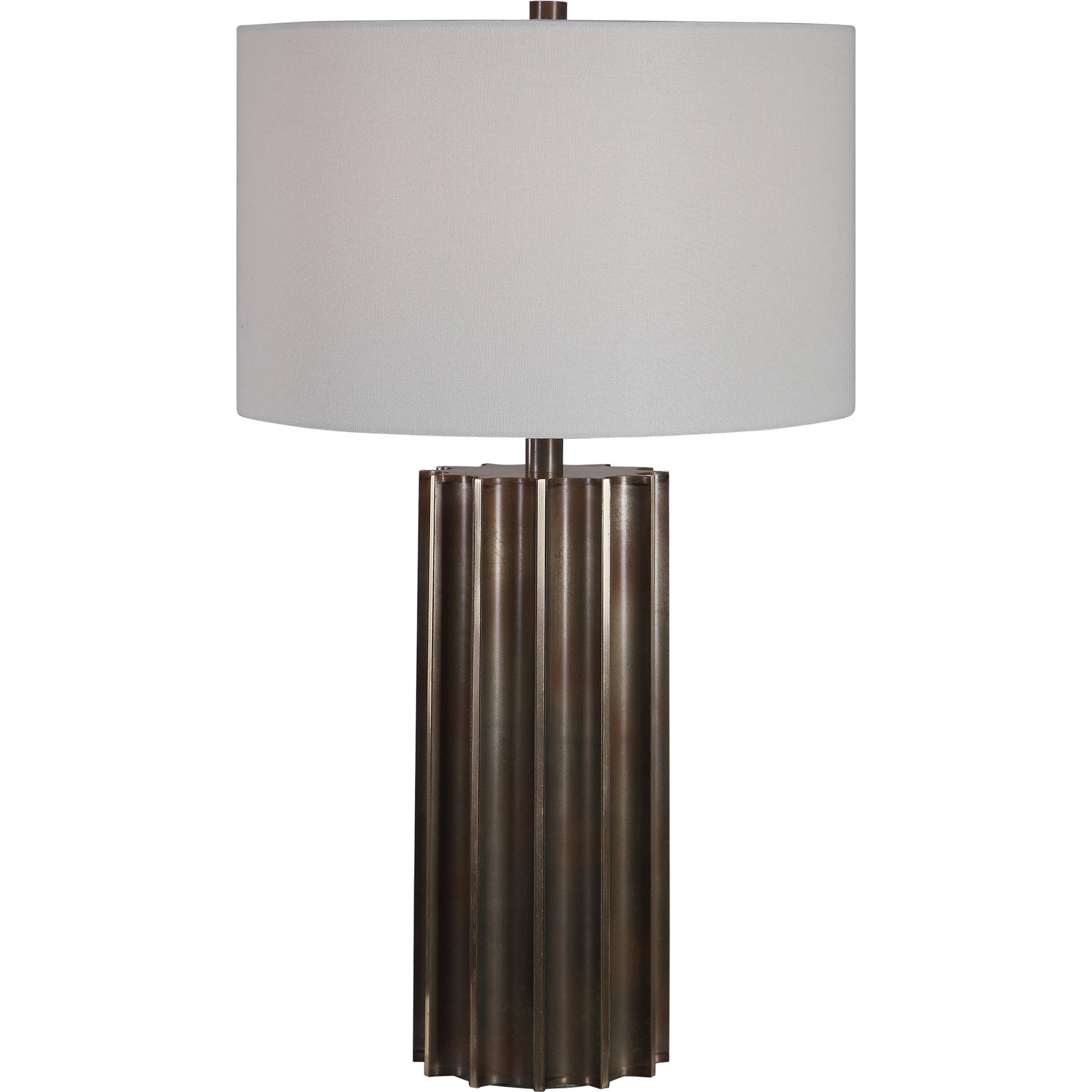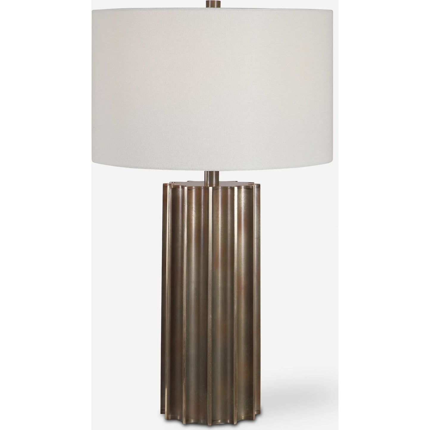 This Table Lamp Features A Deep Fluted Steel Base Finished In An Aged Gun Metal With Rust Distressing And Brass Plated Edges, For A Rustic Industrial Feel. The Round Hardback Drum Shade Is A White Linen Fabric.
