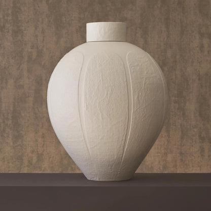 Dense, irregular texture of handwoven linen over a smooth background gives this large-scale, lidded porcelain jar lots of personality.