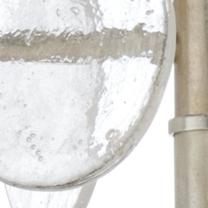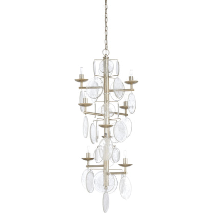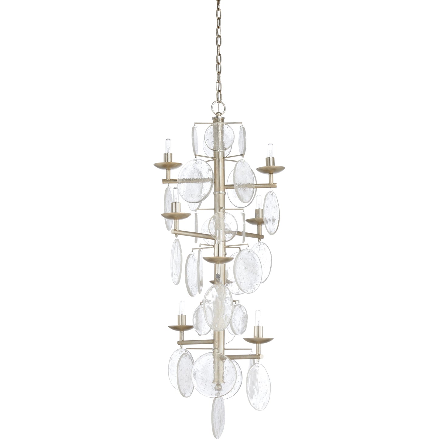 Vintage inspired chandelier. Silver leaf on iron with cast glass hanging discs. Comes with 72" of chain.