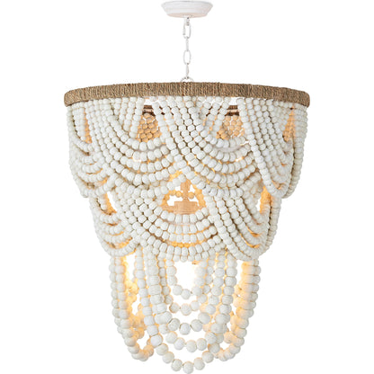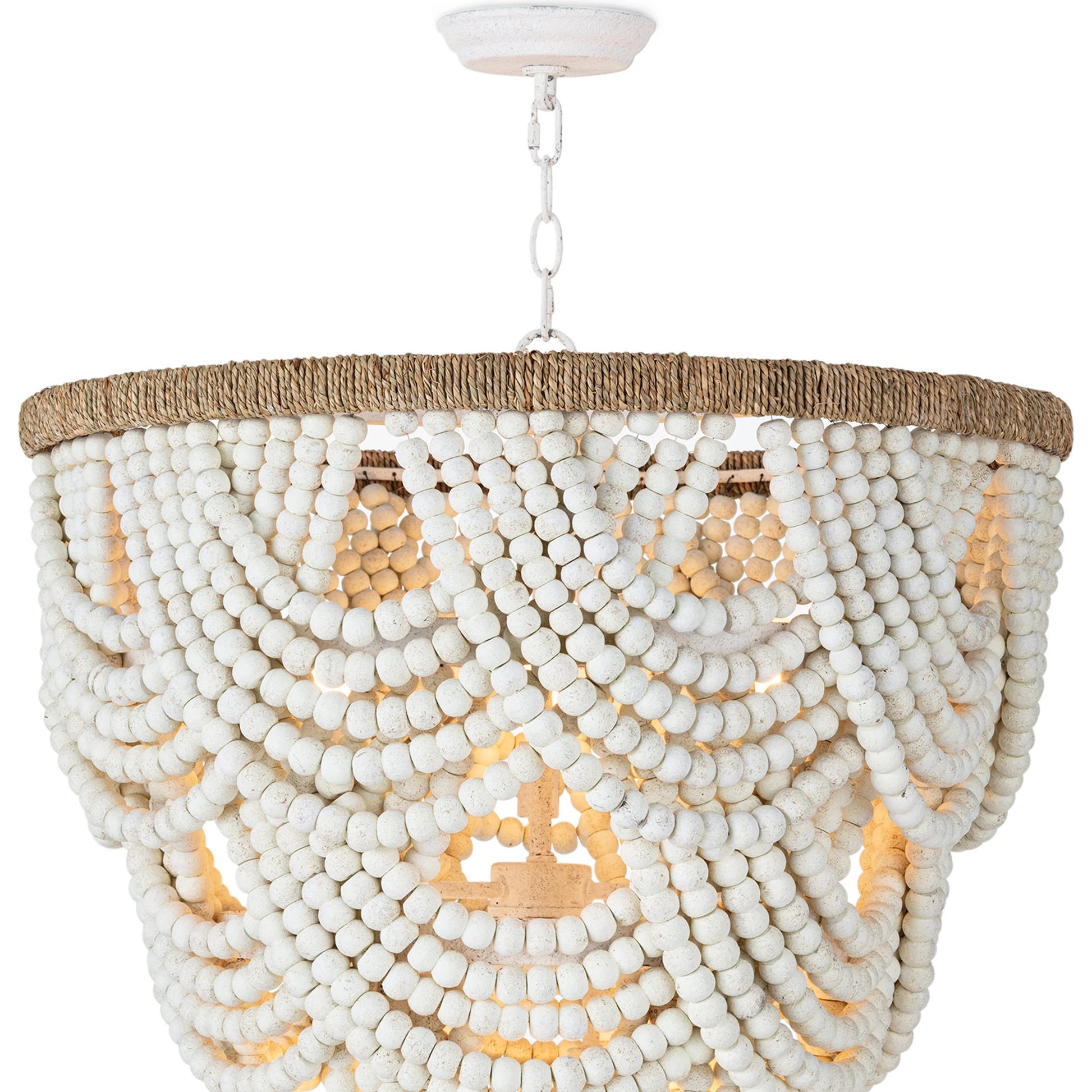 Cascading layers of soft-distressed white wooden beads in the Lorelei Chandelier provide a graceful display over a jute-wrapped circular frame. The fixture is both elegant and versatile, equally beautiful in living and dining spaces throughout the home.