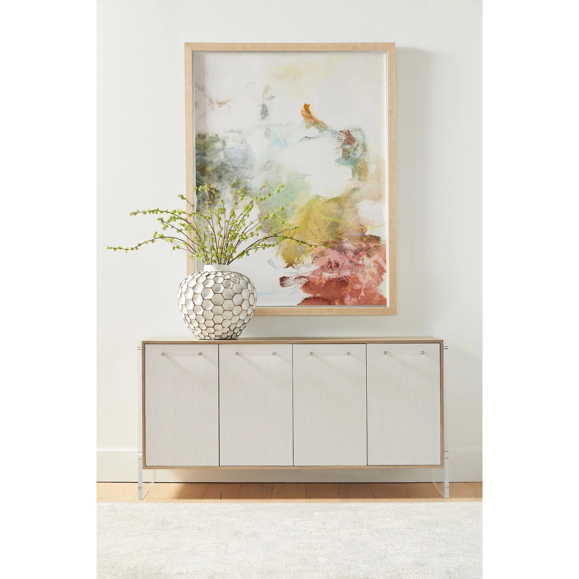 Create a clean and polished look within your home with the Lorin Shagreen Media Sideboard by Essentials for Living. This sideboard is perfect for a light and airy aesthetic. The front door cabinets are made with a pearl white faux shagreen finish featuring a subtle geometric design. The faux shagreen is made of resin and resembles real stingray skin and contains seams and natural-looking characteristics. It is paired with clear acrylic handles and side panels, adding elements of modern design. The handles and side panels have brushed silver accents for an elegant touch. Measuring 67" wide, 19" deep, and 34.5" high, there is plenty of storage space. You can easily store items or media components with the removable and adjustable shelves and cord management holes. The frame is composed of natural gray acacia, which nicely complements the pearl white shagreen. Complete your living space with this statement-making sideboard, which will work well in many transitional interior settings.