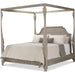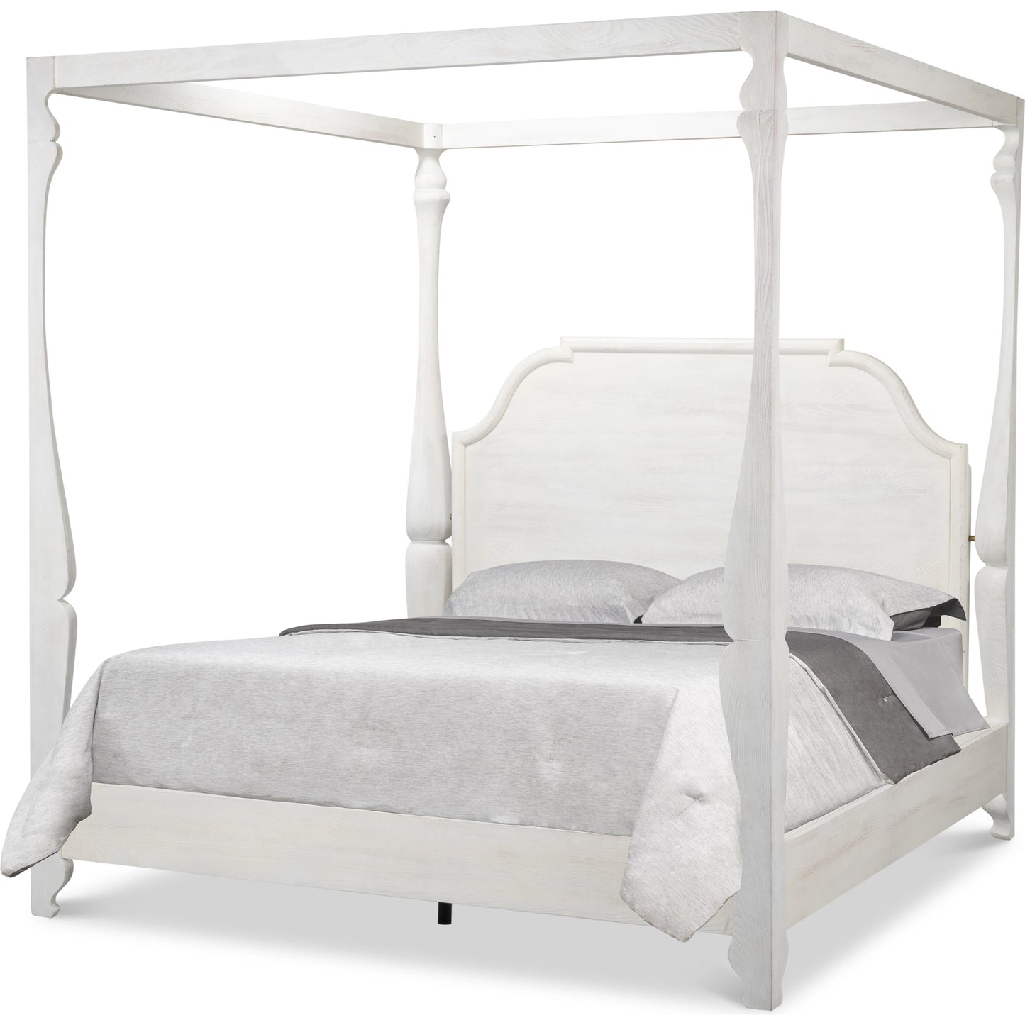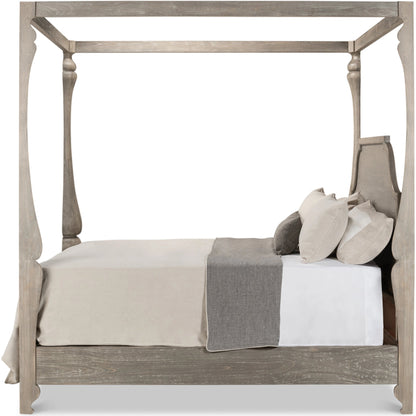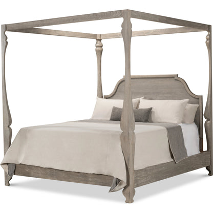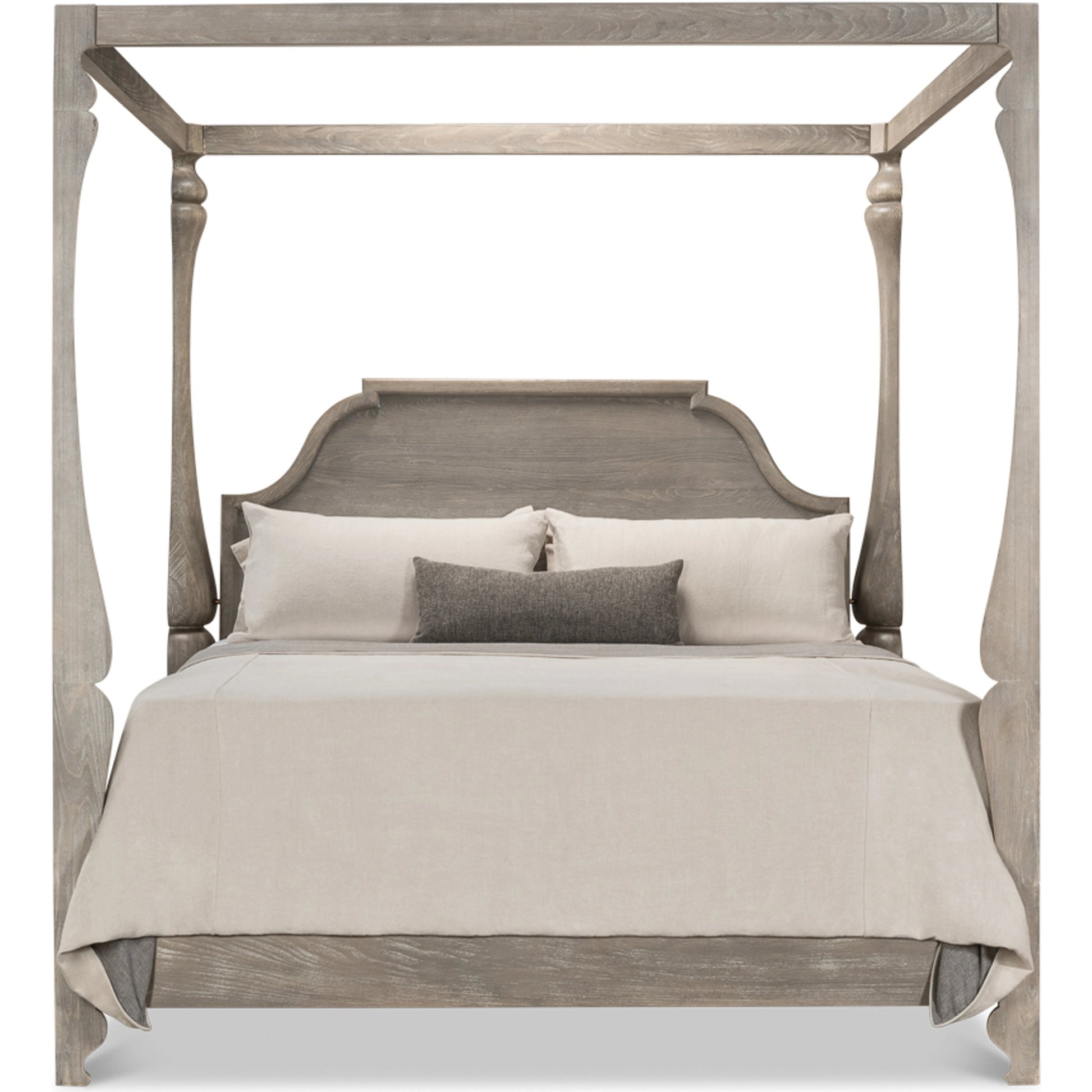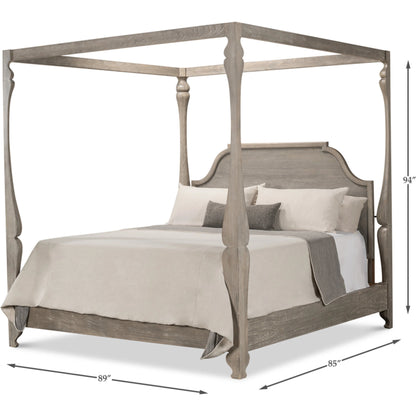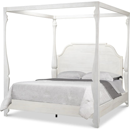 Simply yet sophisticated, this poster bed with a unique round post that is quartered to expose the flat sides is set apart with a headboard veneered in pine and framed in softly crowned molding. It looks extra fresh crafted in Beechwood with a Bungalow White finish, accented with iron and brass.