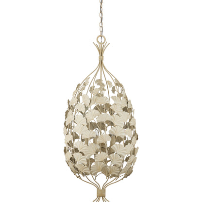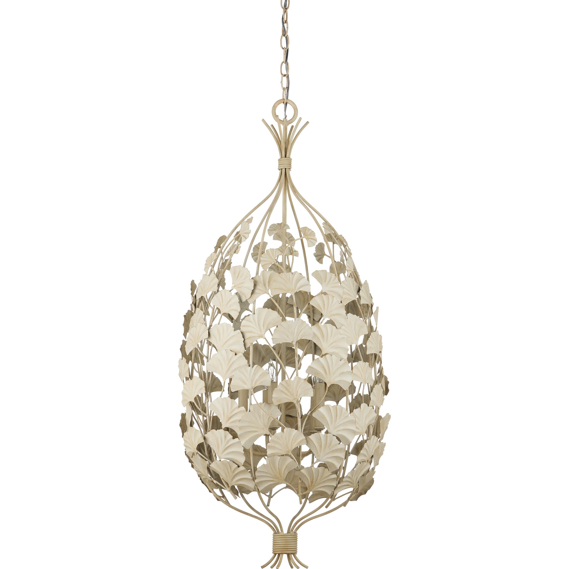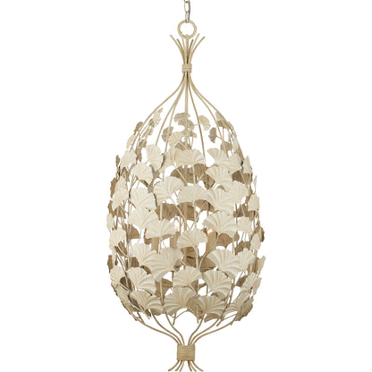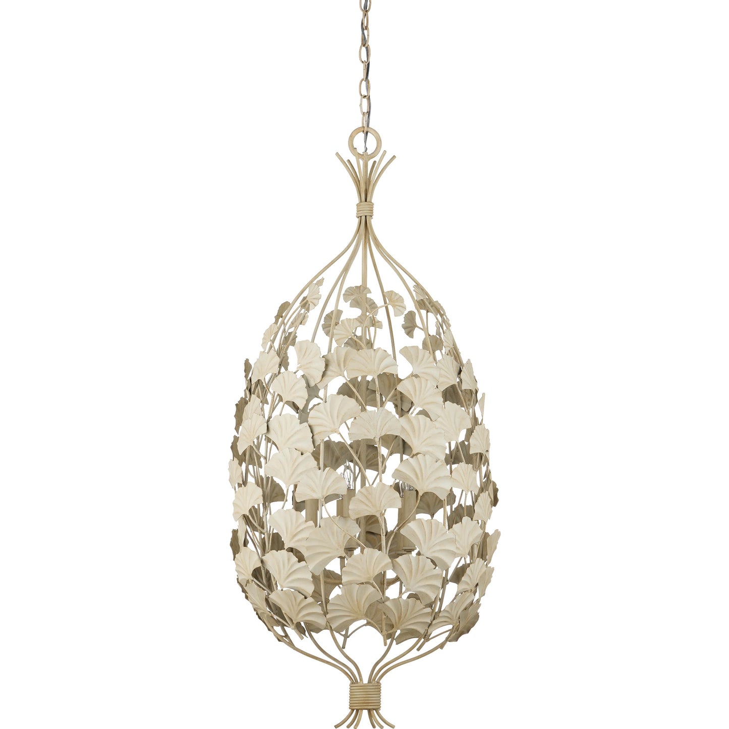 Inspired by the Ginkgo leaf, Clarence Mallari designed the Maidenhair Cream Chandelier that captivates with its flowing pattern of fan-shaped leaves. This is a lovely beige chandelier, as the antique pearl finish on the shade glows when the lights are switched on and the billowing leaves create patterns on surrounding surfaces. This nature-inspired chandelier is perfect for a biophilic project.
