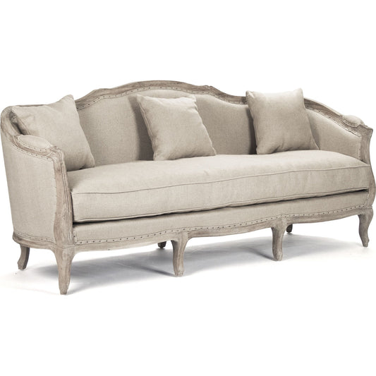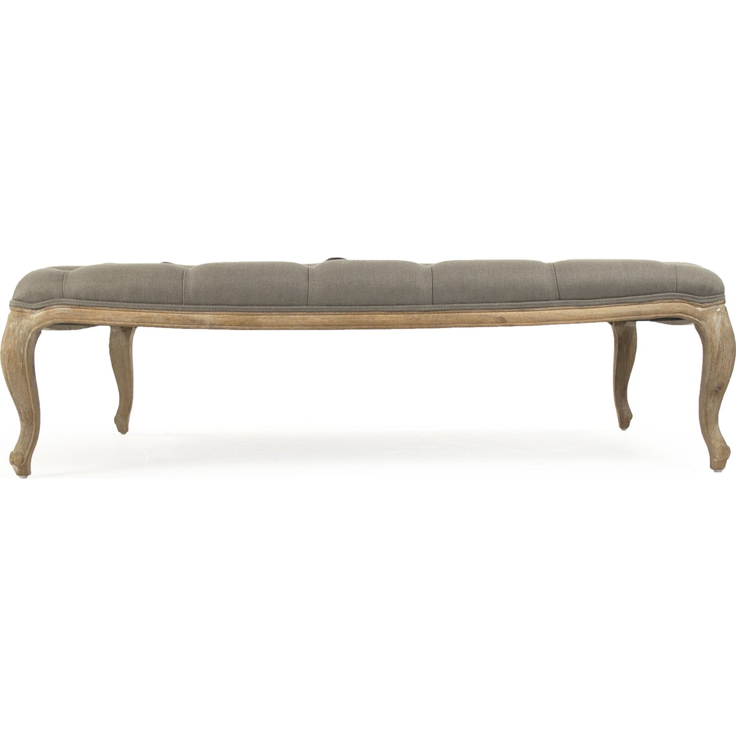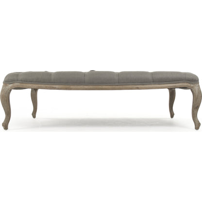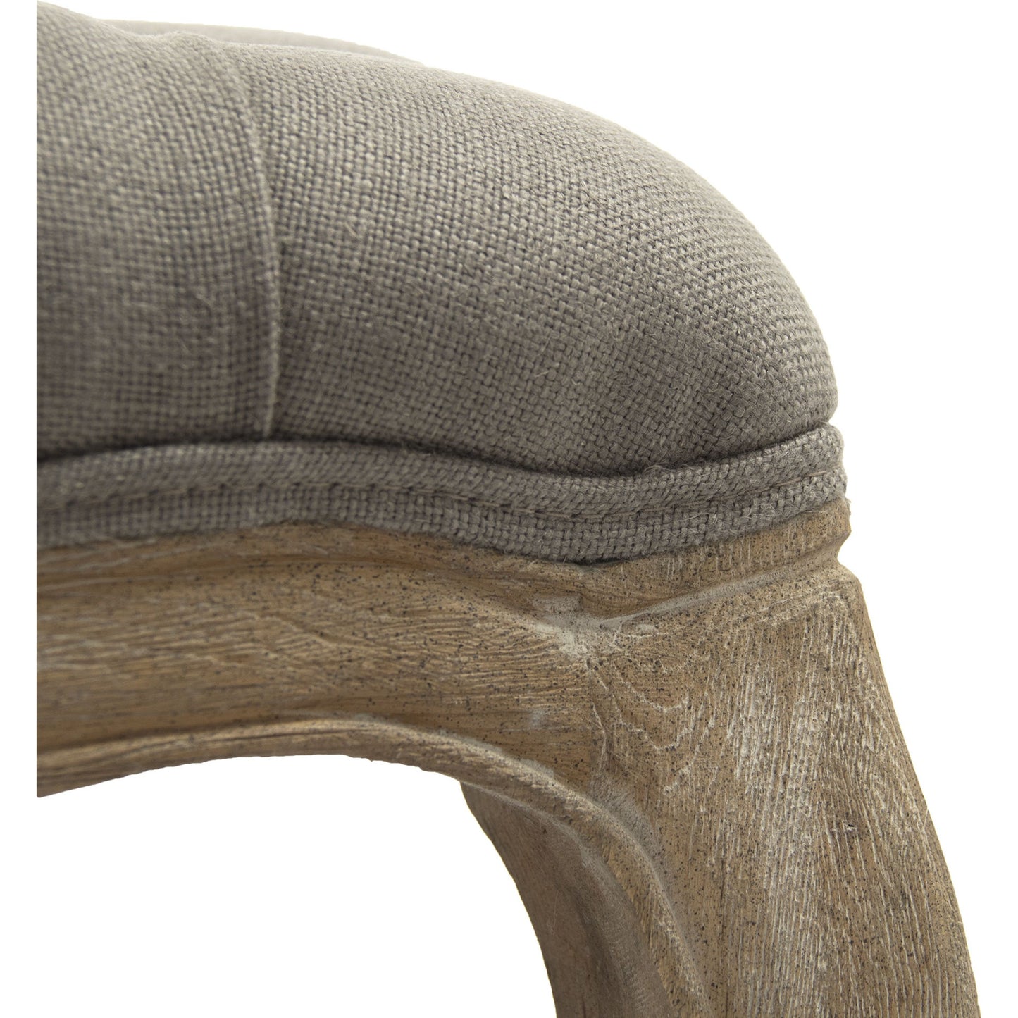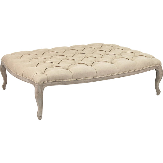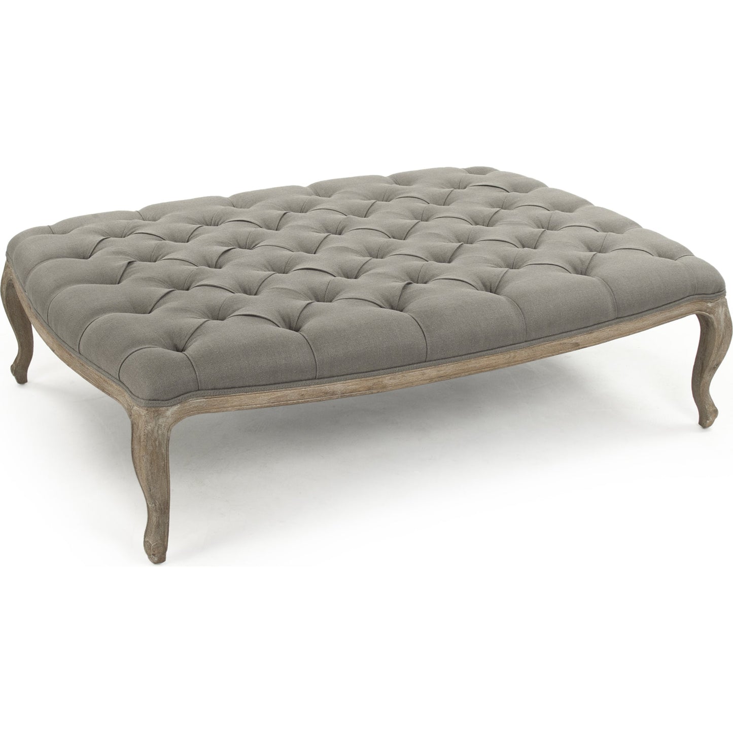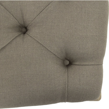 Rectangular tufted ottoman upholstered in grey linen on limed grey oak legs.