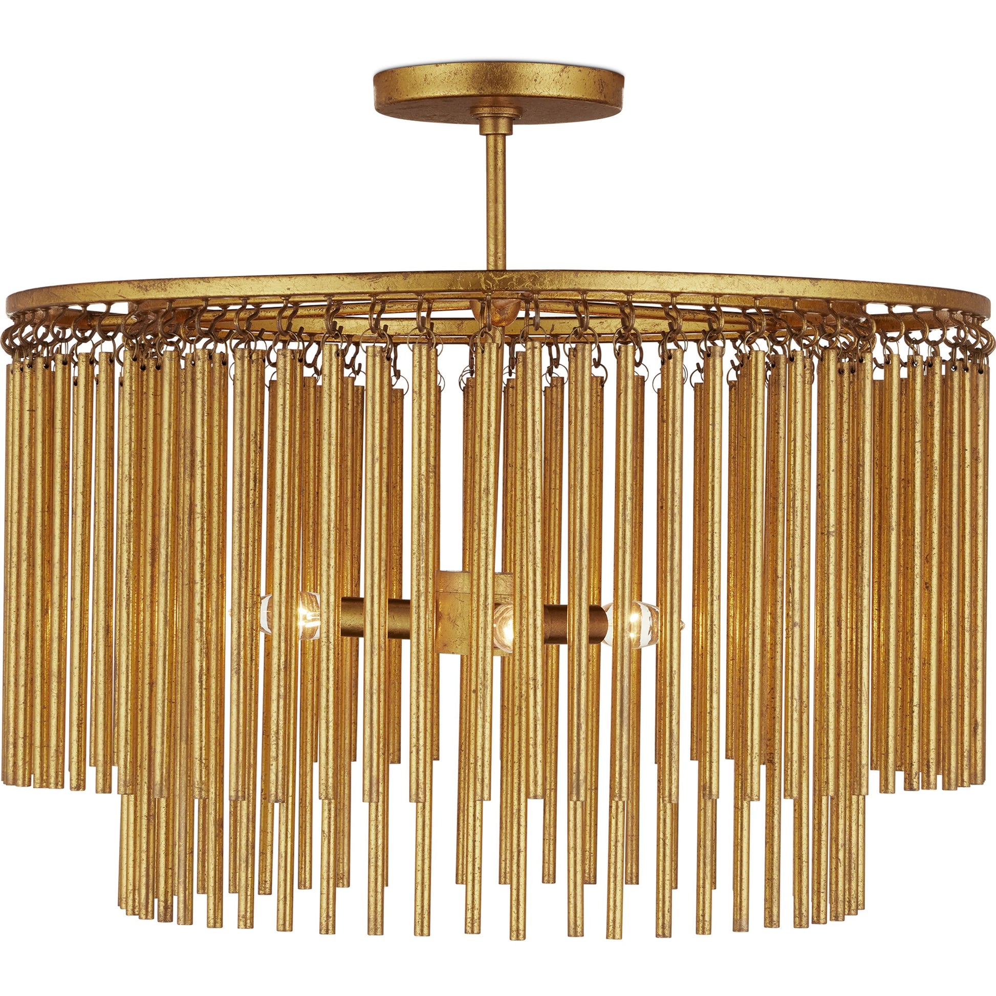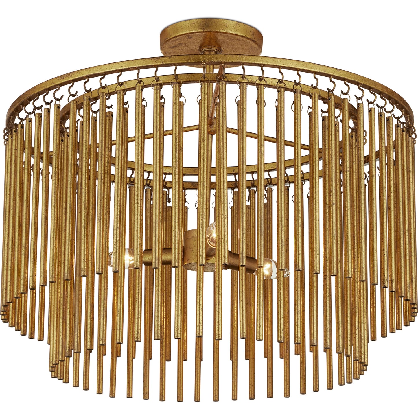 The Mantra Semi-Flush Mount is an elegant example of mid-century modern luxe. The gold leaf finish on the long tentacles of metal that dangle from its two tiers bring the fixture a powerful punch of patina. This is due to the distressing the finish artisans achieved with the gold leaf treatment on the chandelier. A shrewd design detail is how the rods of metal are affixed with small hooks, each of which has to be hand-welded to the circular frames of the gold semi-flush.