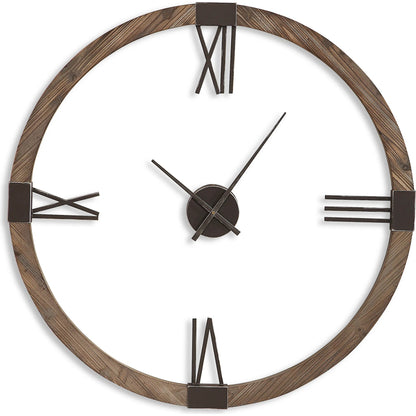 Natural Stained, Fir Wood Clock Frame With Hand Forged, Aged Iron Roman Numerals And Floating Center Dial. Quartz Movement Ensures Accurate Timekeeping. Requires One "AA" Battery.