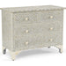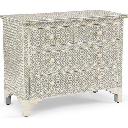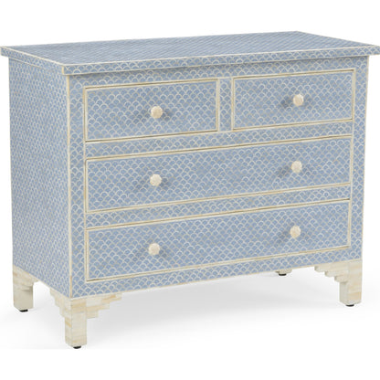 Create a unique and beautiful focal point in your home with this artistic chest. The Milford Chest features a natural and white bone fish scale pattern hand laid by skilled artisans. The sophisticated artistry and natural characteristics of the bone make each piece unique. This four drawer chest is ideal for a bedroom, entryway or living area. Top with a chic lamp and an accent piece to complete your coastal decor. Not intended for clothing storage. (Top drawers: 4"h x 14.75"w x 11.75"d, bottom drawers: 4"h x 34"w x 11.75"d)