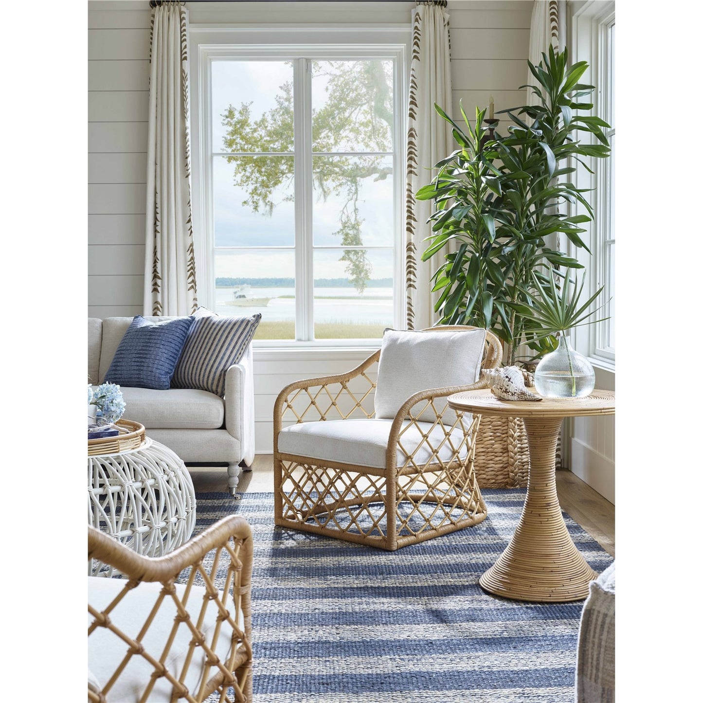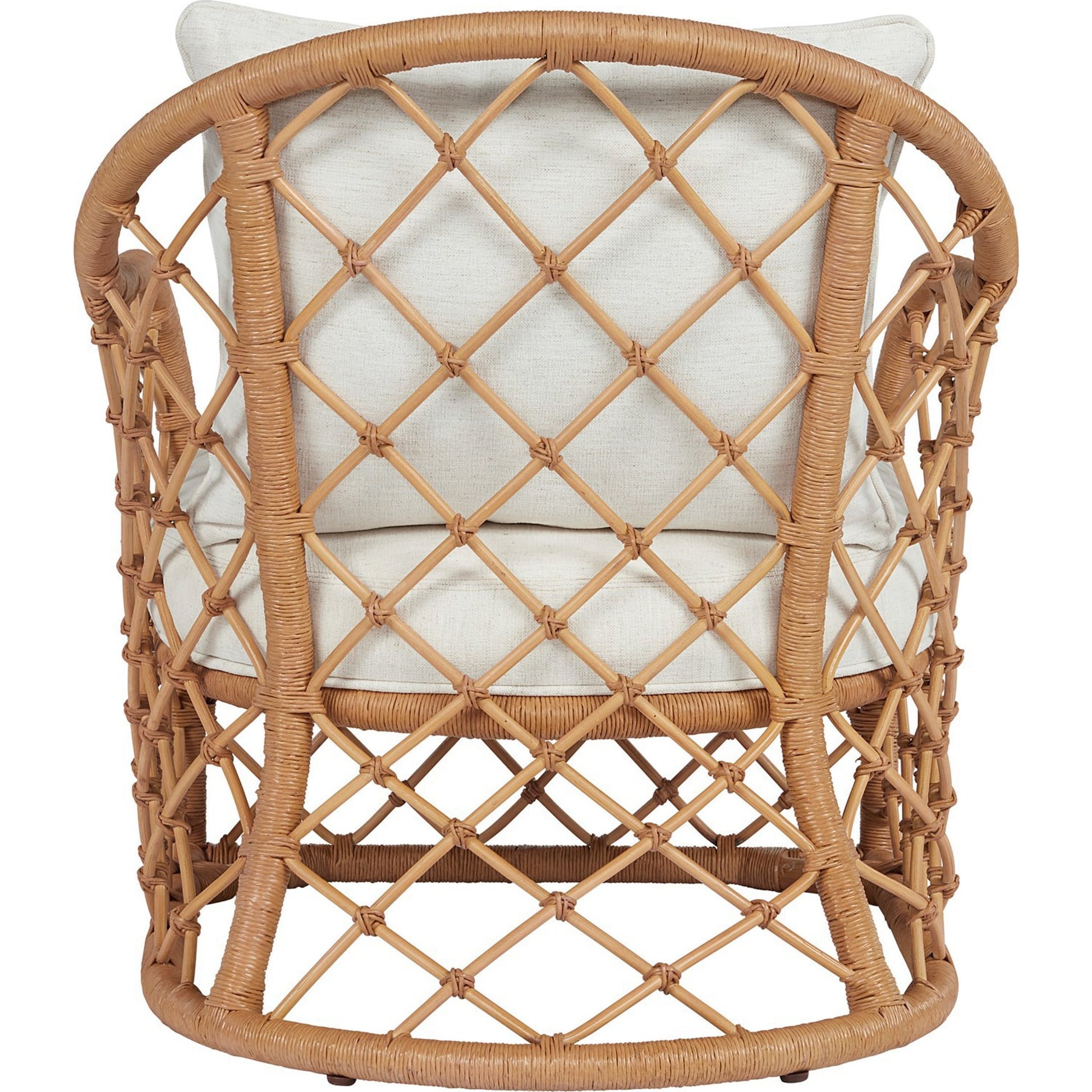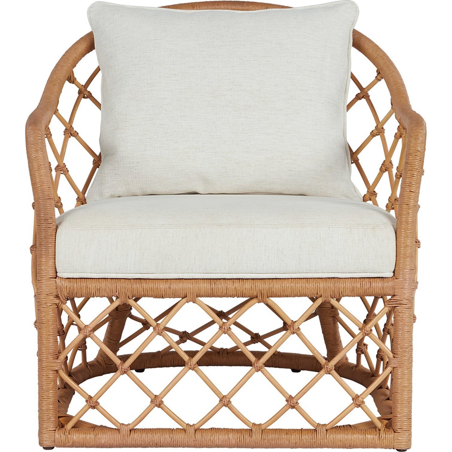 The Miramar Accent Chair features a comfy upholstered seat cradled by an earthy natural rattan body, promising coastal flair and ultimate relaxation.